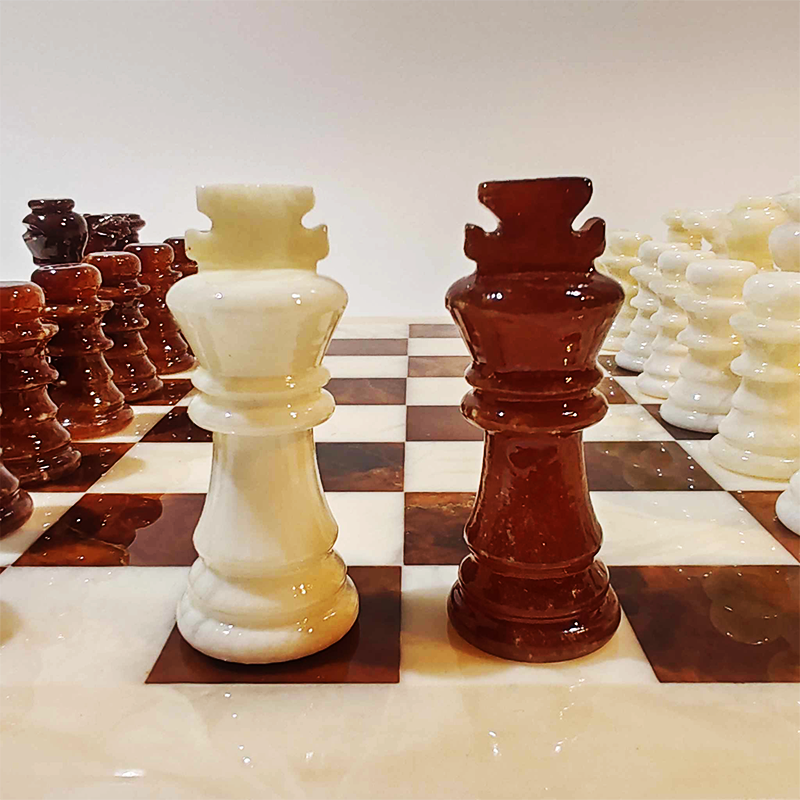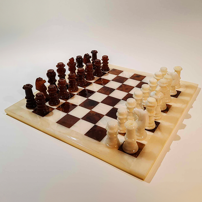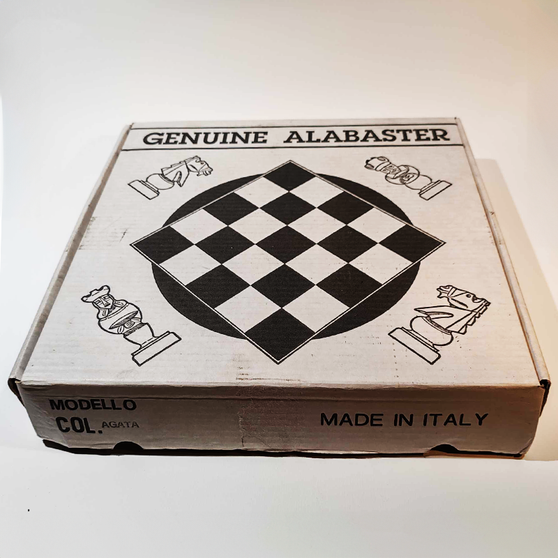 1960s Chess Set in Genuine Hand Carved Alabaster of Volterra - White and Brown with Original Box.