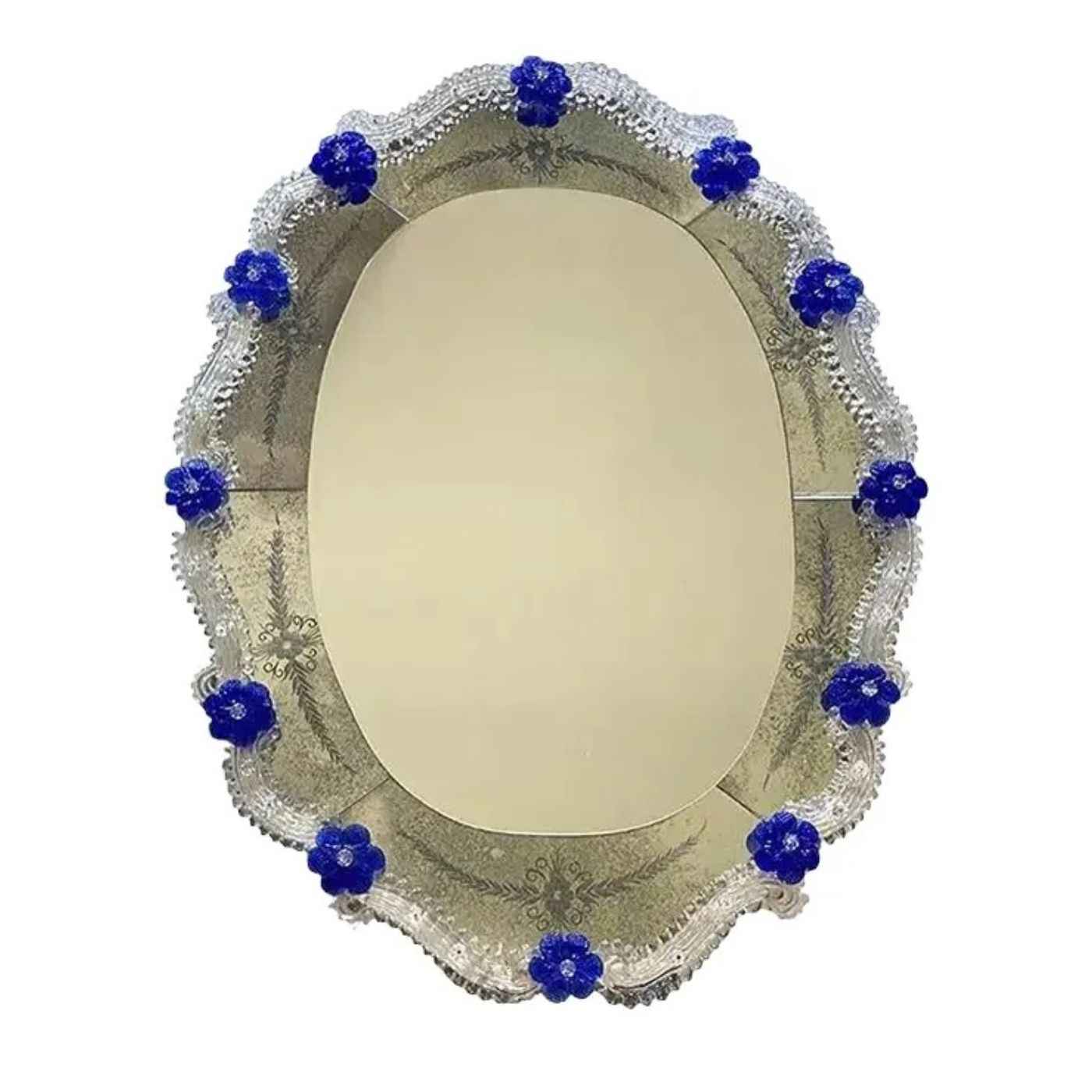 Spectacular oval mirror with Murano glass transparent elements and blue flowers.