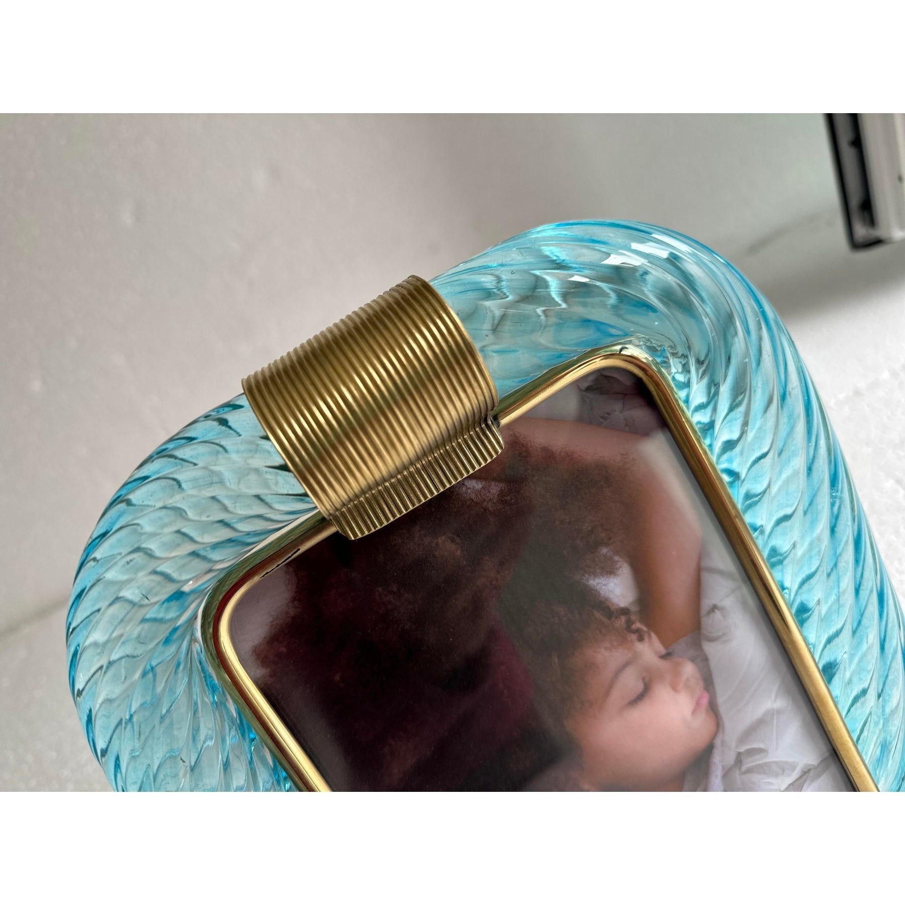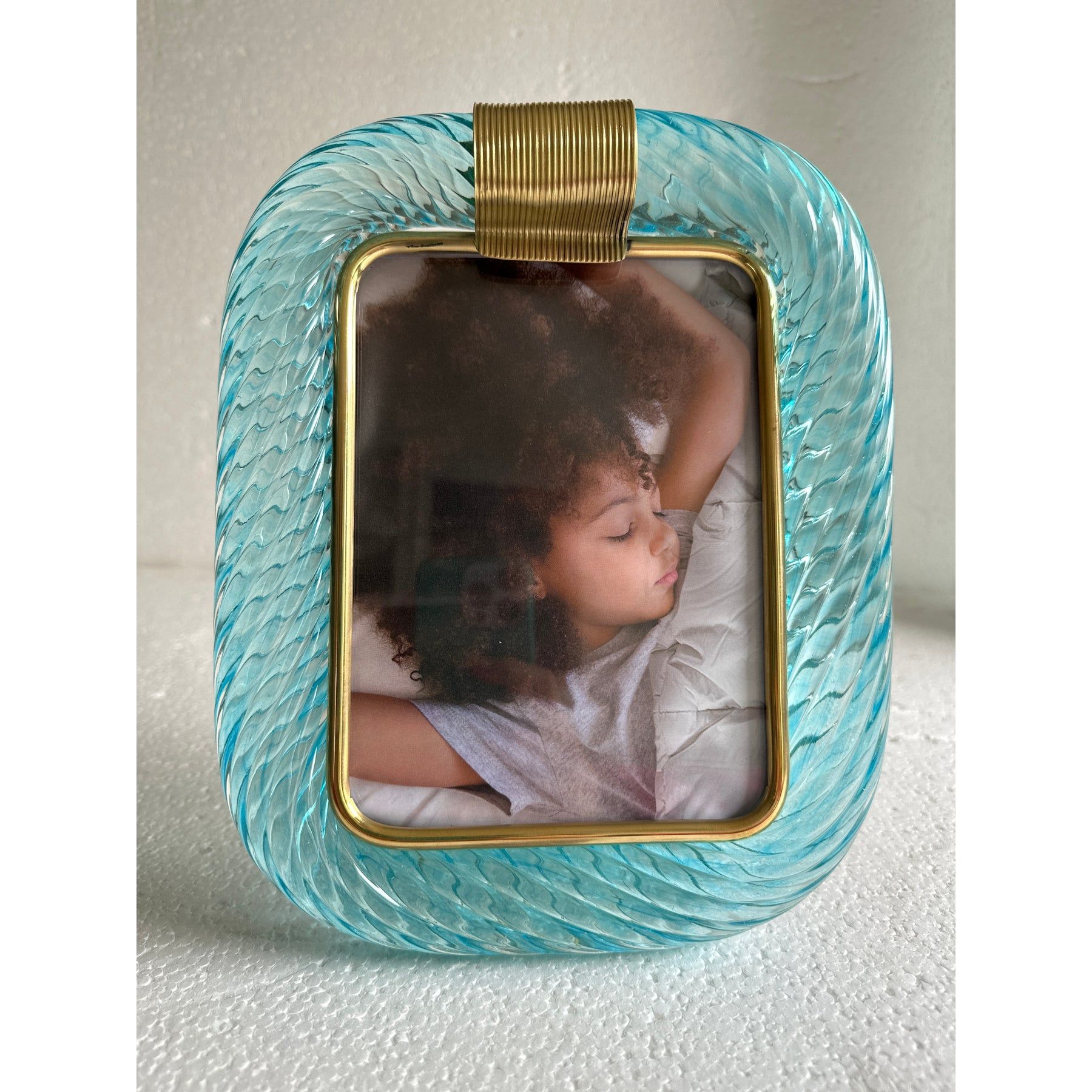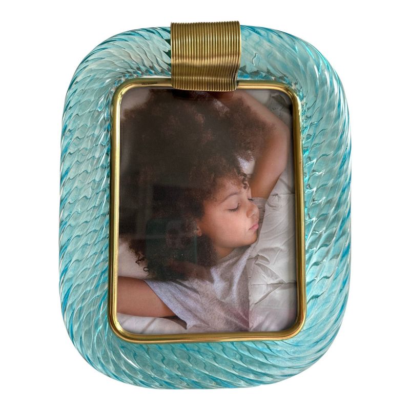 Mid-Century Modern Style Light-Blue "Torchon" Murano Glass Small Picture Frame and Brass in Barovier Style