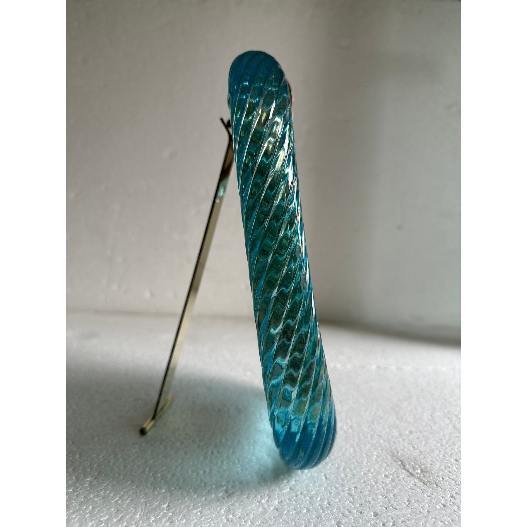Light-blue Murano glass working in traditional tecnique of “torciglione” that give brigtness on glass.