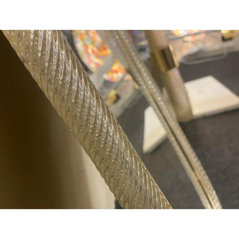 Pair of Italian Venetian Murano Glass wall mirrors in elegant gold leaf with “Torciglione” Venetian twisted design and solid brass detailing. Designed for wall display in mid-century modern or contemporary interiors. Each mirror is finished with high-quality reflective glass and handcrafted Murano glass frame.