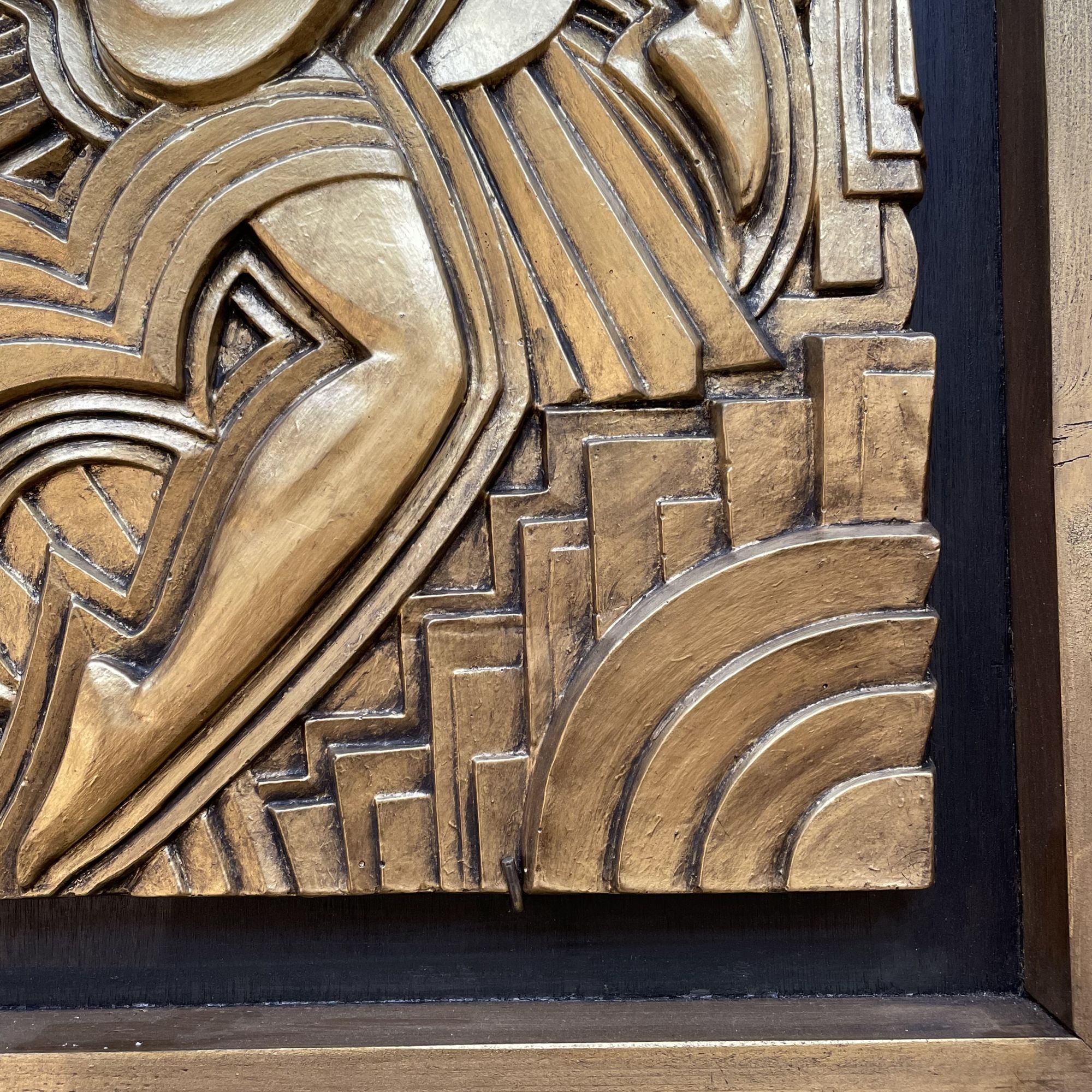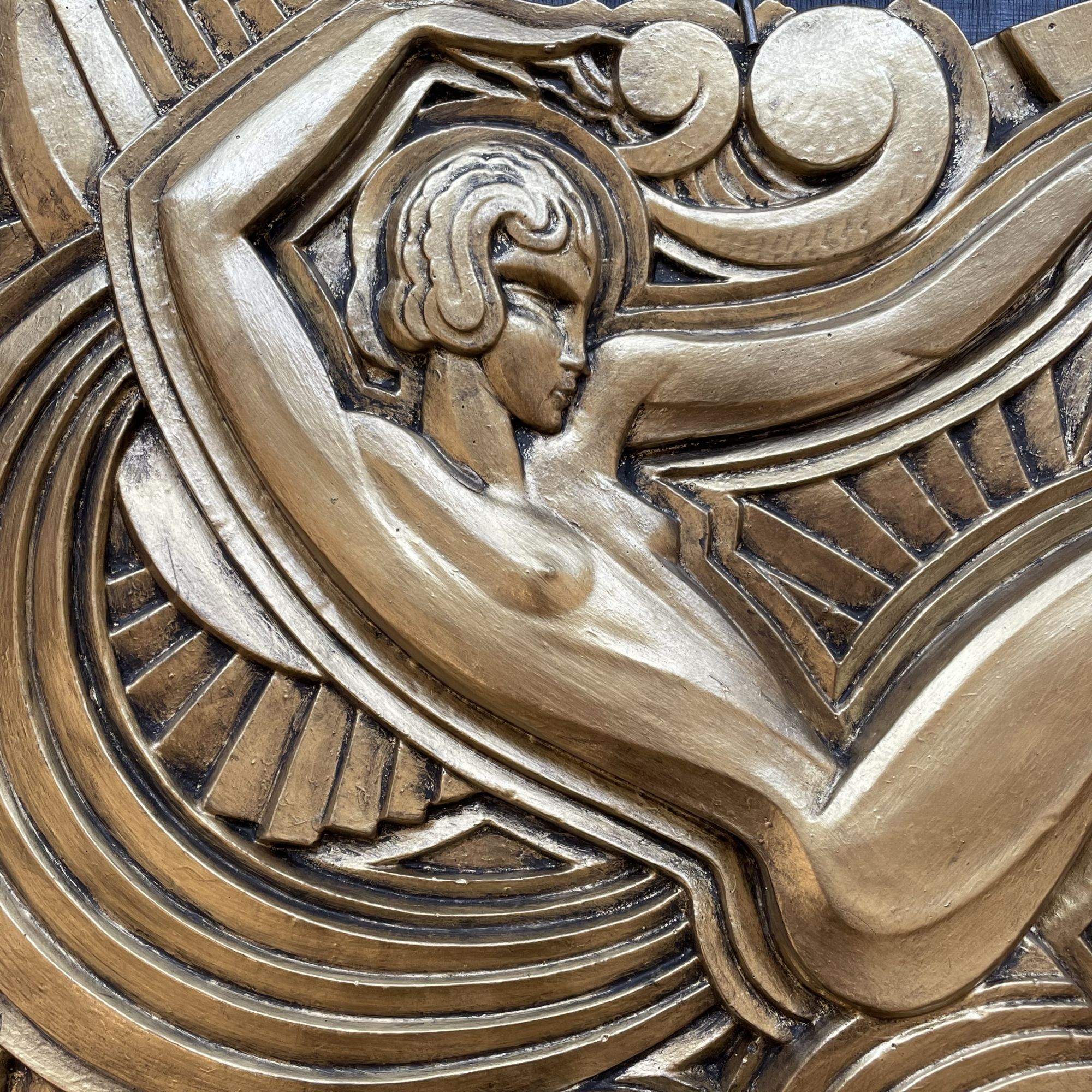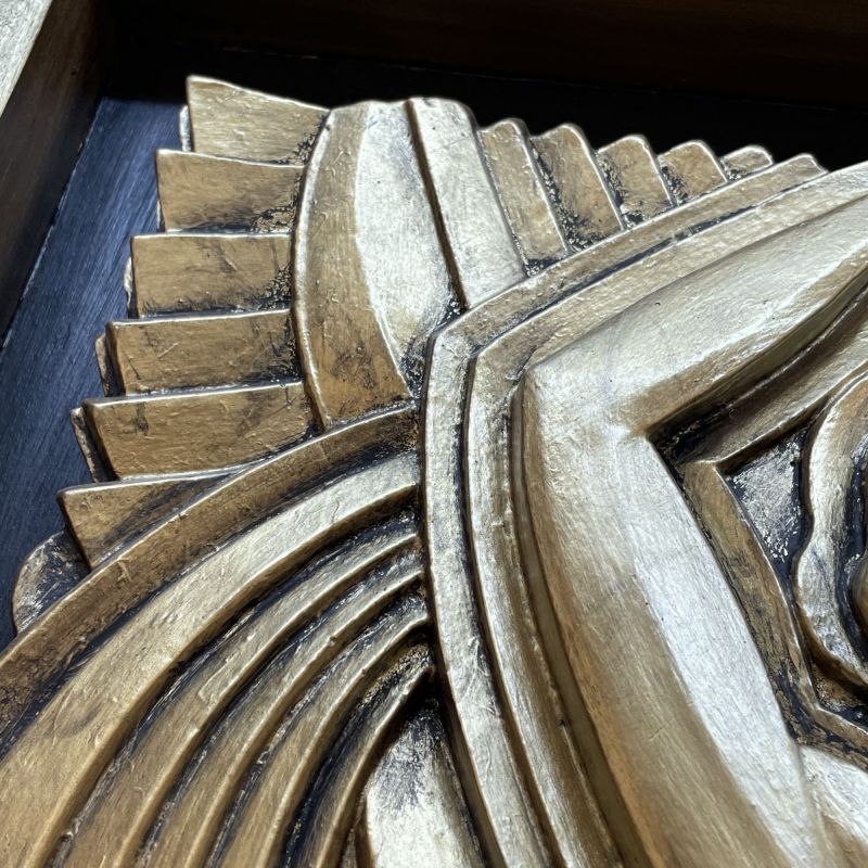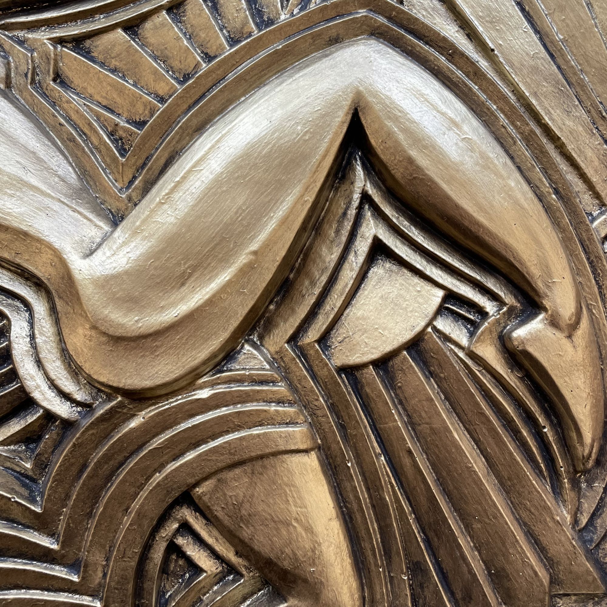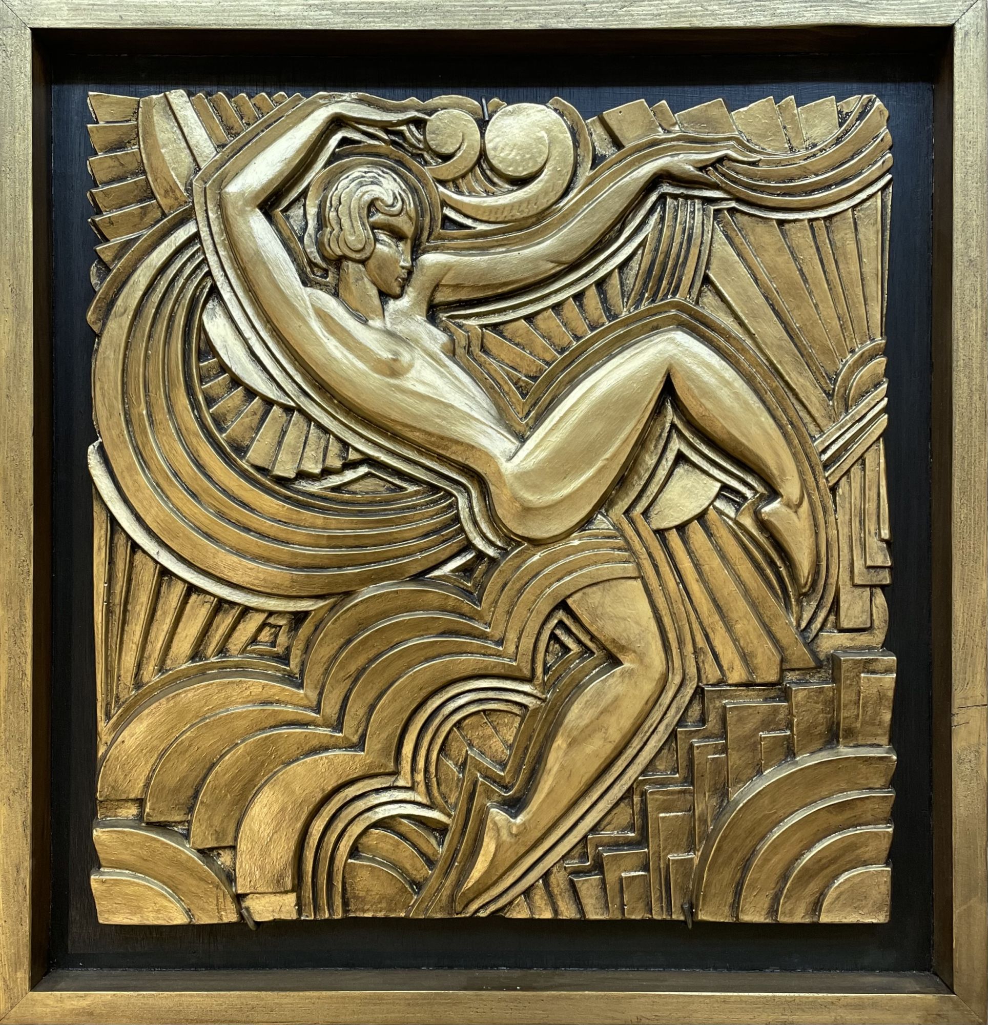 Maurice Picaud, known as Pico (1900-1977), was a French architect, decorator, and painter trained at the École Boulle. A collaborator of Jacques-Émile RUHLMANN, he also made a name for himself as a press caricaturist. Among his works rooted in the Art Deco movement, the most famous is the façade of the Folies Bergère in Paris (1926), depicting the Russian dancer Lila Nikolska. He also created murals for the Montdidier town hall in the 1930s. “Nude dancer” Reduced version of the Folies Bergère façade. Gilded stucco bas-relief. Blackened wood. Posthumous edition. Dimensions H : 59 cm ; W : 56,5 cm ; P : 4,5 cm H : 23.2 in ; W : 22.2 in ; D : 1.8 in