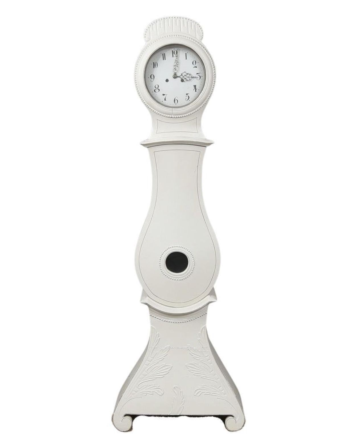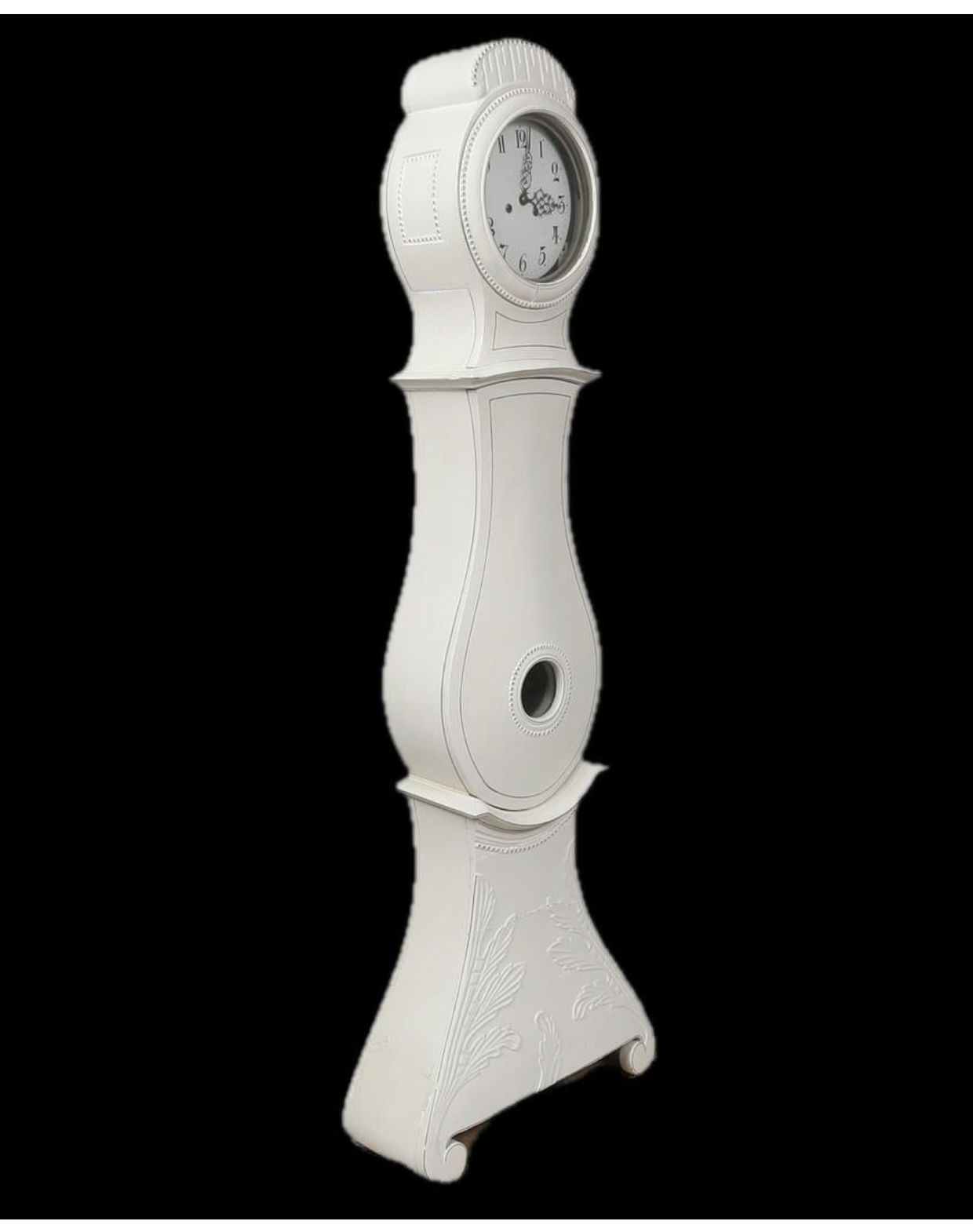 203cm v rare early 1800s antique Swedish mora clock with finely carved detail on the body and hood and detailed face in a later white painted finish.
