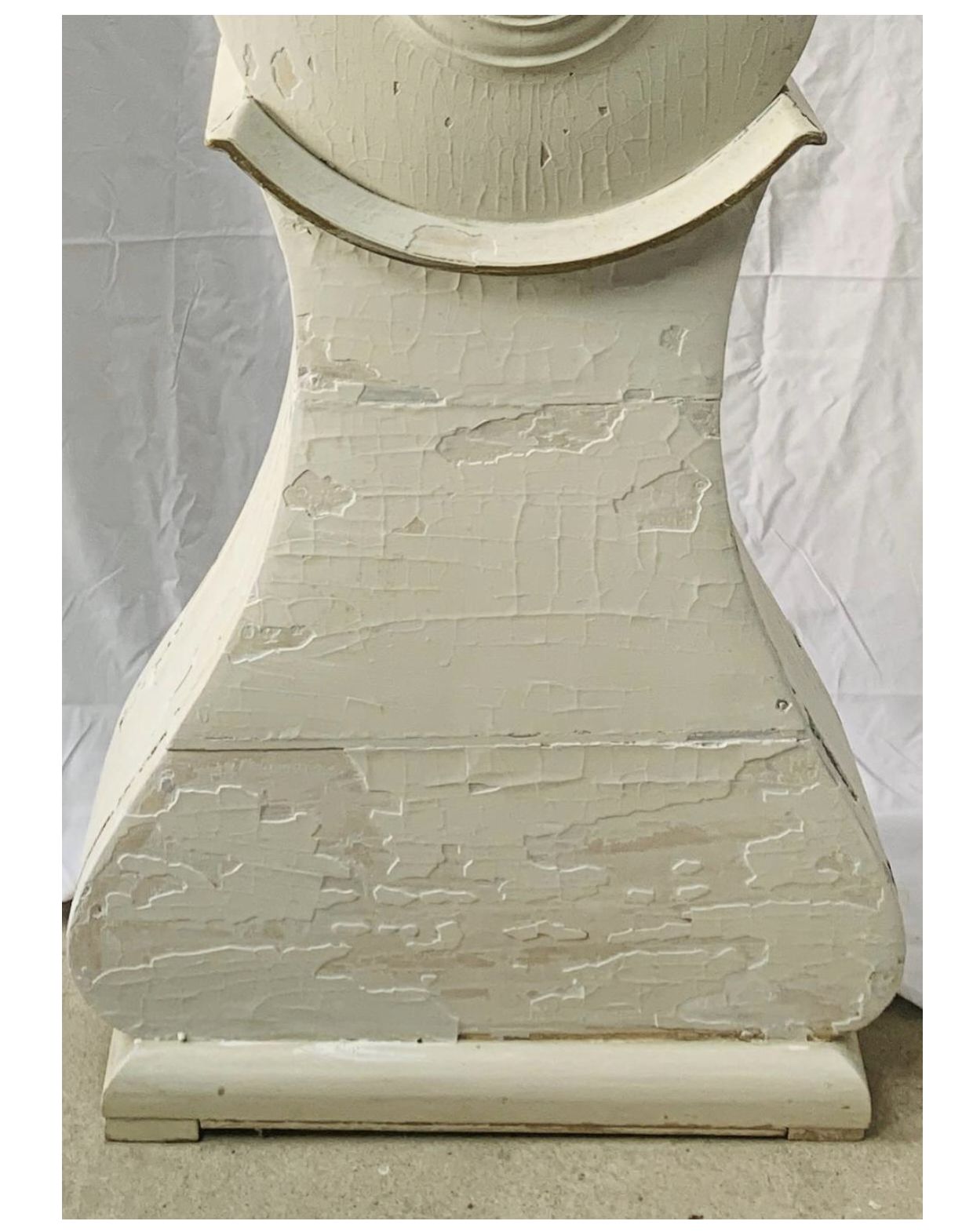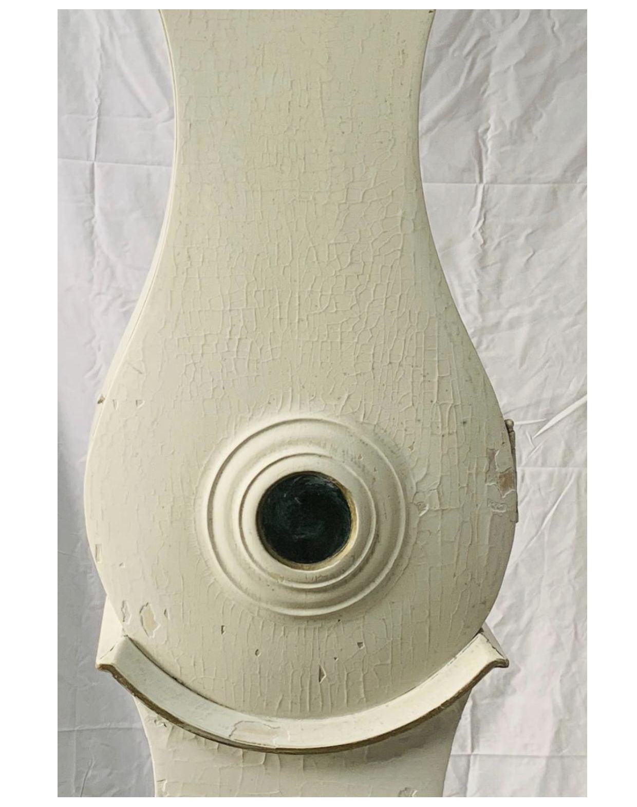 Early 1800s antique Swedish mora clock in white paint with Classic Fryksdal inspired carved detailing on the body and hood. This grandfather mora clock is extremely unusual in its decoration and carved detailing. It has lovely wear on teh base showing its history.