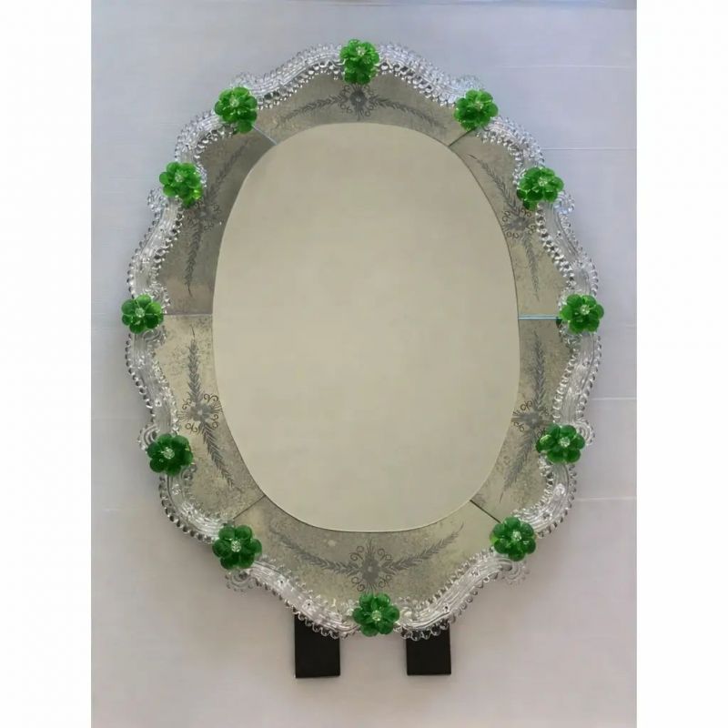 Spectacular oval mirror with Murano glass transparent elements and green flowers.