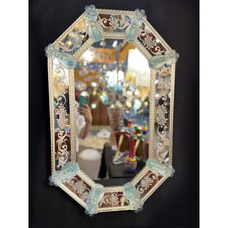 Venetian Octagonal Wall Mirror Hand-Carved in Murano Glass With Ligh-Blue Flowers