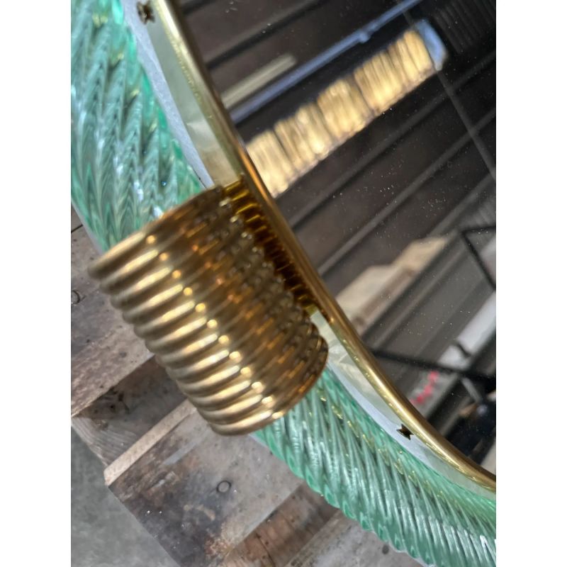 Scenographic wall mirror in brass elements with green-wather Murano glass working in “torciglione”. a traditional tecnique of masters of Murano.