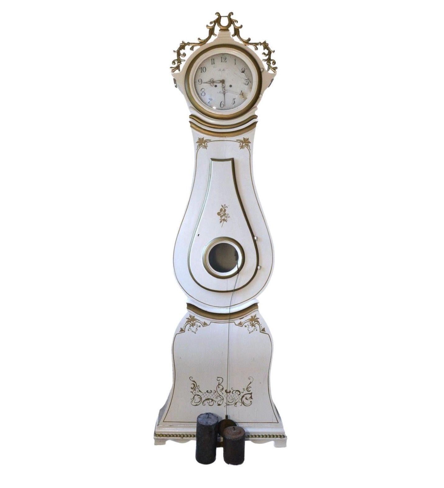 White Mora Clock Swedish Early 1800s Antique Gold Carved Crown