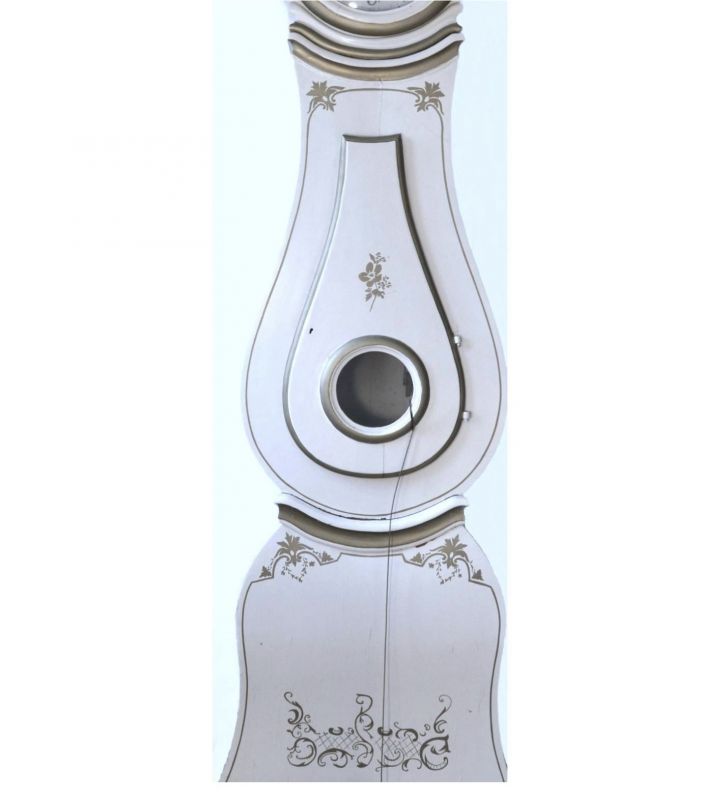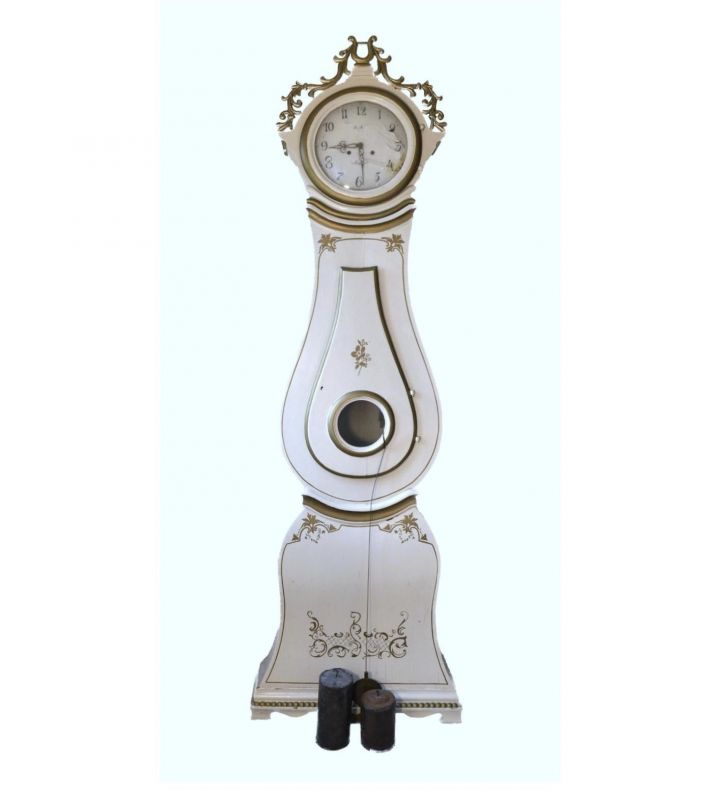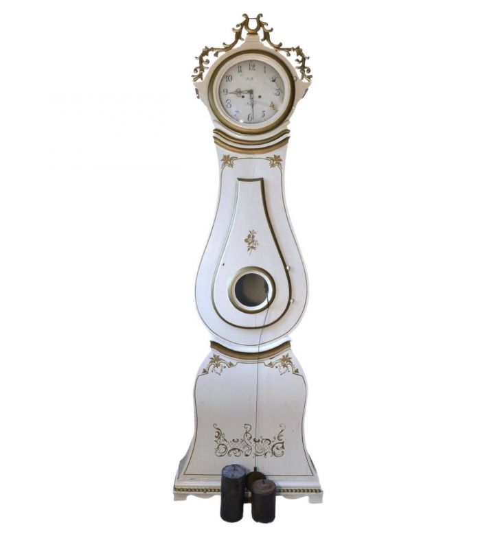 Antique Swedish Mora clock early 1800s in lovely white paint finish with a delicate shape body with lots of gold detailing and intricately carved and detailed hood in generally good condition. Measures: 215 cm.