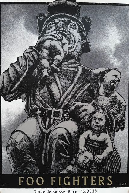 Official Foo Fighters concert poster for Bern (2018), designed by Tommy Davidson-Hawley. This is a hand-pulled 4-colour screenprint (artist’s proof), making it a highly collectible piece with added rarity and artistic value.