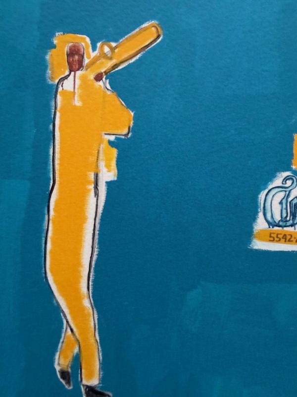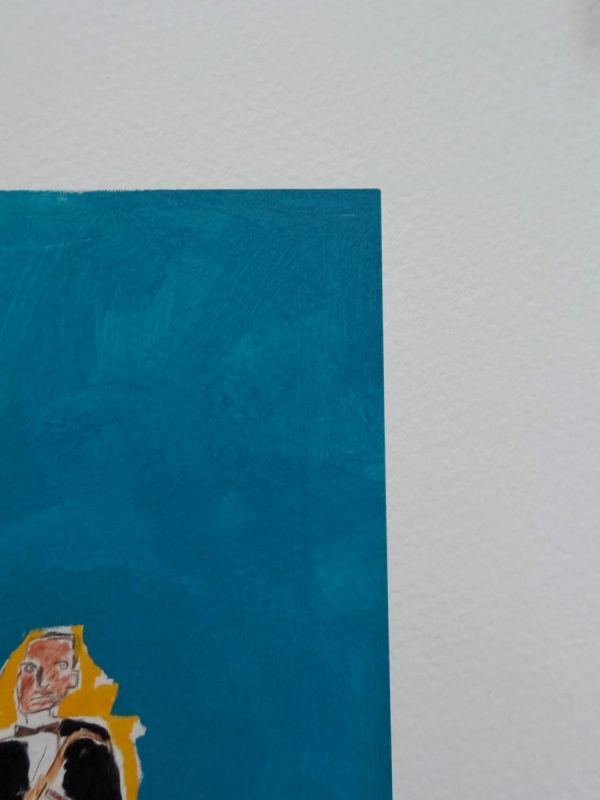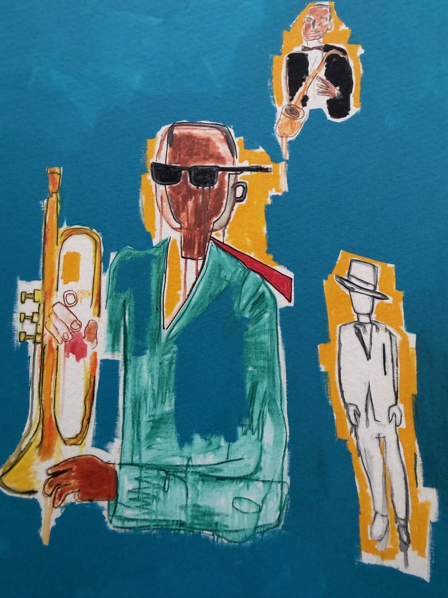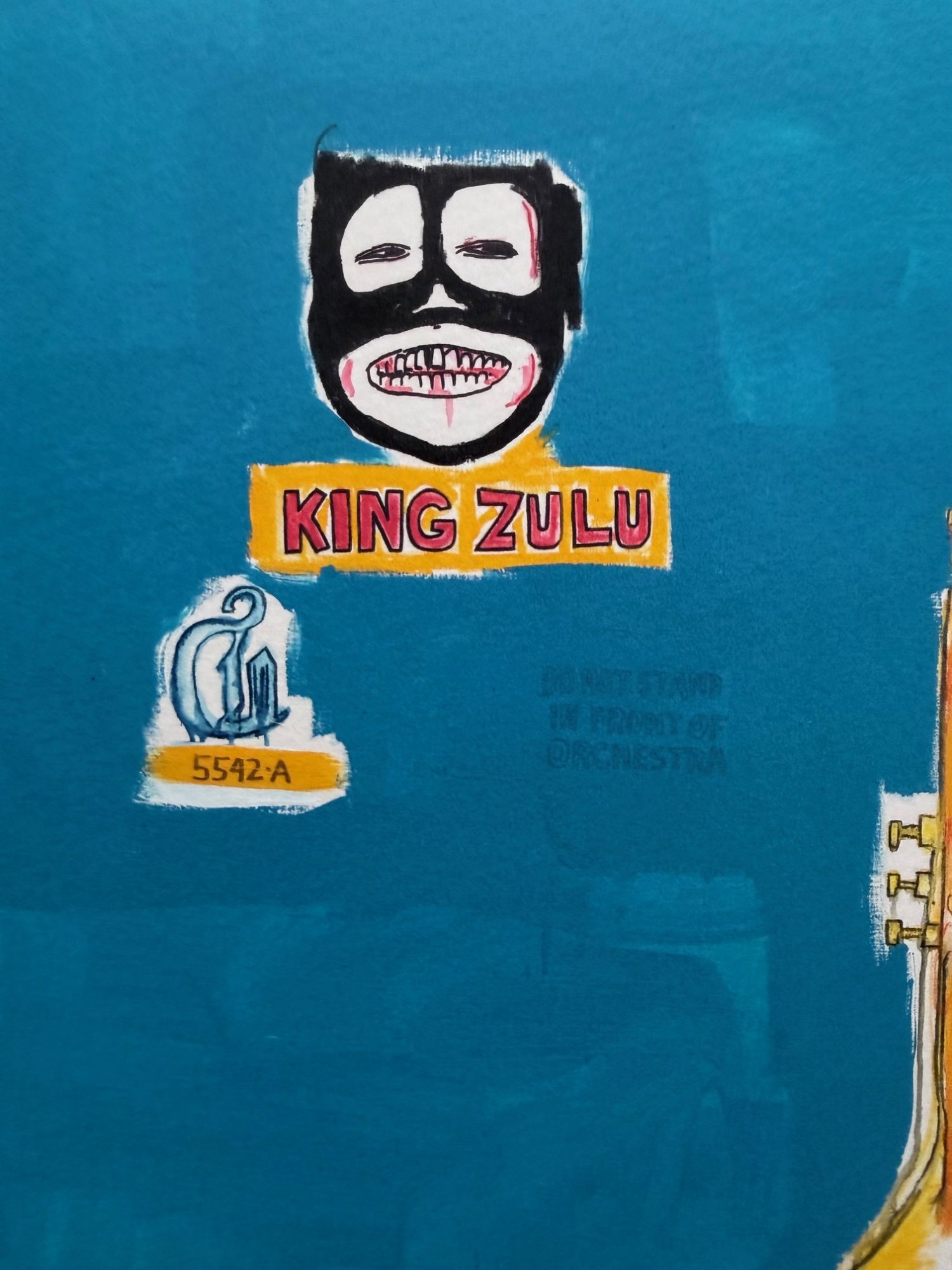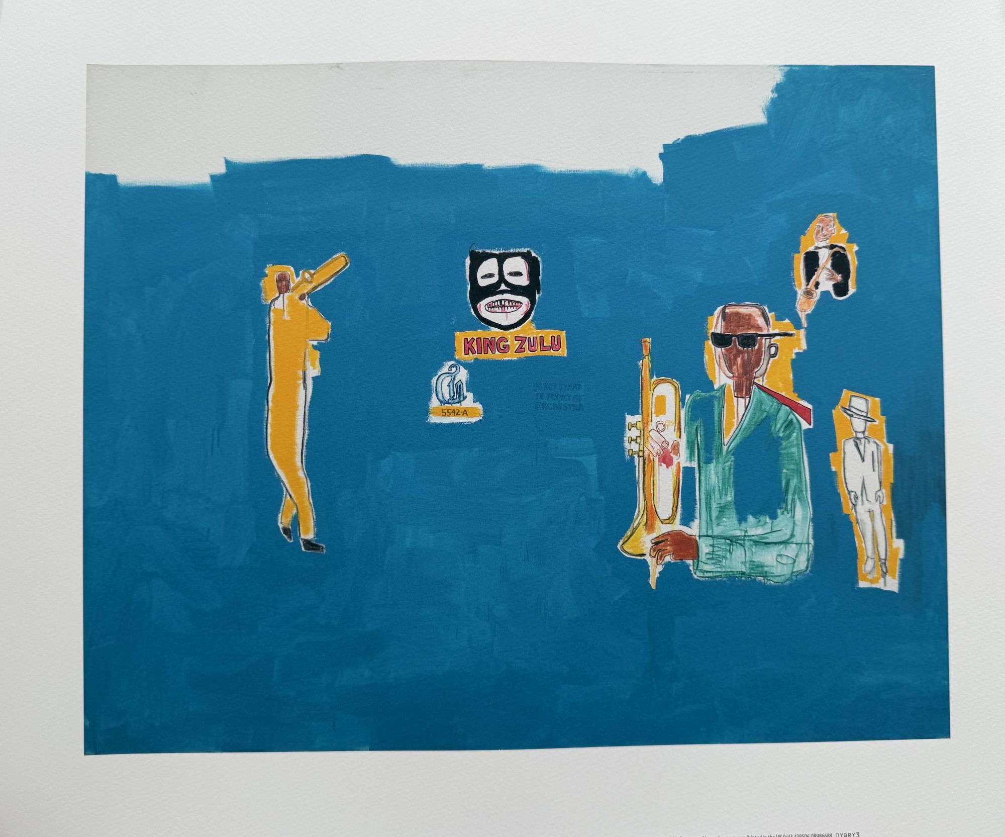 King Zulu depicts four jazz musicians in a blue space, with Louis Armstrong at the center, referencing his role as “King of the Zulus” at the 1949 New Orleans Carnival. The composition reflects Basquiat’s nuanced engagement with jazz, culture, and history.