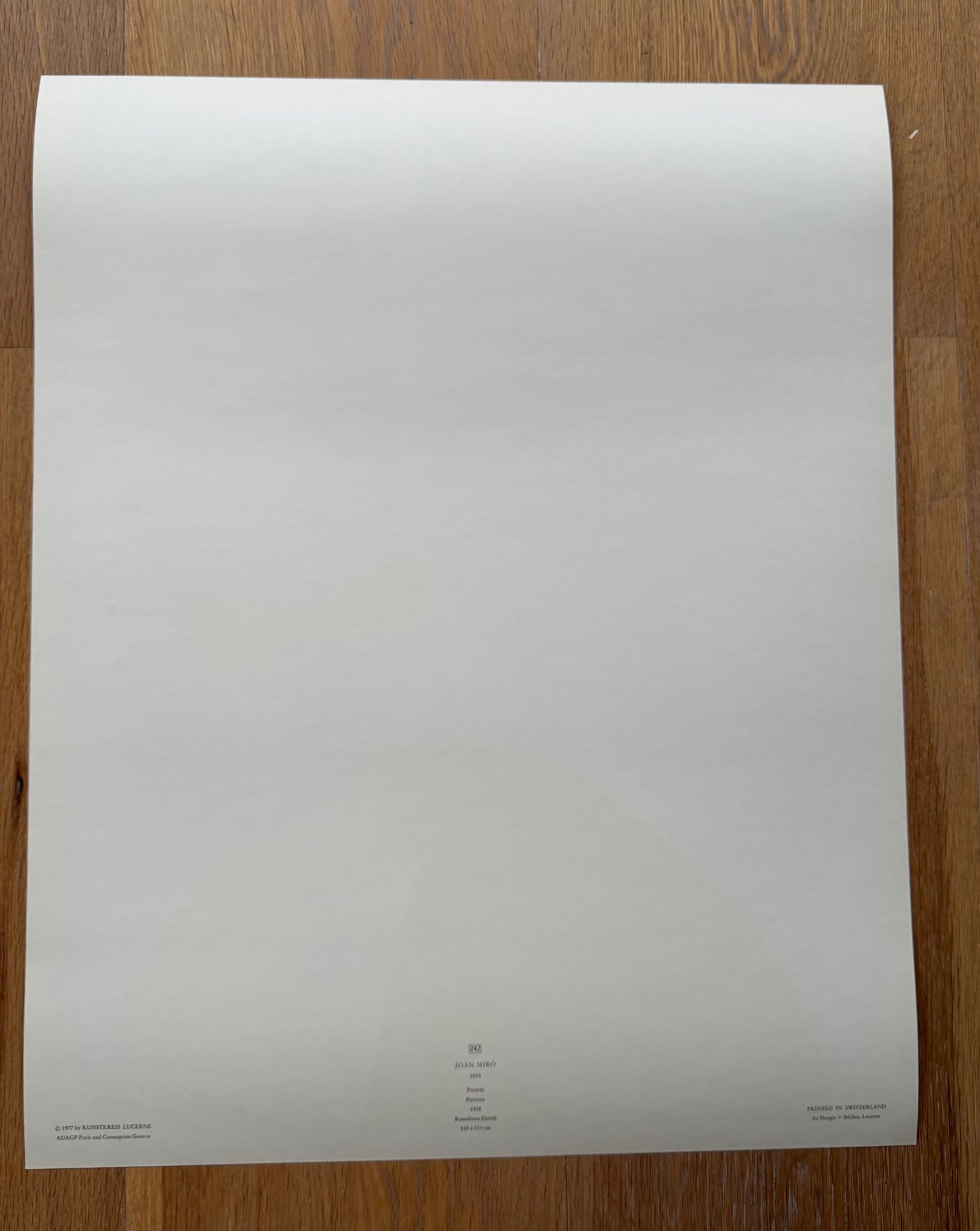 Vintage 1977 Swiss-printed poster featuring Joan Miró’s Portrait (1938), with copyright by Kunstkreis Lucerne, ADAGP Paris, and Cosmopress Geneva. A vibrant example of Miró’s imaginative style, well preserved and ready for secure delivery