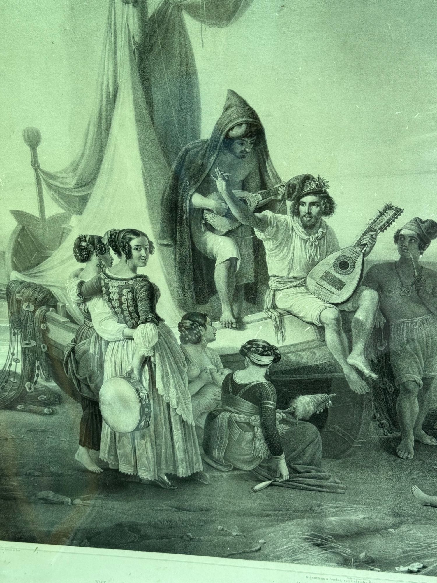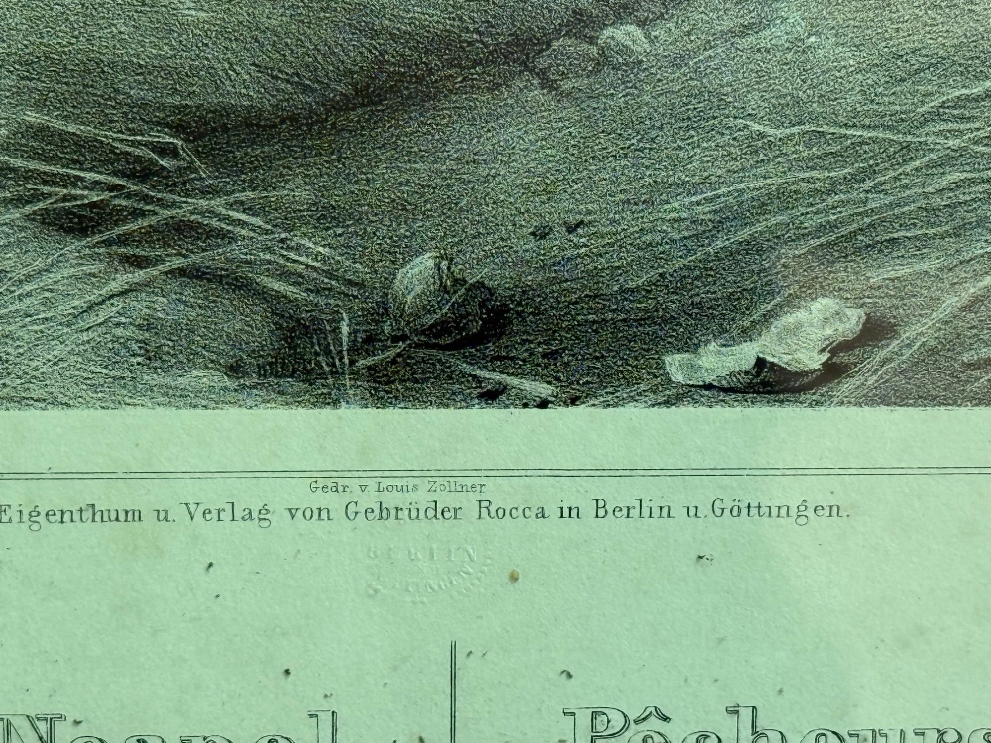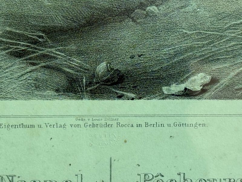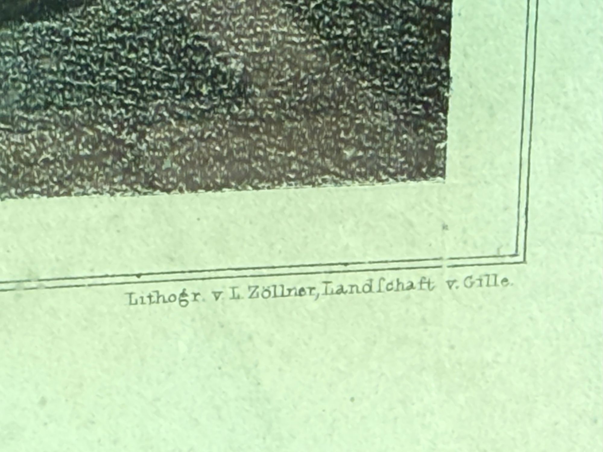 Lithograph by Louis Zöllner, Landschaft from the original art by Johann Adolf Gille, 1806–1879. Publisher: Eigenthum u. Verlag von Gebrüder Rocca in Berlin u. Göttingen. Framed great authentic condition.