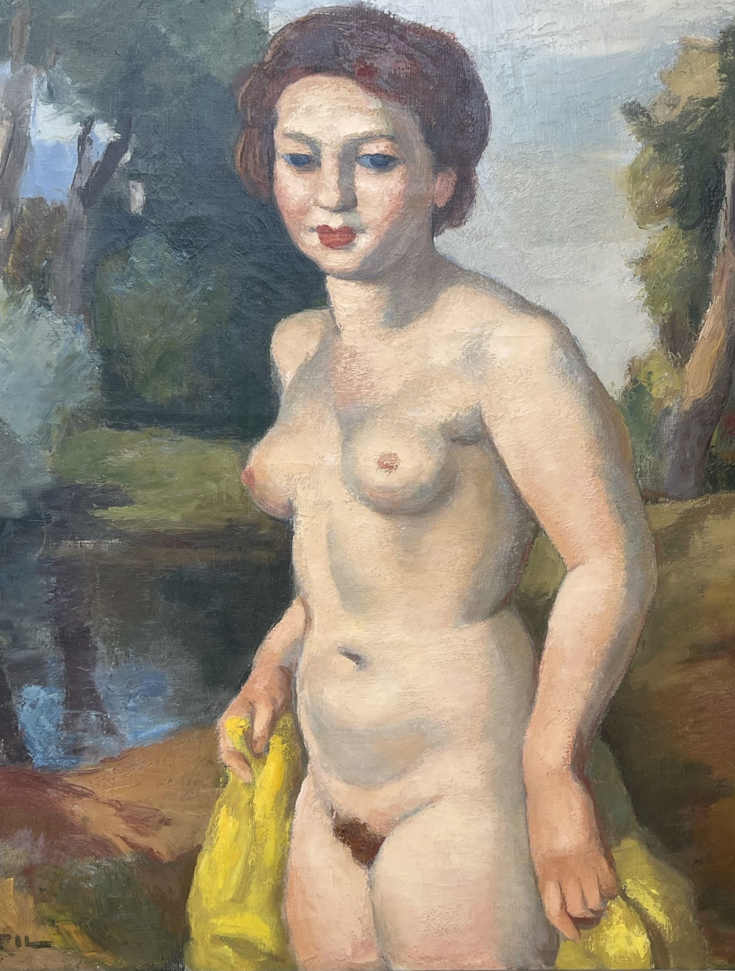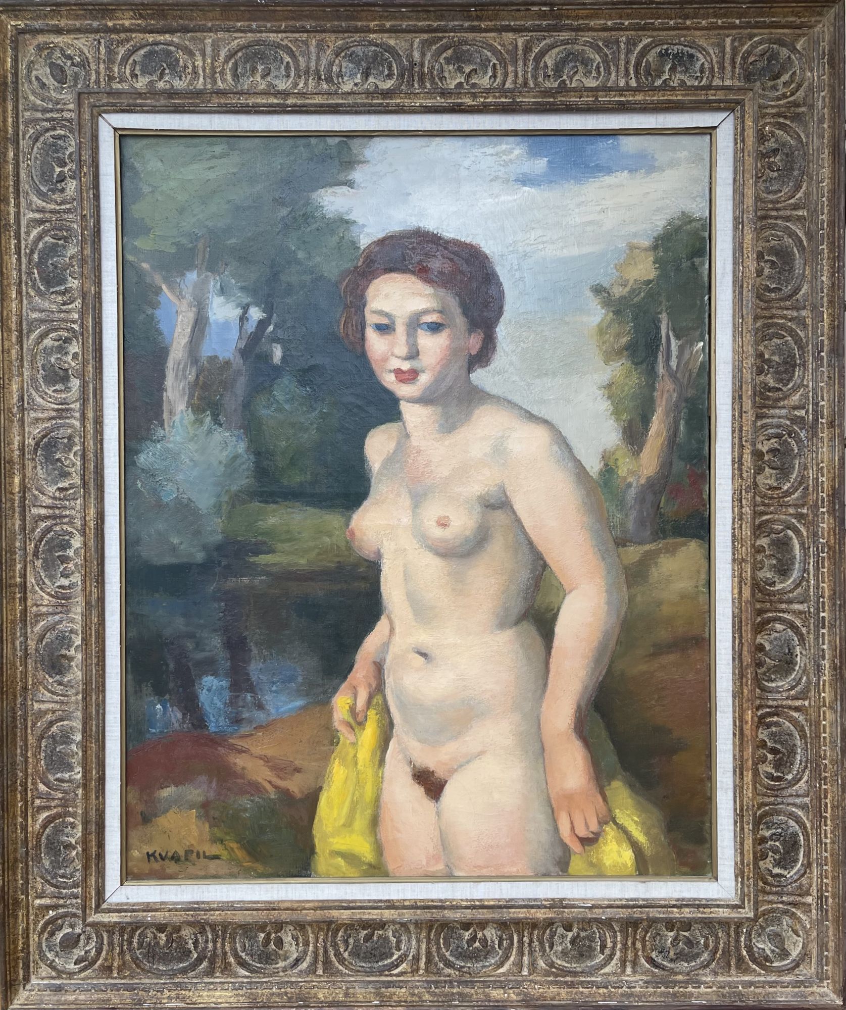 "Nude woman holding a yellow drape in a landscape", Charles Kvapil (1884-1957)