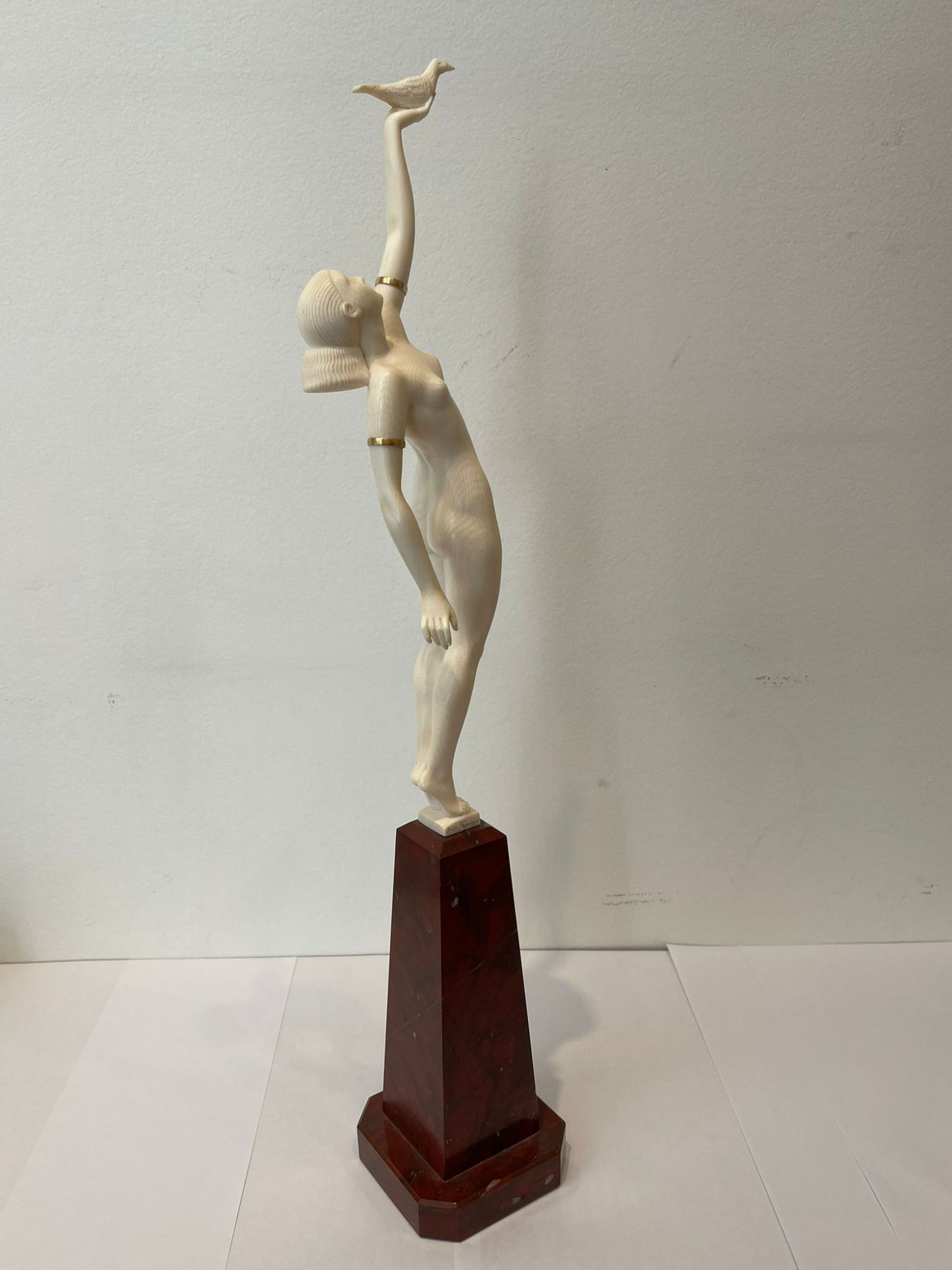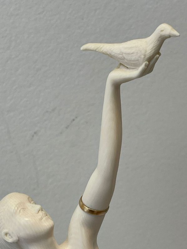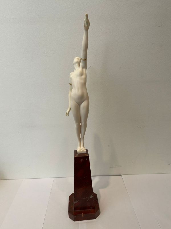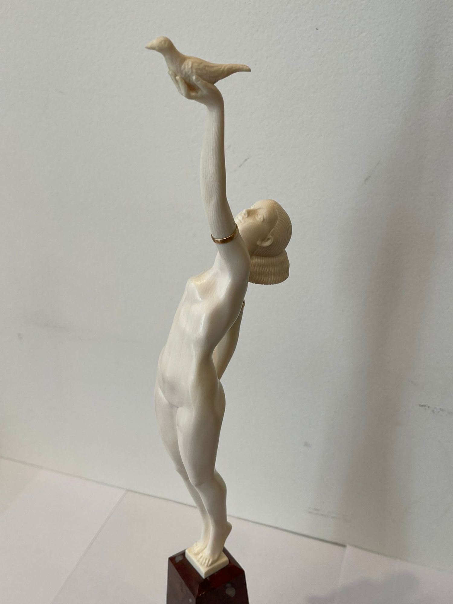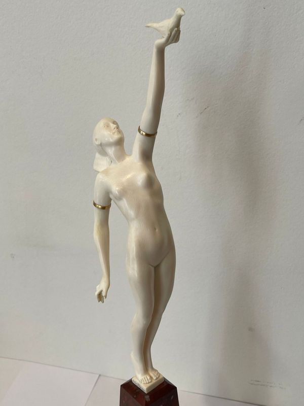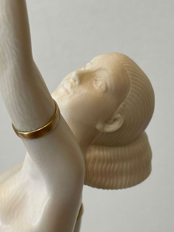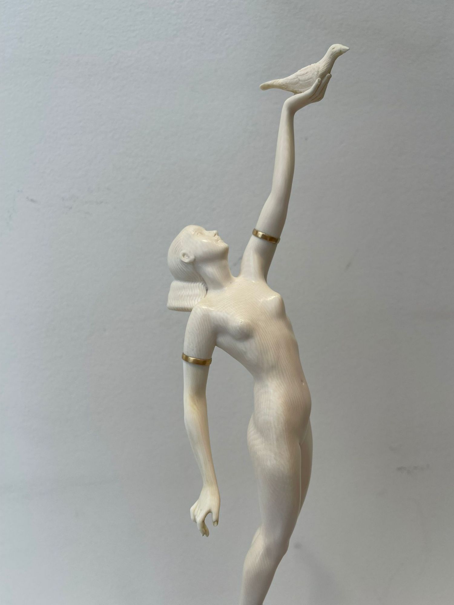 Sculpture. Epreuve en Ivoire finement sculpté ; les bracelets de bras en laiton doré.