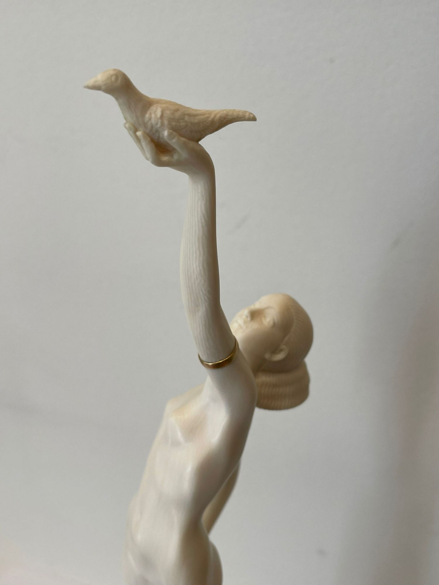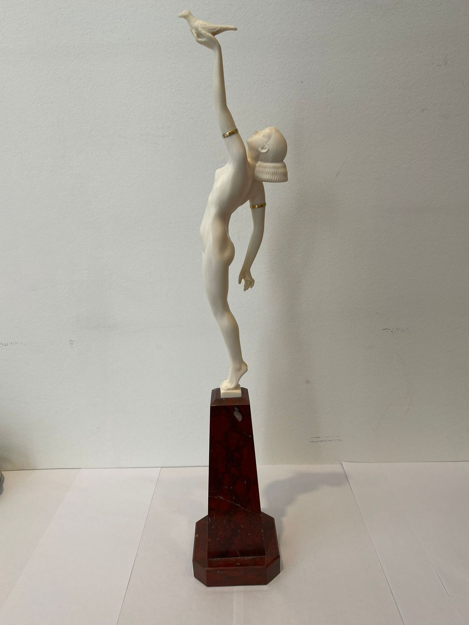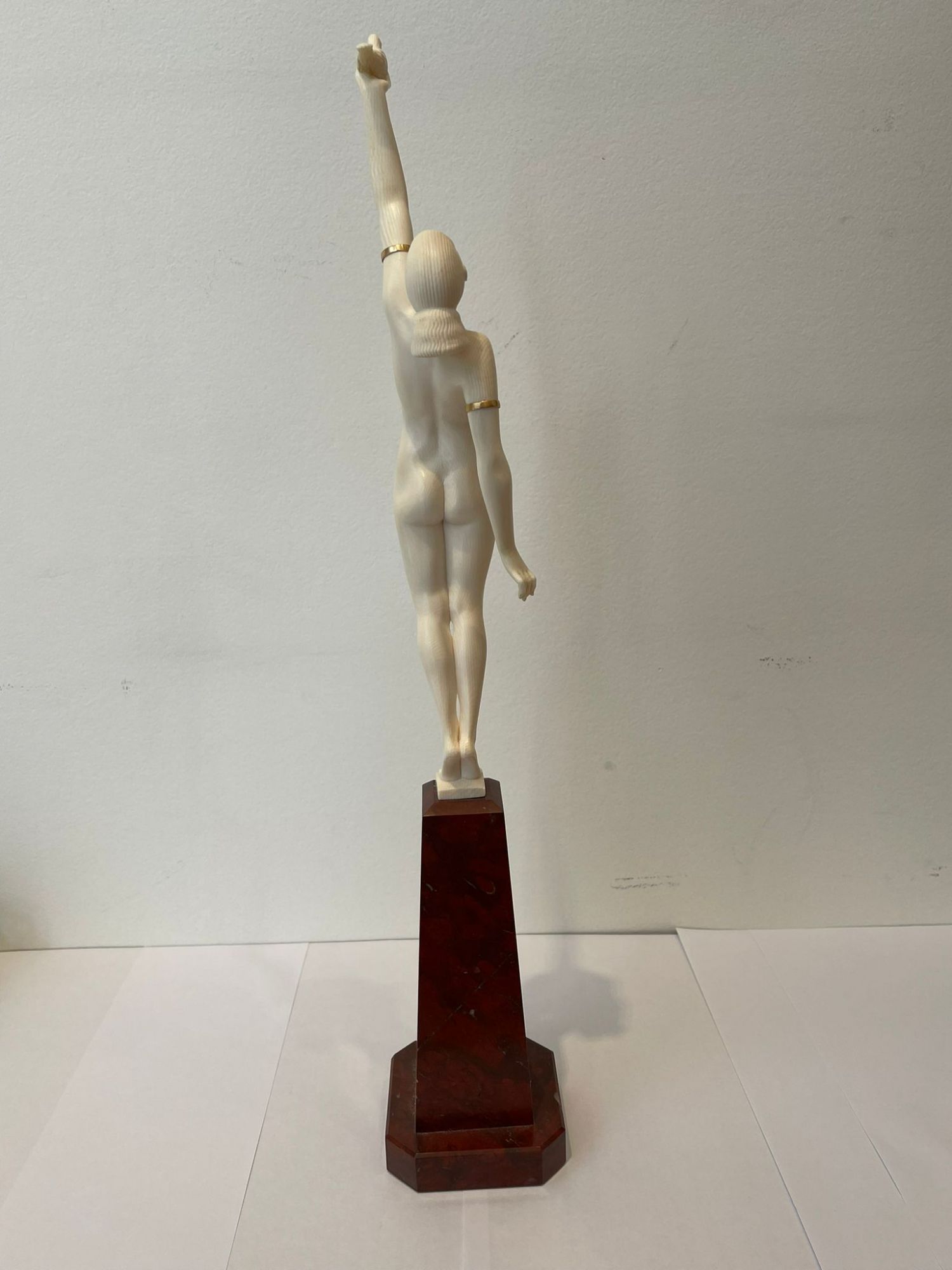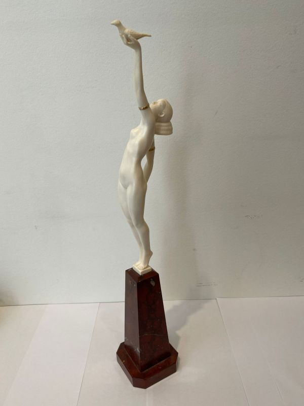 Sculpture. Epreuve en Ivoire finement sculpté ; les bracelets de bras en laiton doré.
