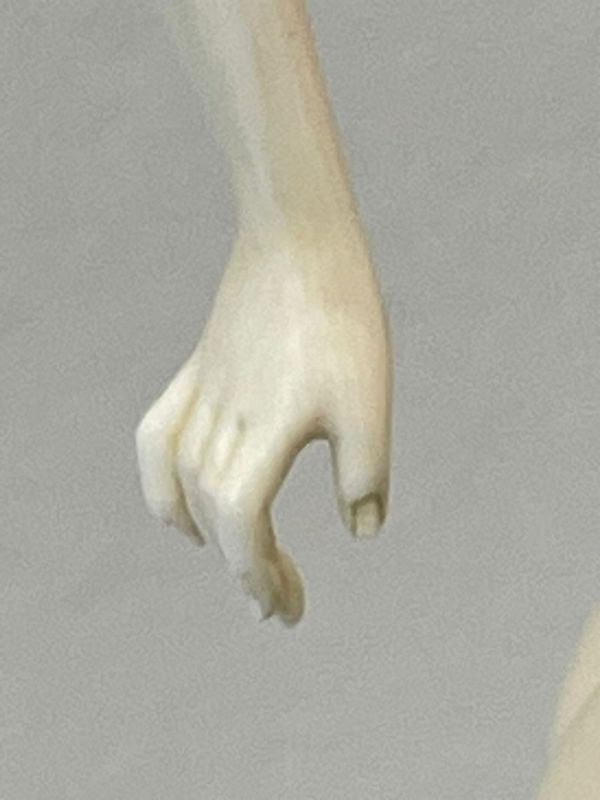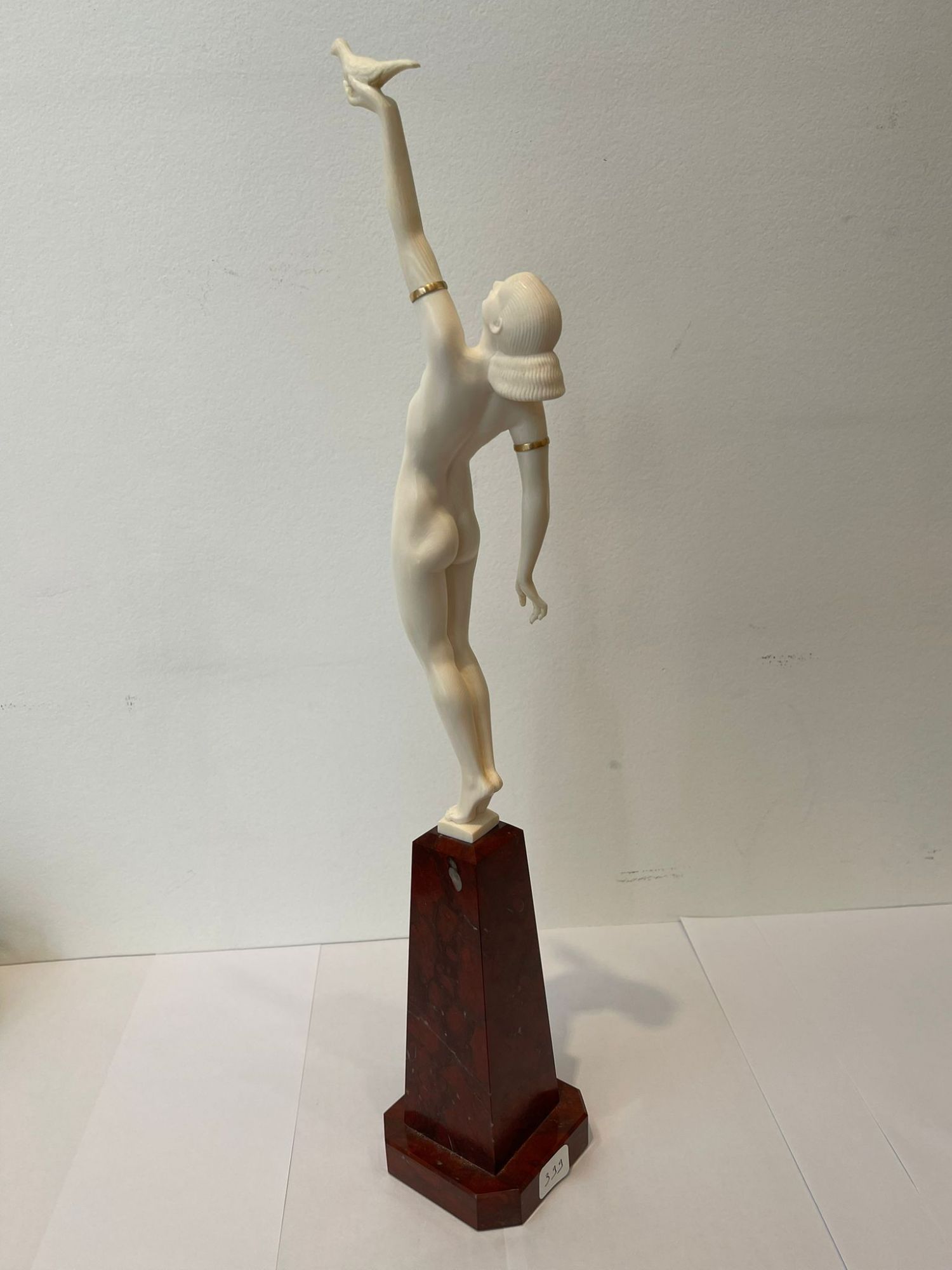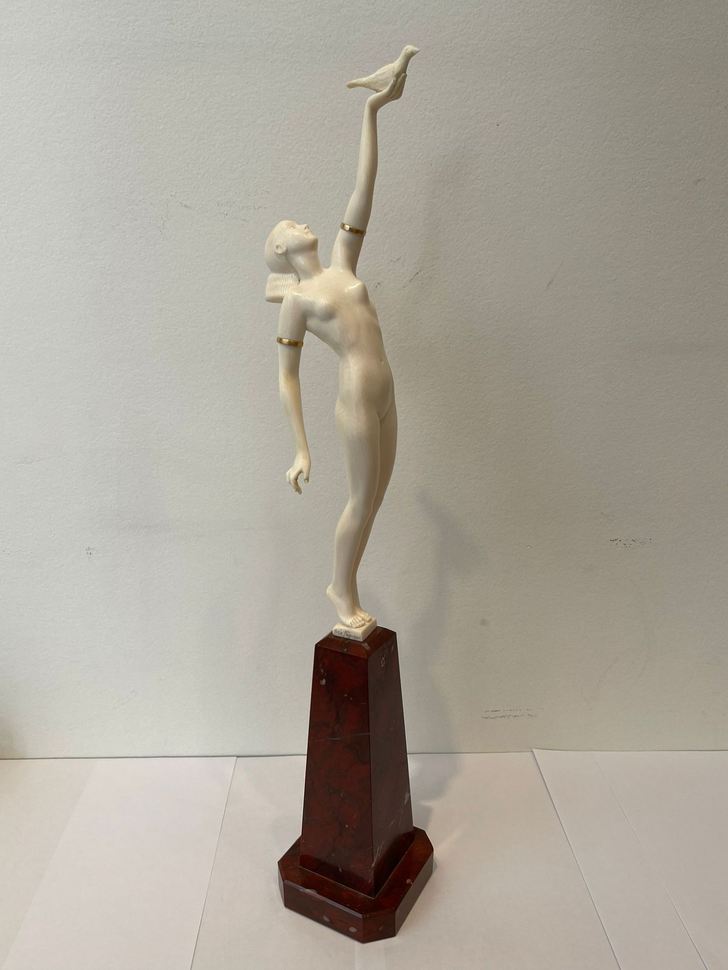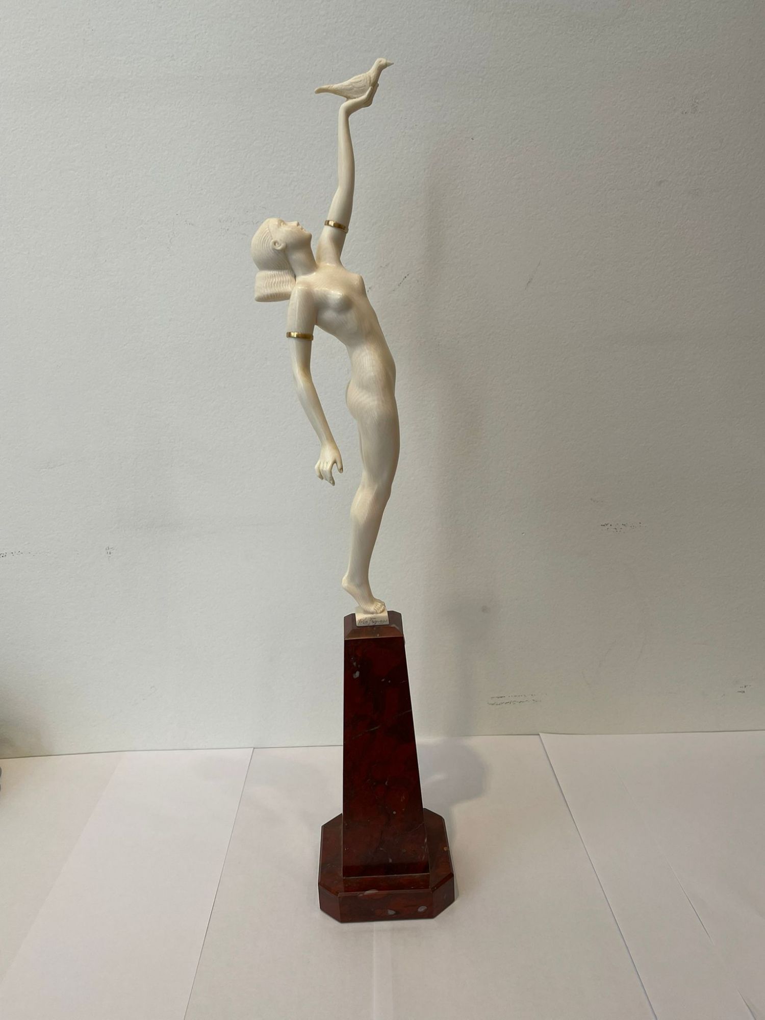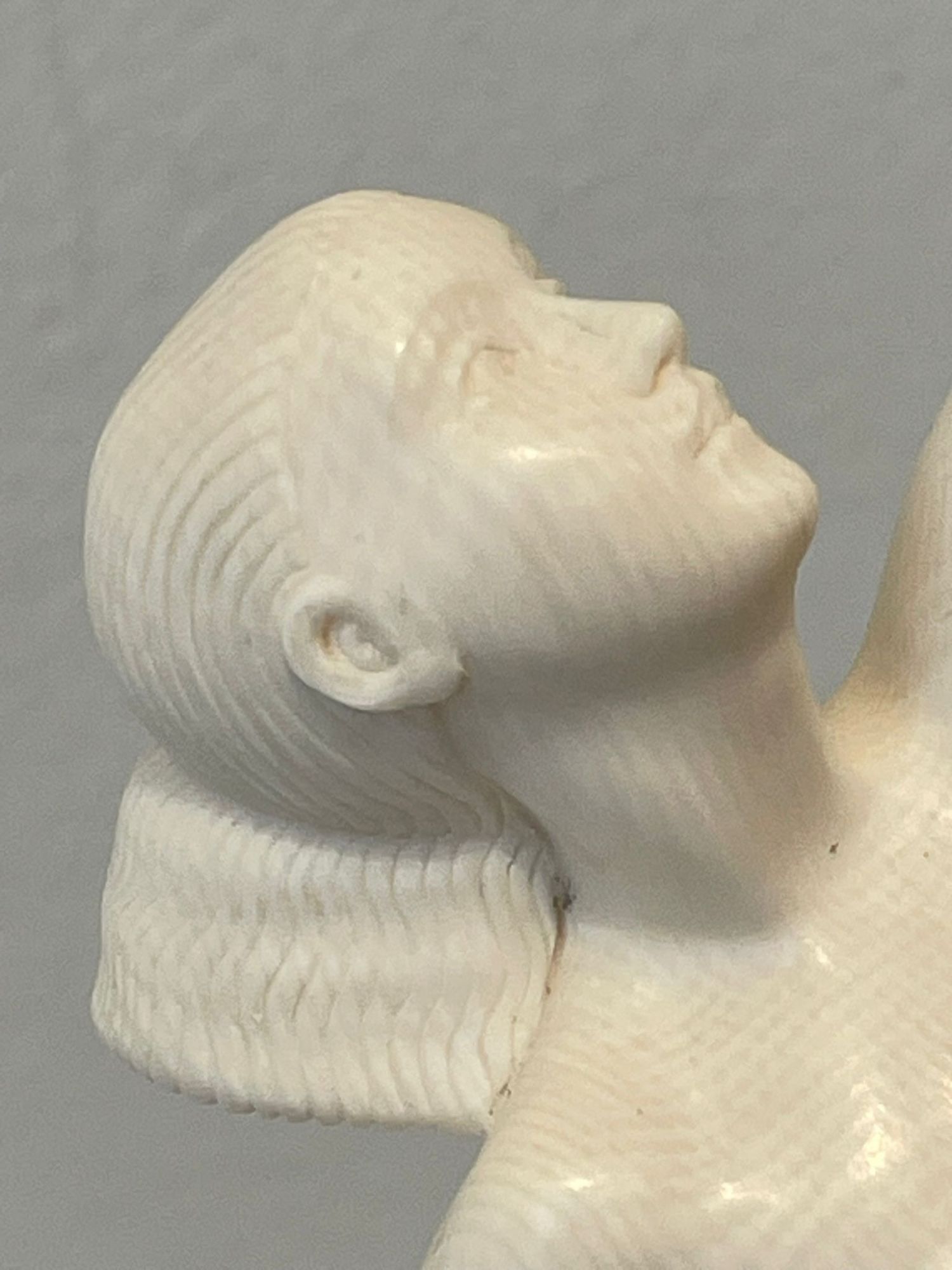 Sculpture. Epreuve en Ivoire finement sculpté ; les bracelets de bras en laiton doré.