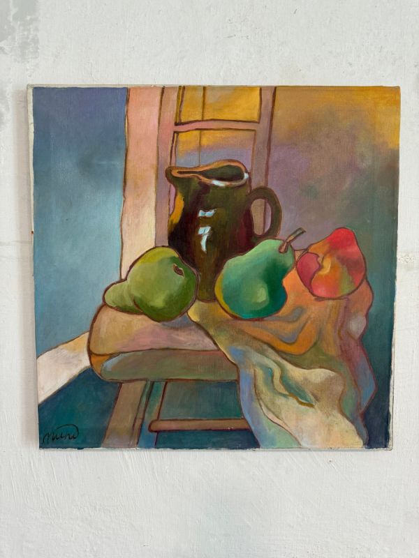 Thomas Muhl (1934-2020): Still life with pitcher peaches on chair