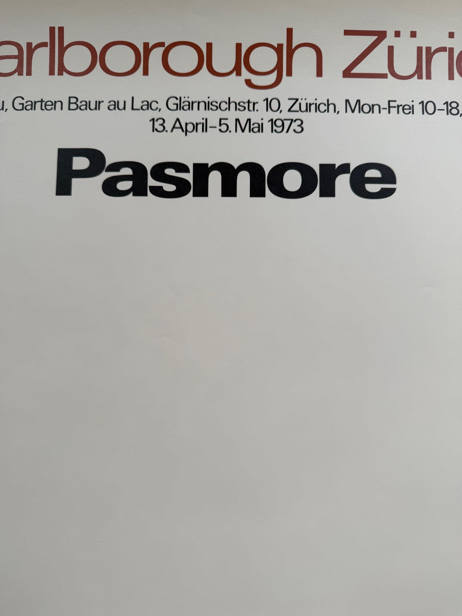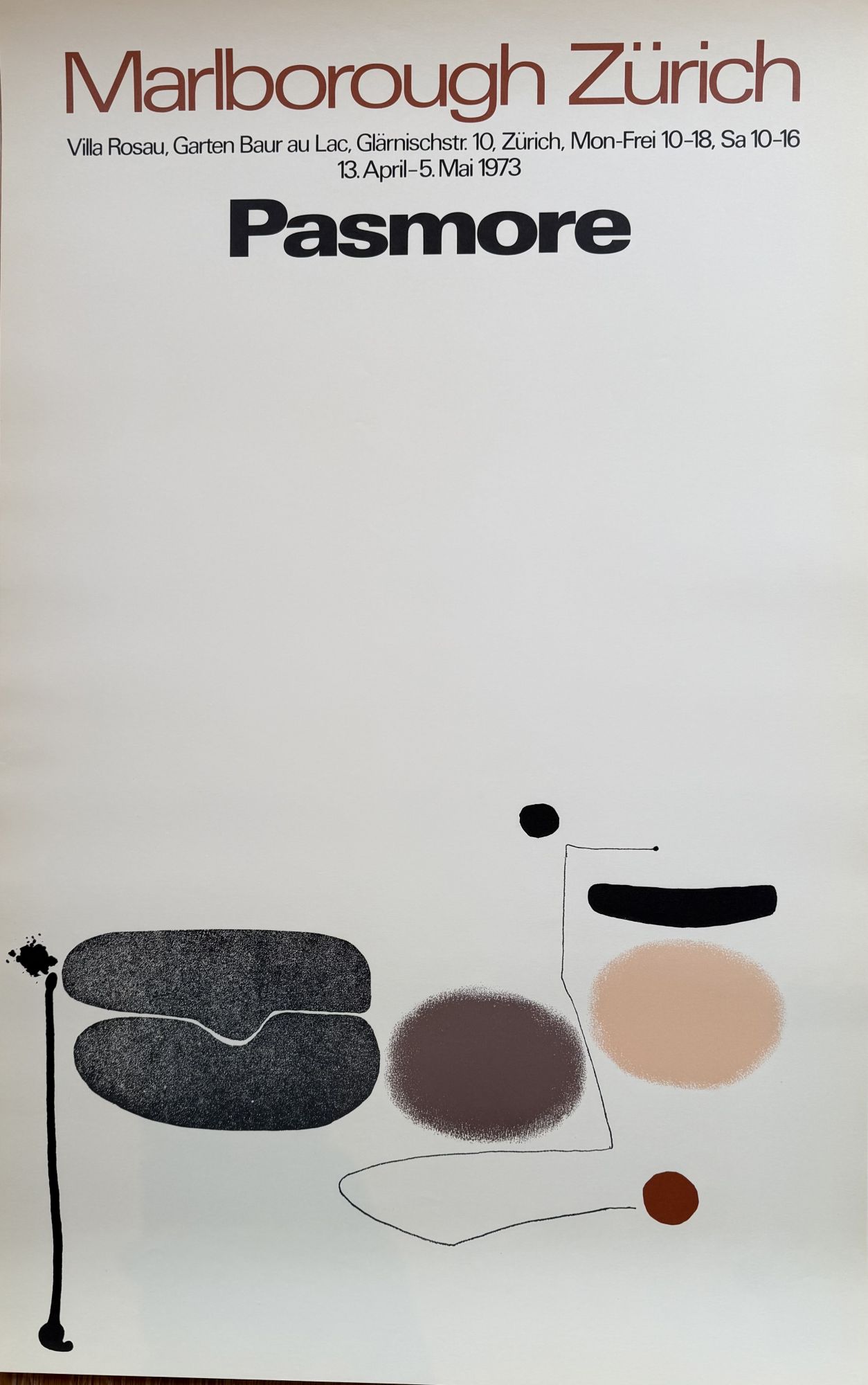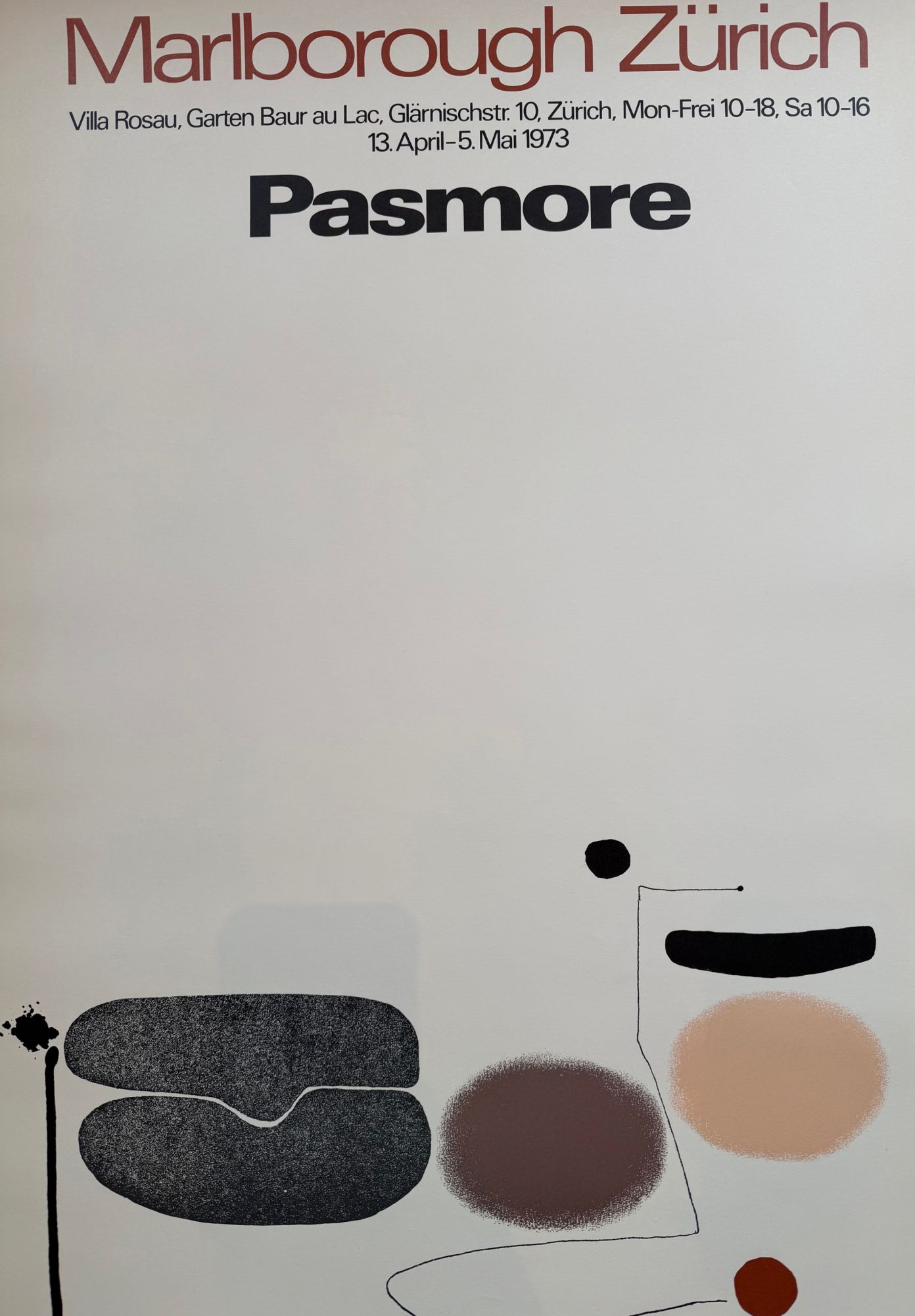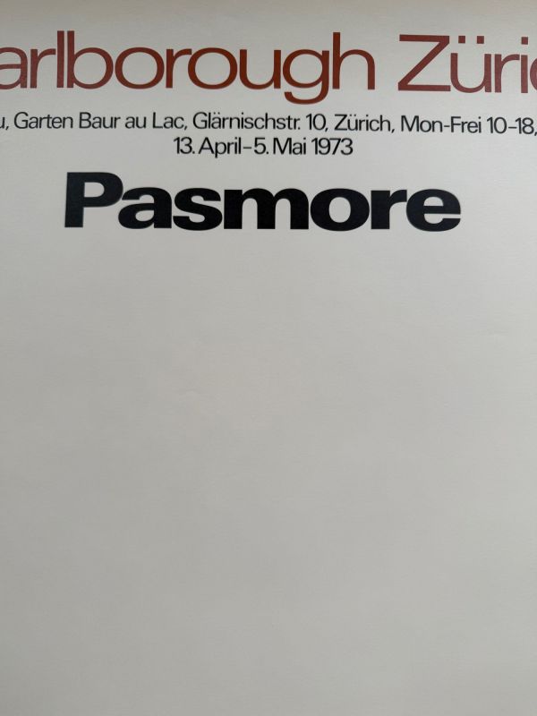 Original 1973 exhibition poster for Victor Pasmore’s show at Marlborough Zürich, featuring one of his lyrical abstract compositions. A fine vintage piece preserved in good condition with only light signs of age