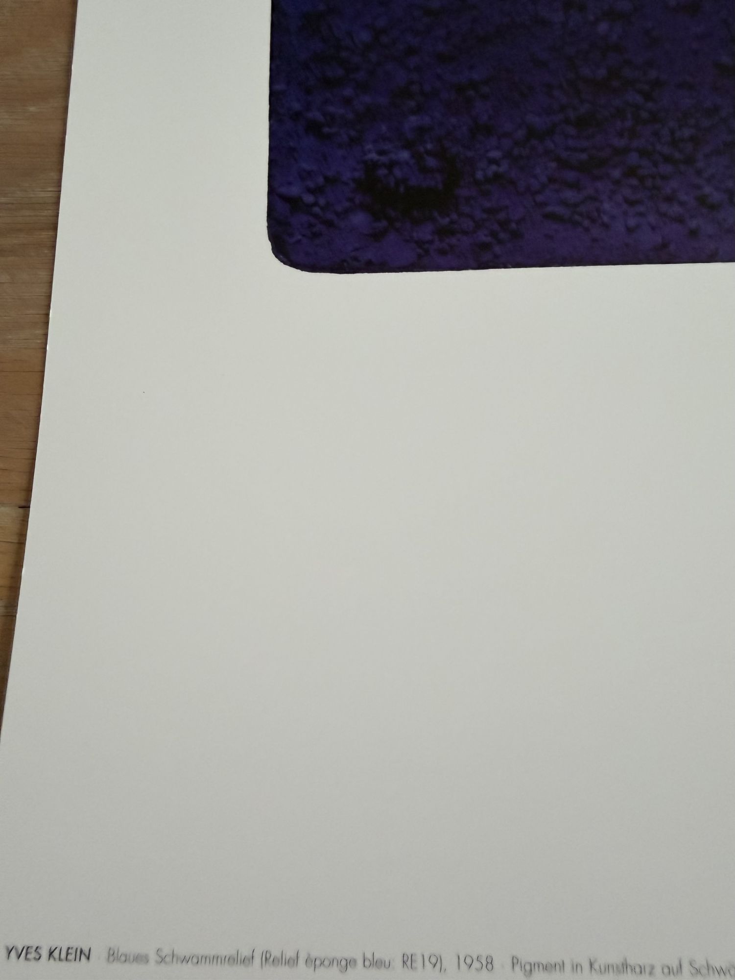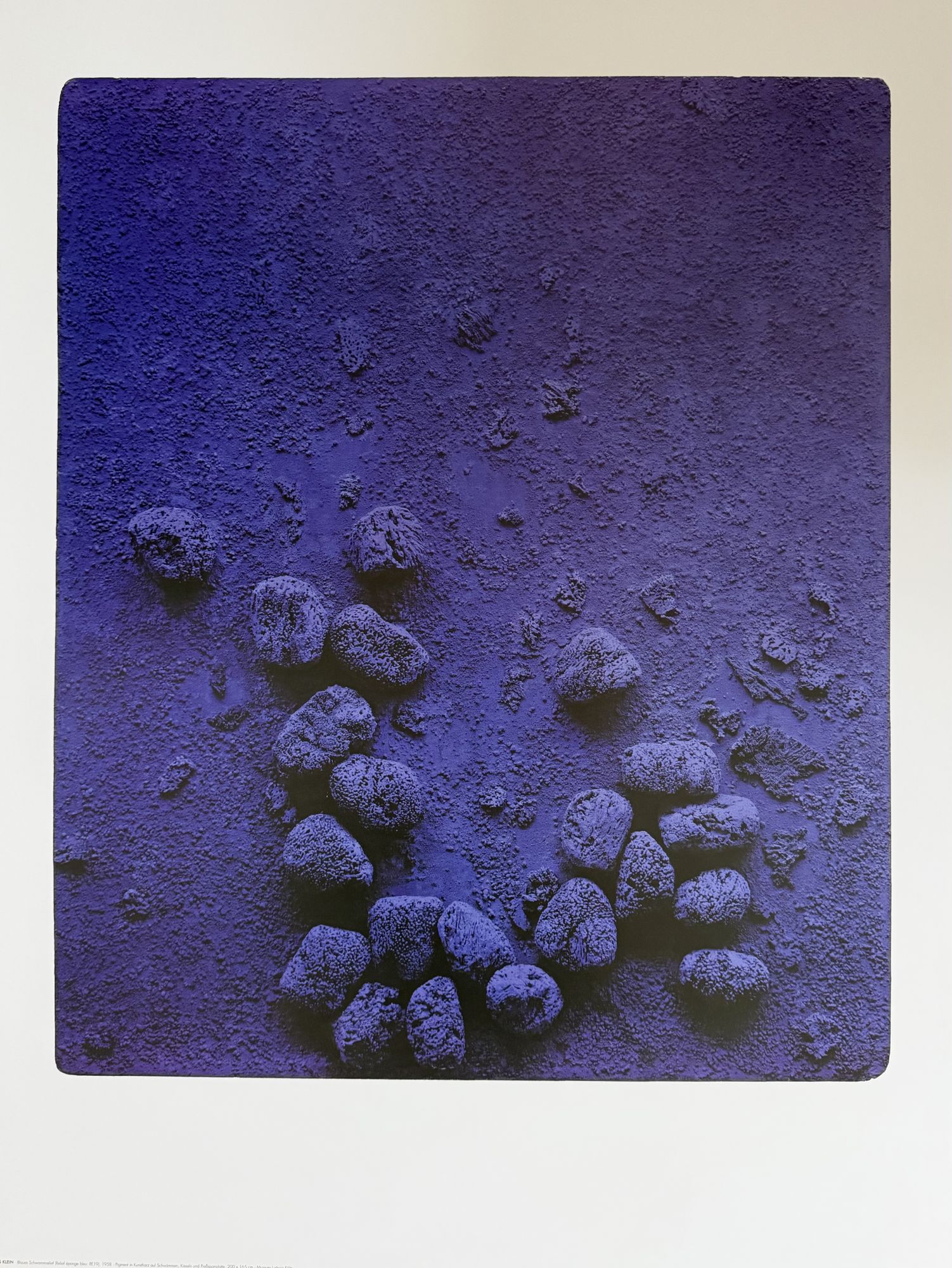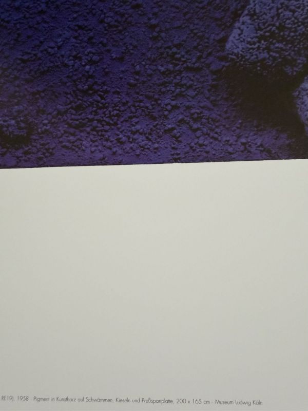 Yves Klein (1928–1962), Relief Éponge Blue: RE19, 1958. Yves Klein was a groundbreaking French artist and a leading figure in post-war European avant-garde. He is best known for his revolutionary use of International Klein Blue (IKB), his monochrome paintings, and innovative sculptural techniques that challenged traditional notions of art and space. This work, printed in Germany, copyright VG Bild-Kunst, Bonn 2008, is offered in good condition with secure delivery.
