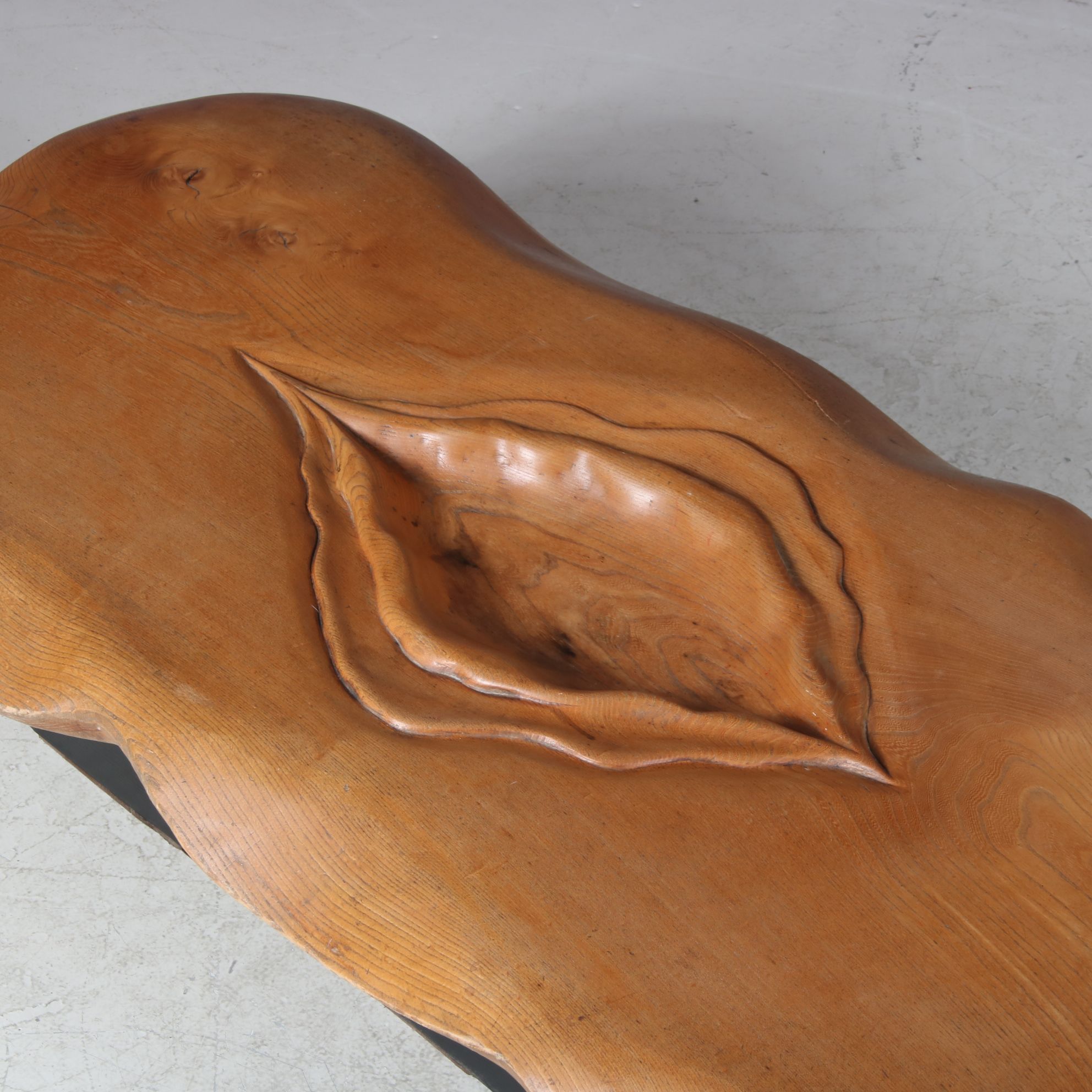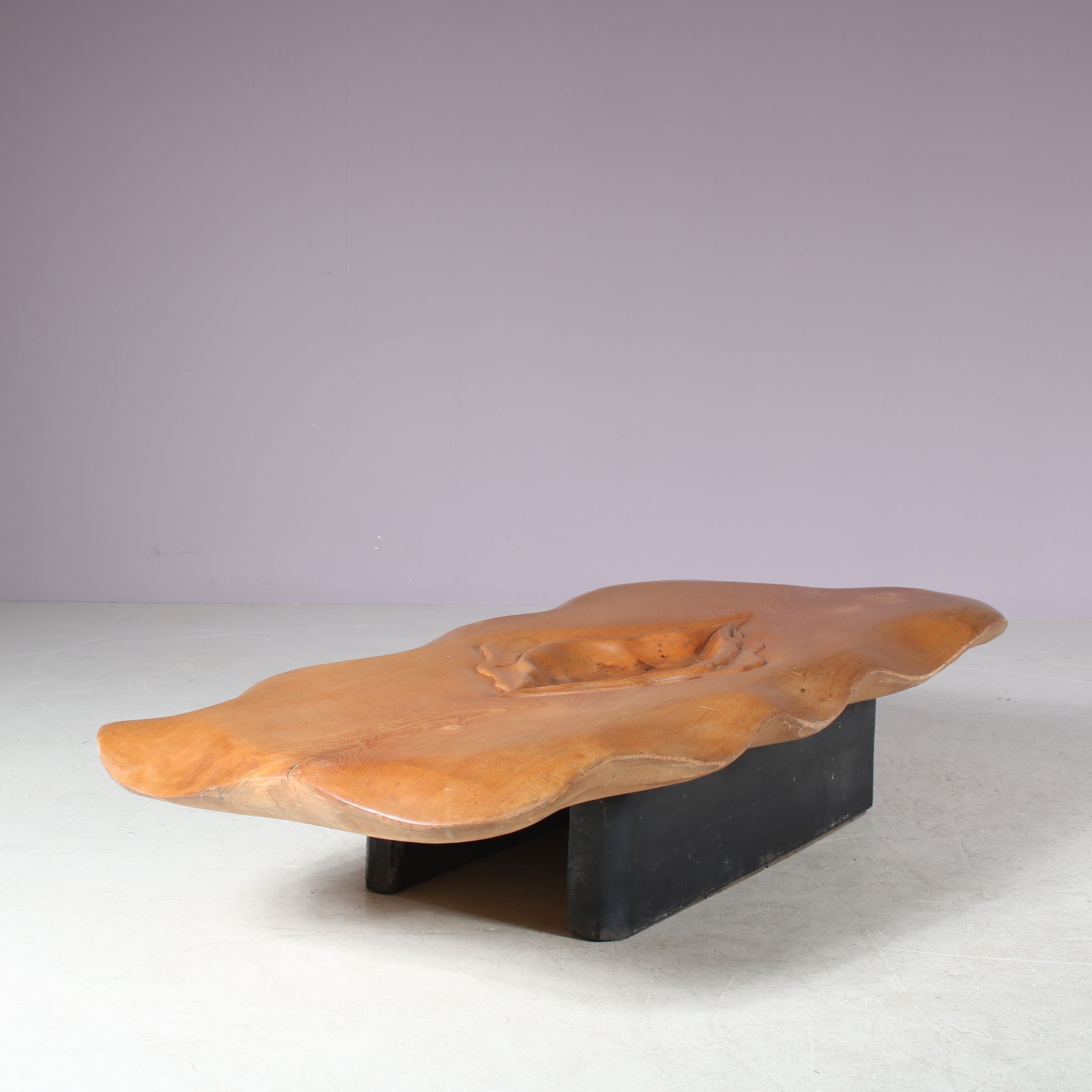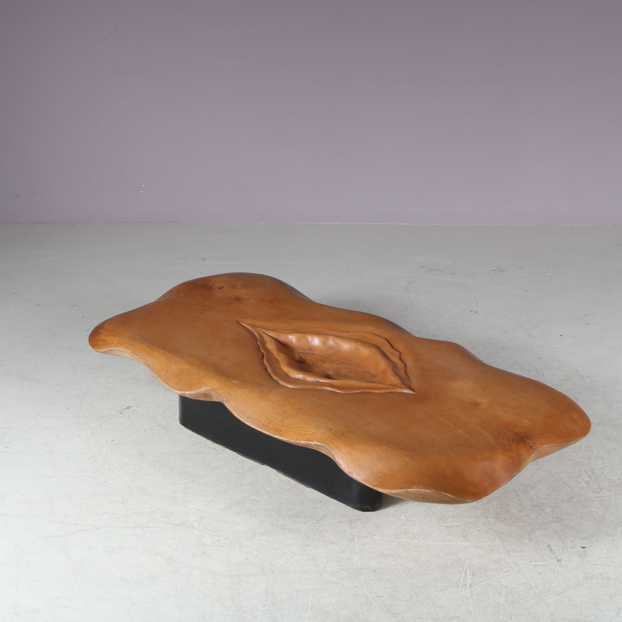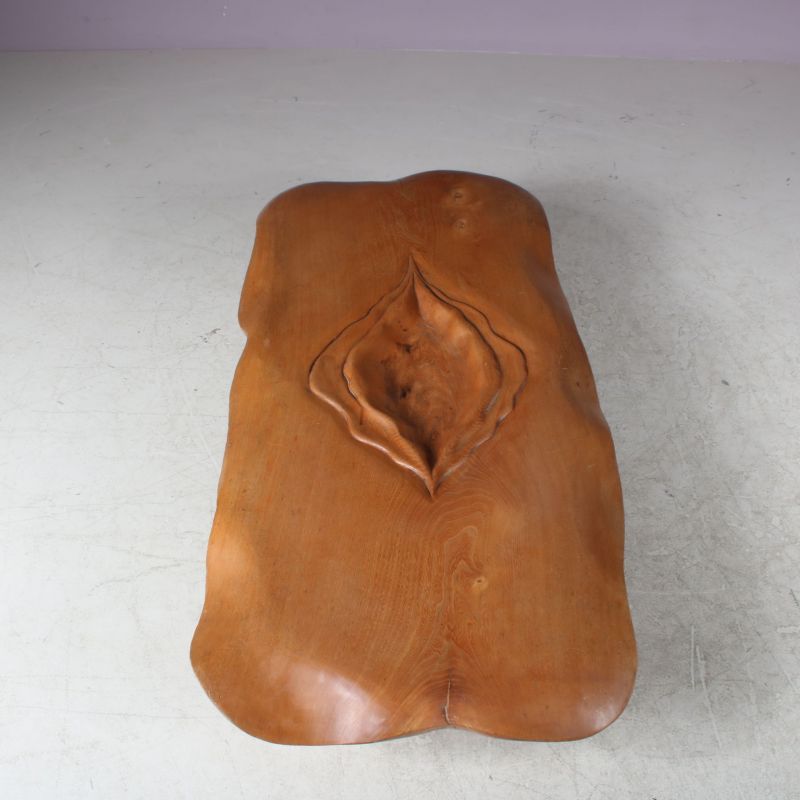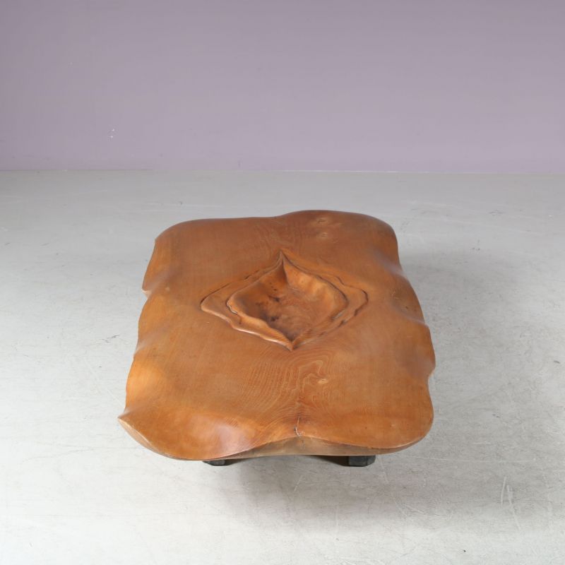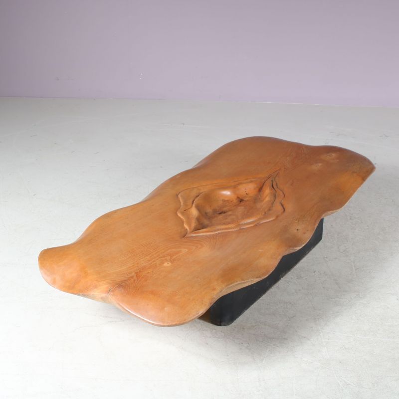 Beautifully made of high quality wood in organic shapes with an impressive eye for detail. The wooden top is a highly recognizable piece of work by French artist Ducouret (1946). The sculpture has a warm brown colour that is natural to the wood, which is of beautiful quality. It has been made into a coffee table resting on a two part black base with rounded finish. A fantastic and very unique find with a high decorative value!