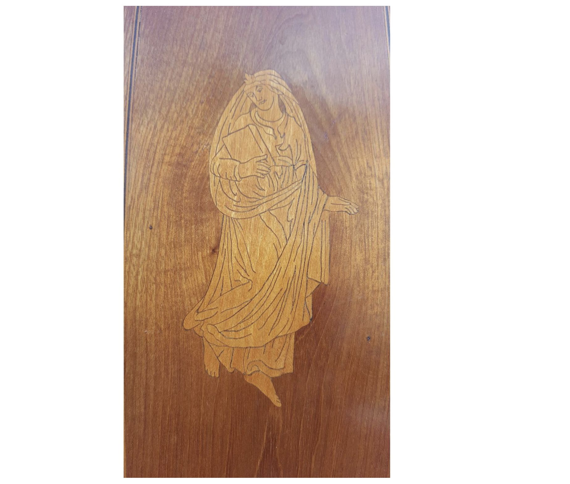 Swedish Art Deco/ late Biedermeier Empire pair of carver chairs in highly quilted golden birch veneers finished in the Classic darker honey color French polish finish with very unusual and superb quality Marquetry inlays of medieval women on the backrest.