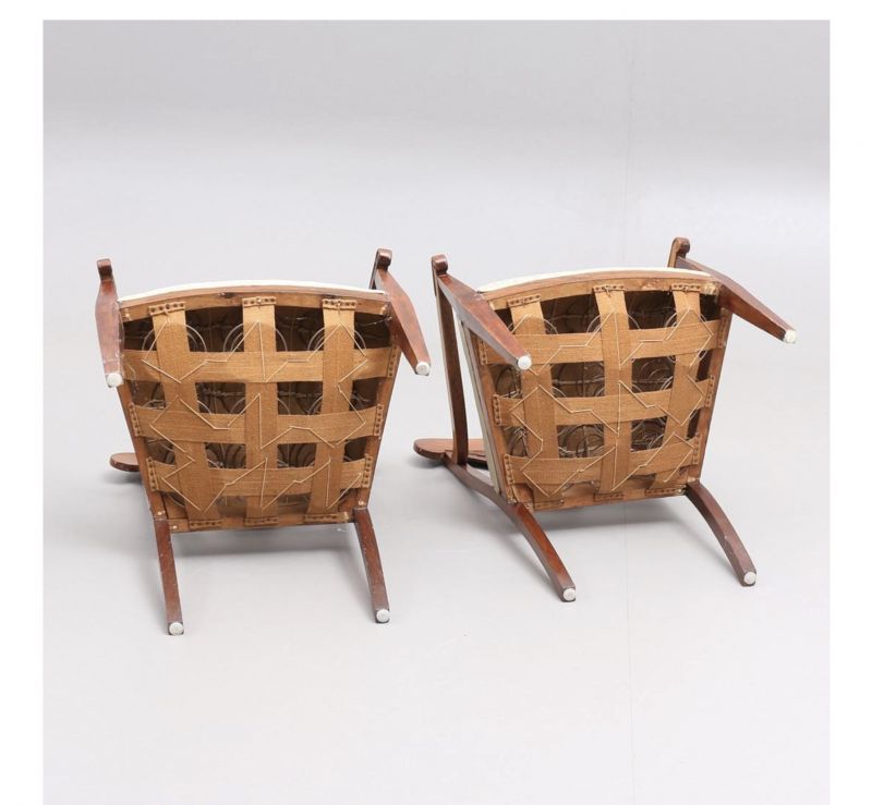 They have fully webbed seats for maximum comfort and the gently curved front sabre legs are topped with unusual rounded arms with a lower orb embellishment .
