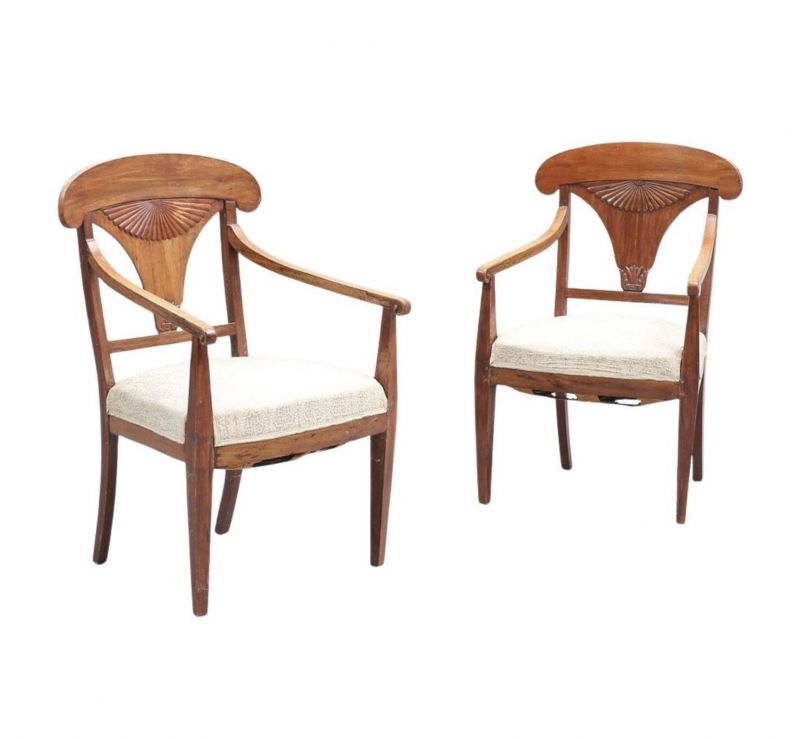 The seat backs are the classic napoleon hat shape with an unusual fan motif back panels shape and show off the grain of the carver chairs really well.