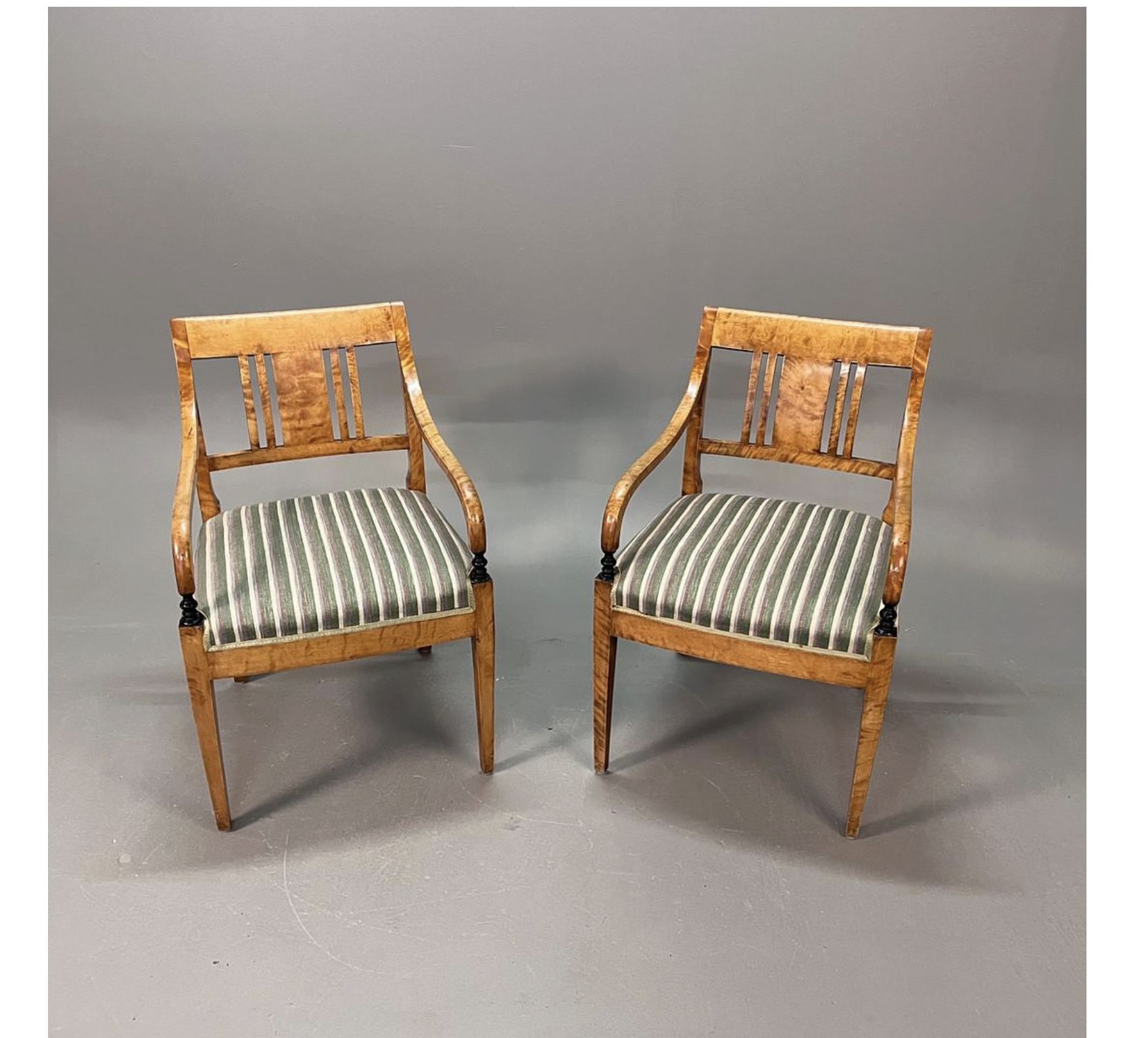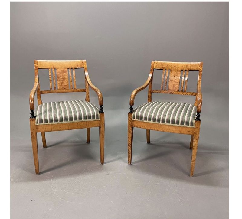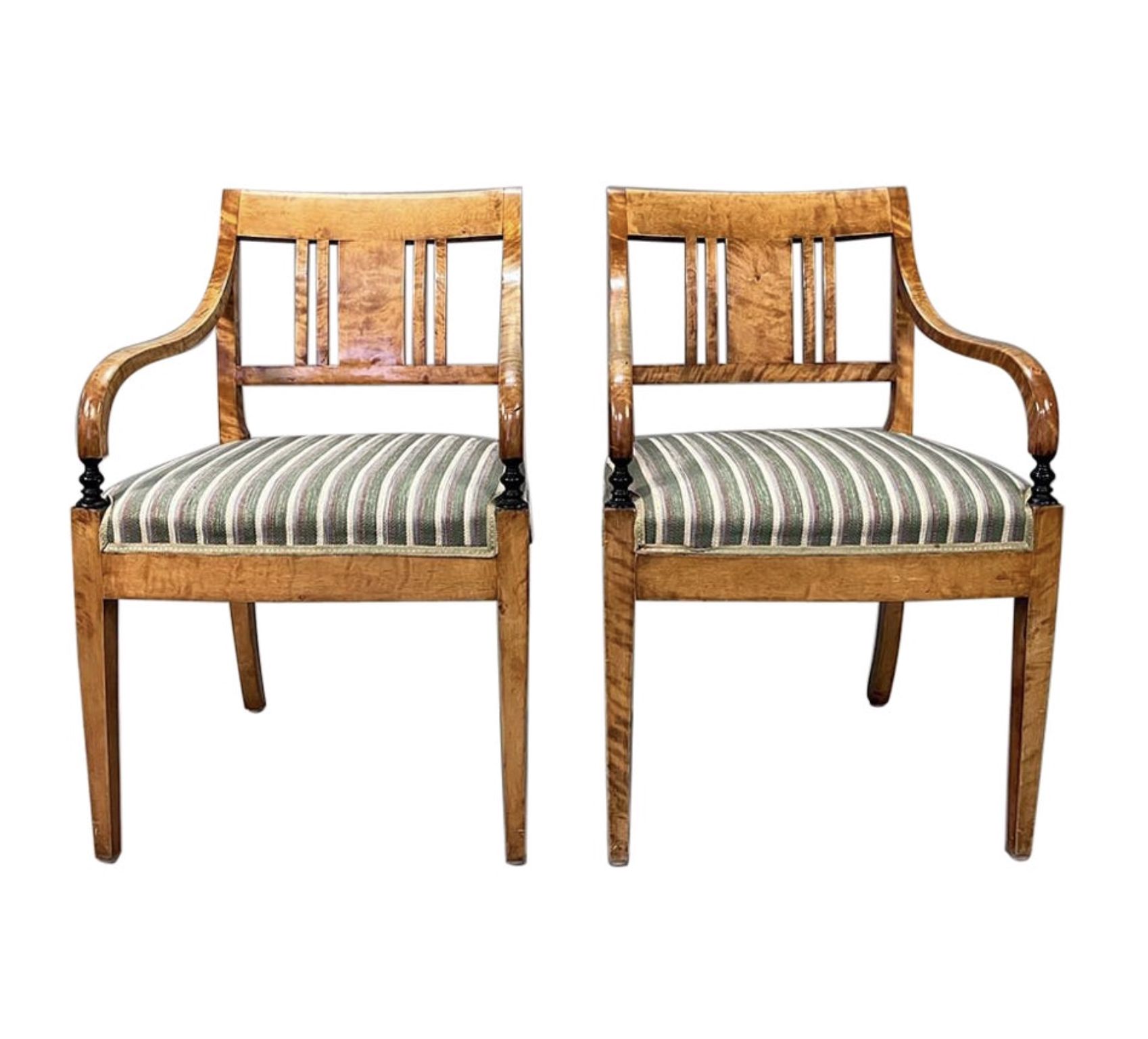 Swedish Biedermeier Empire pair of antique carver chairs in highest grade quilted golden birch veneers finished in the Classic honey oak color French polish finish with rounded arms and the rarer square backs.