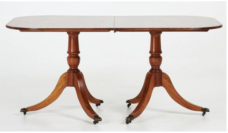 Lovely curved legs on a turned pillar base for each main table section ending in brass castors feet.