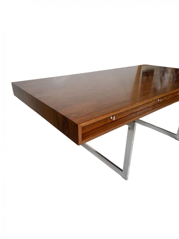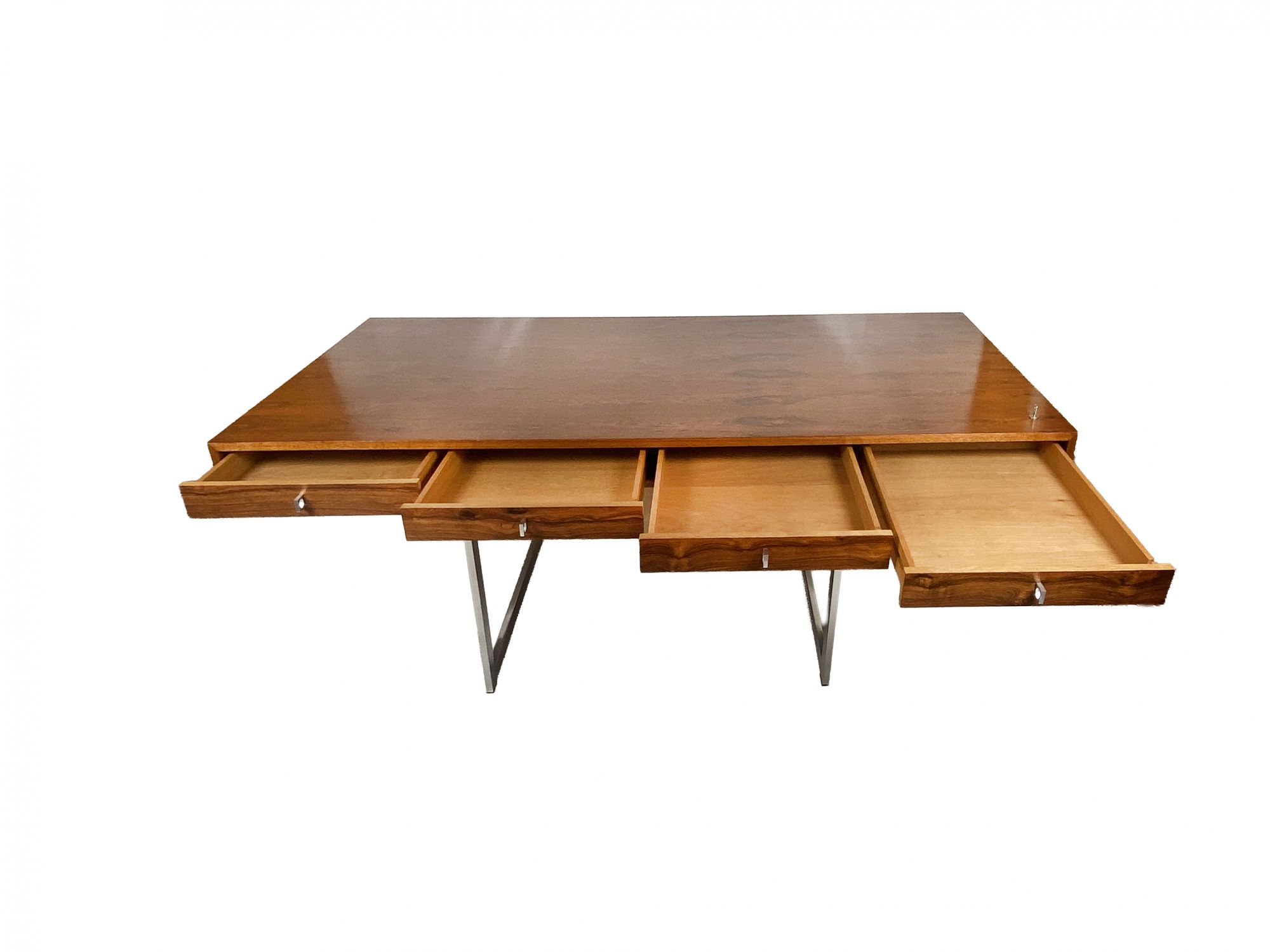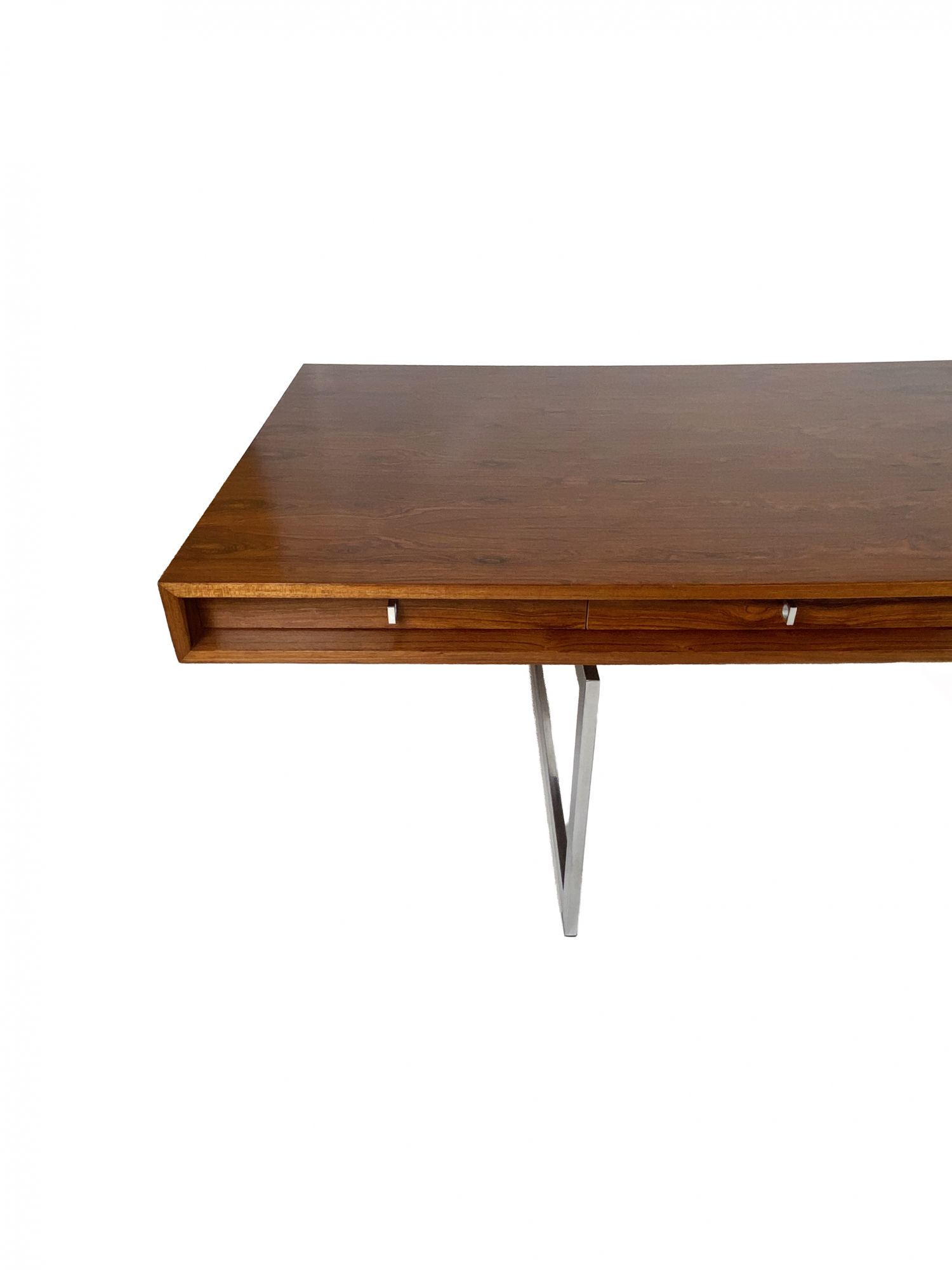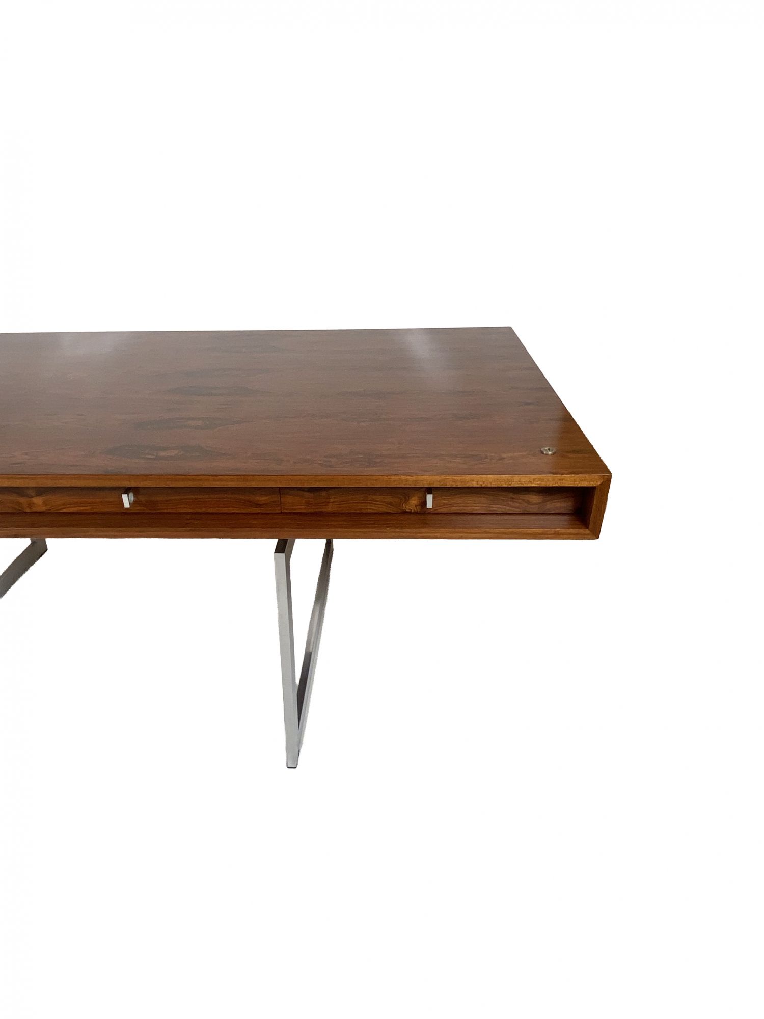 Bodil Kjaer large freestanding rosewood executive desk, model 901 with chrome-plated metal frame, cassette top with four recessed drawers. Produced by E. Petersen & Søn, Denmark. Manufacturer’s label to the underside. Key included.