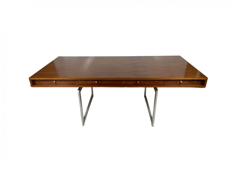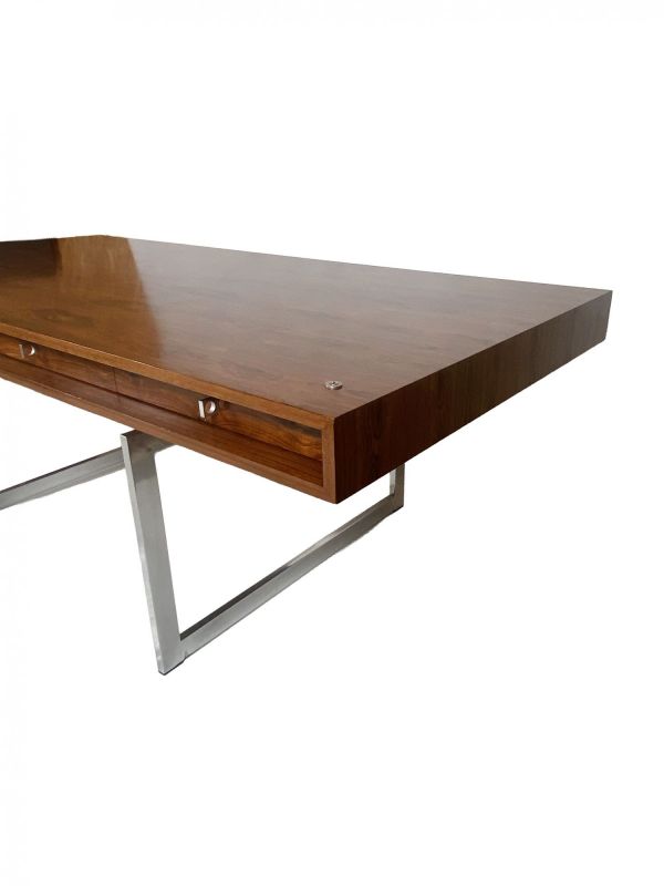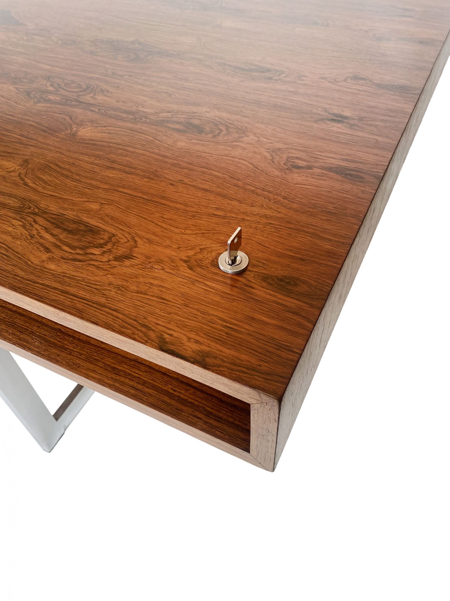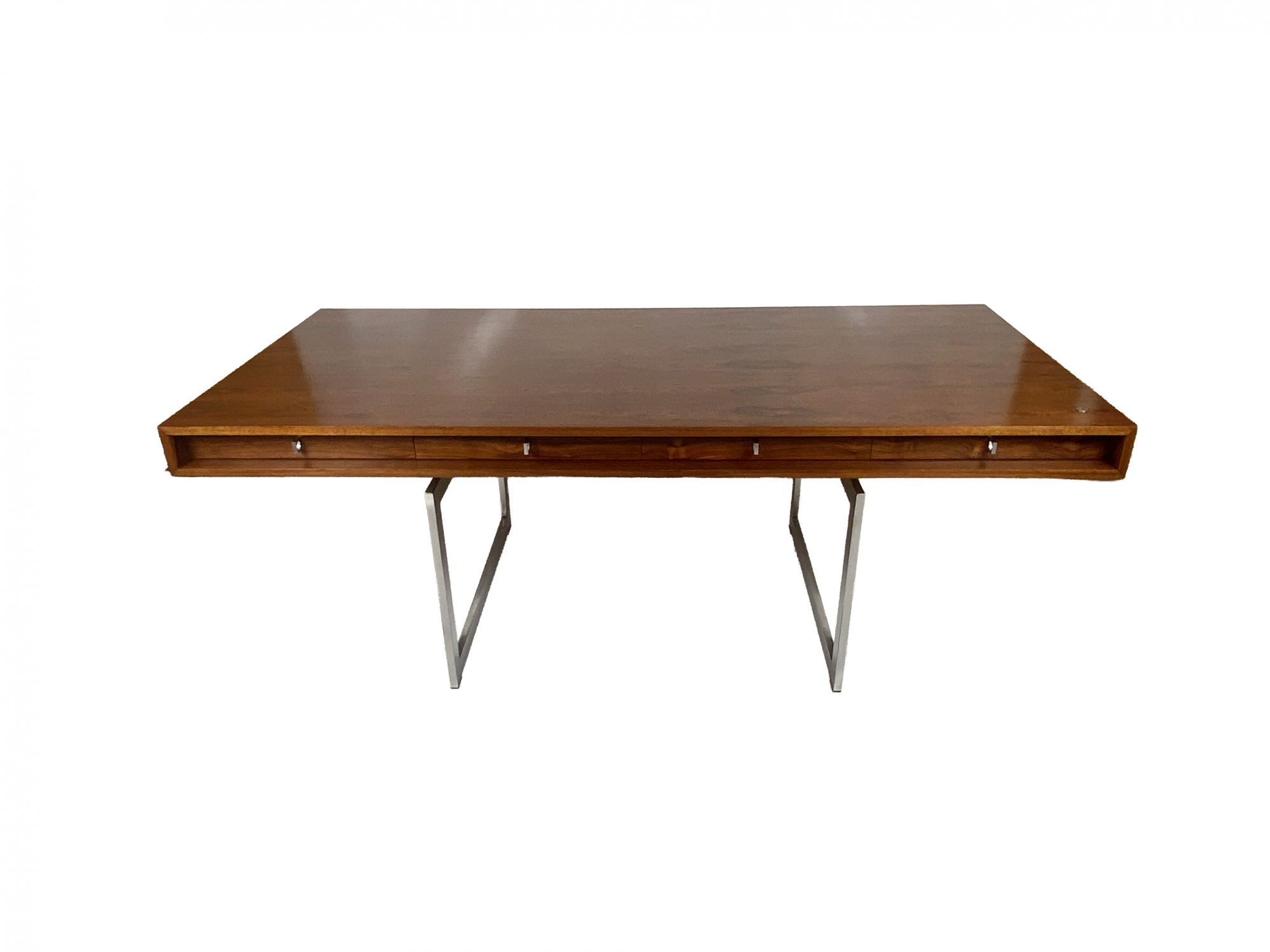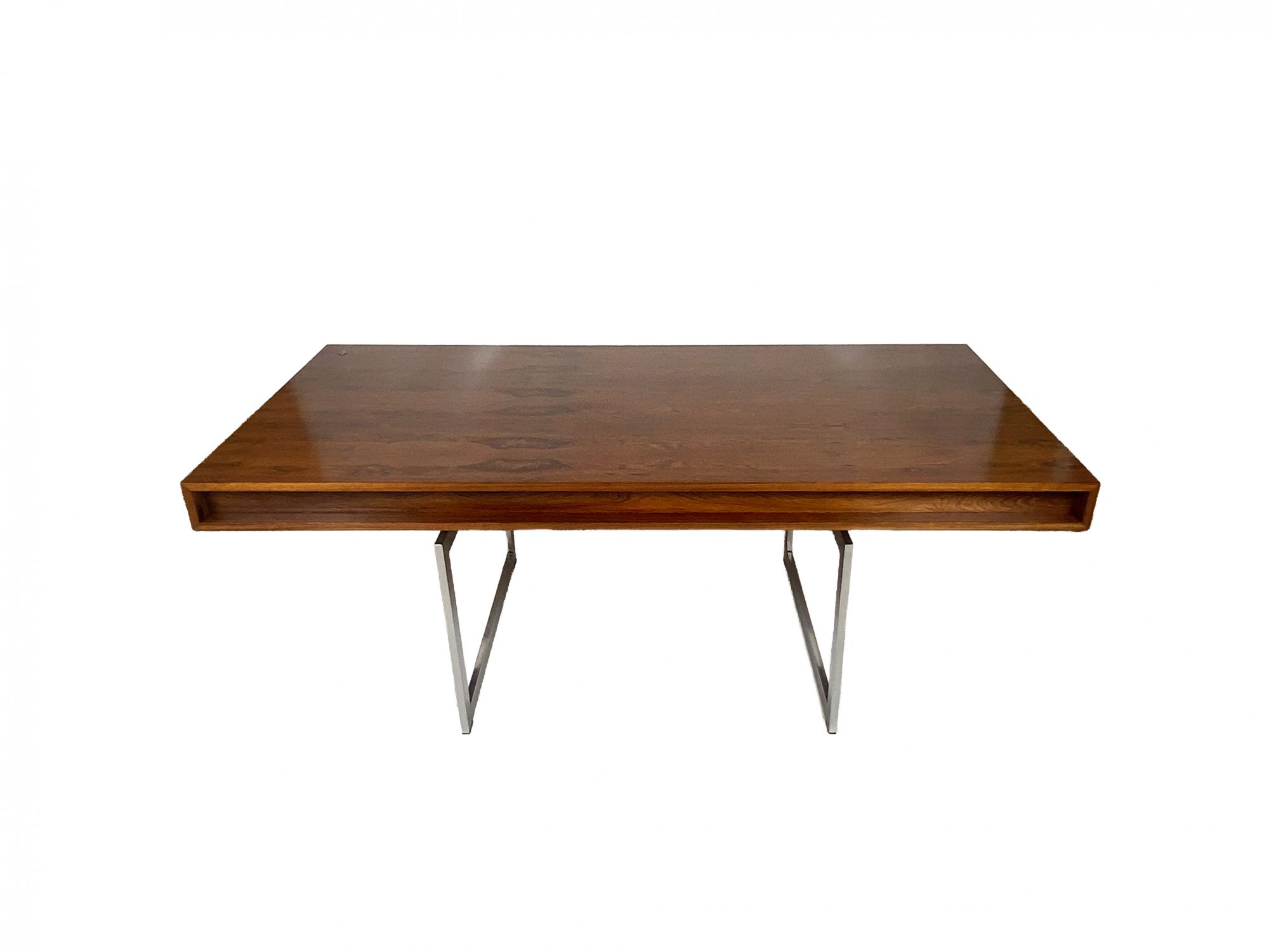 Bodil Kjaer large freestanding rosewood executive desk, model 901 with chrome-plated metal frame, cassette top with four recessed drawers. Produced by E. Petersen & Søn, Denmark. Manufacturer’s label to the underside. Key included.