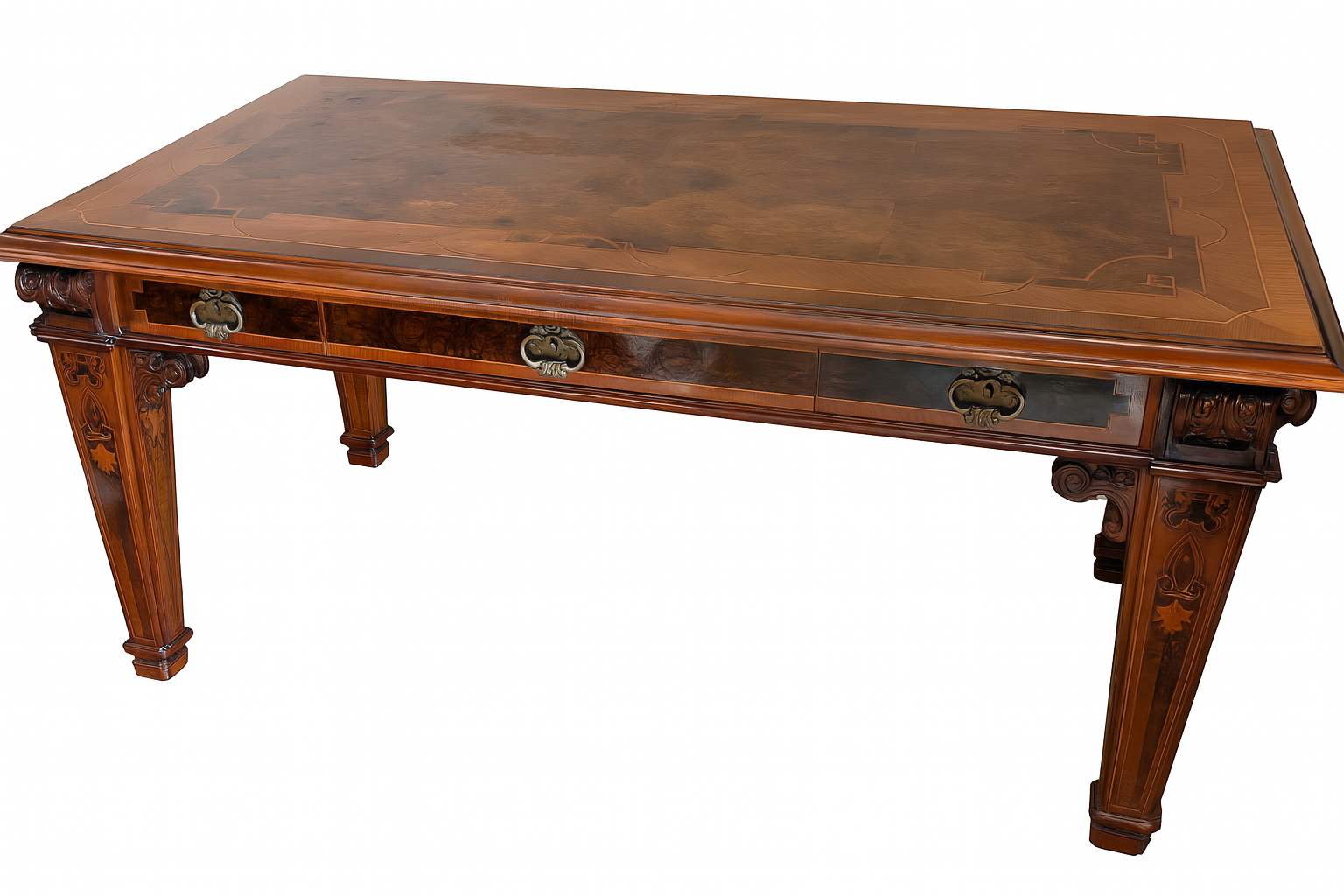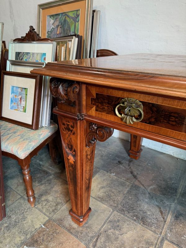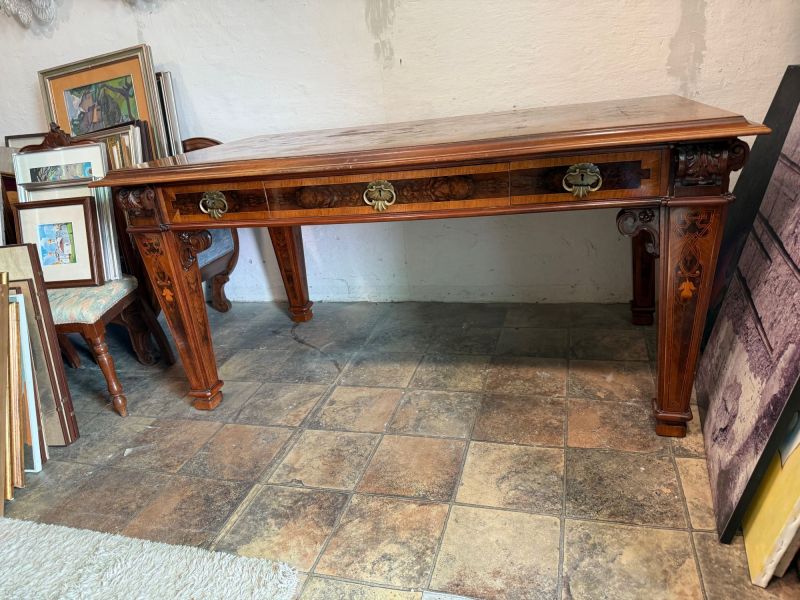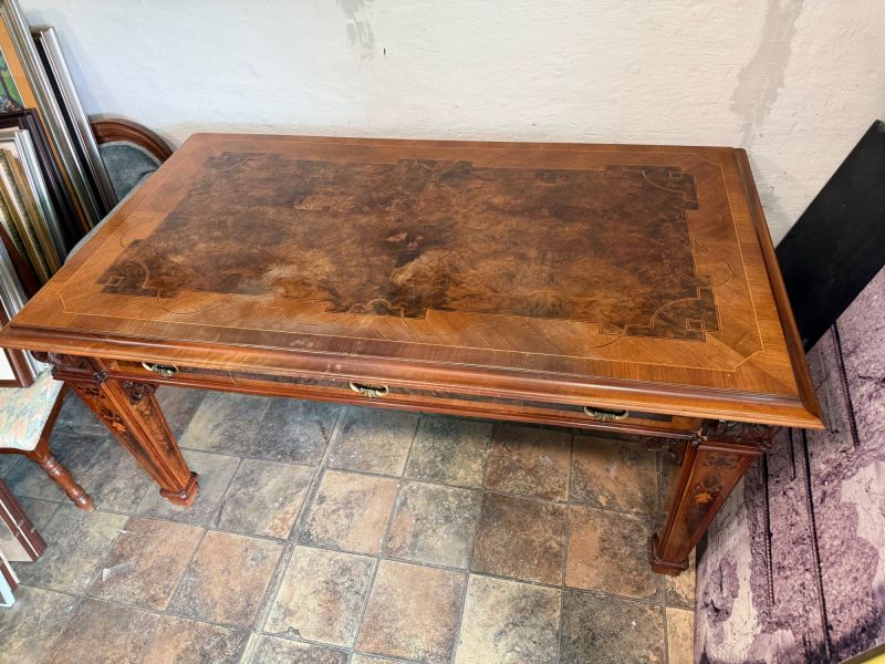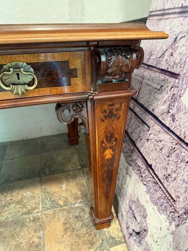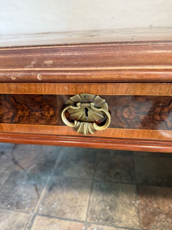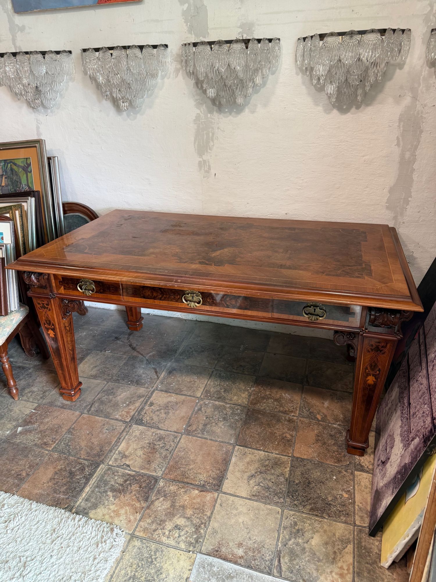 Desk 1920-1930 art deco period, authentic condition, made of chestnut and cherry wood, with beautiful inlay and marquetry of different wood, decorated with bronze pullers and knobs. The top needs to be polished a bit.