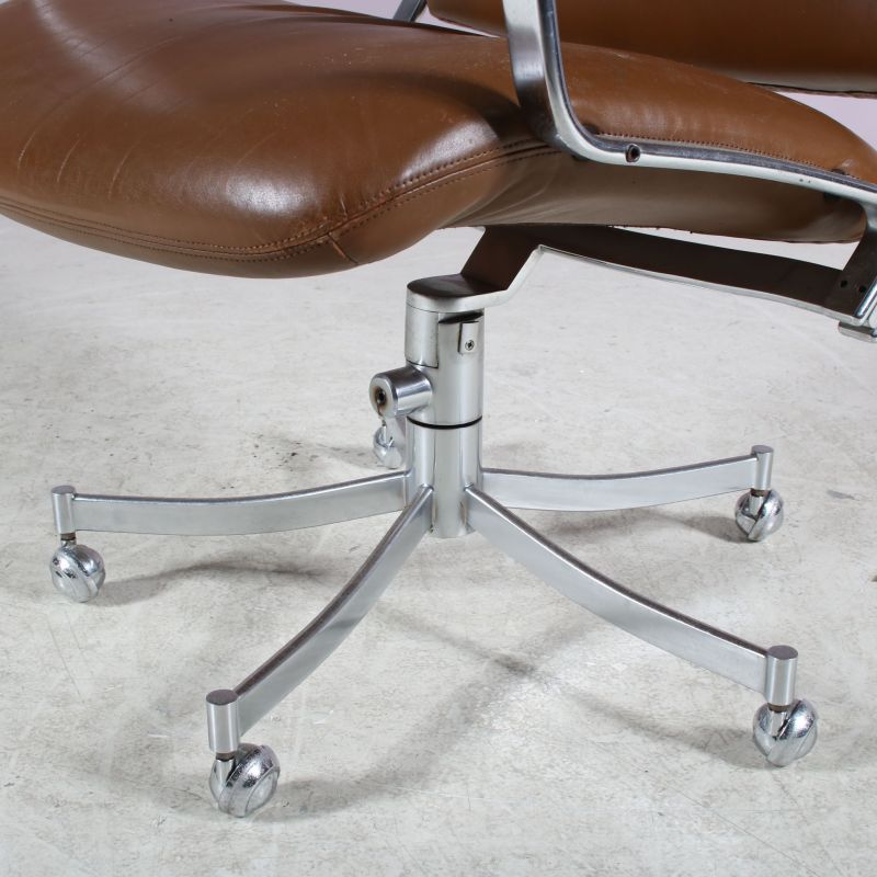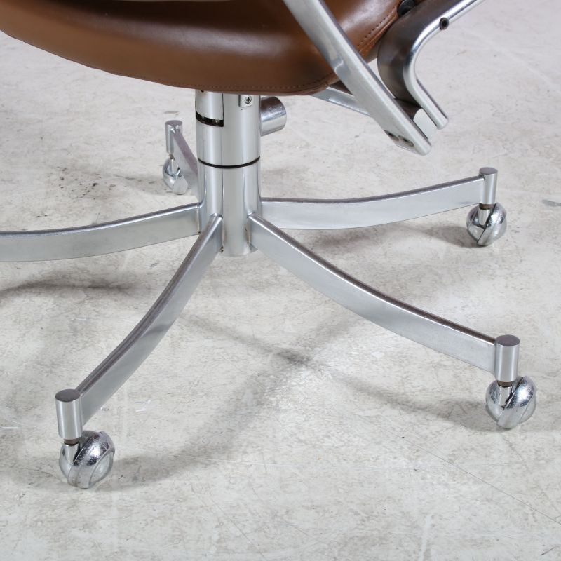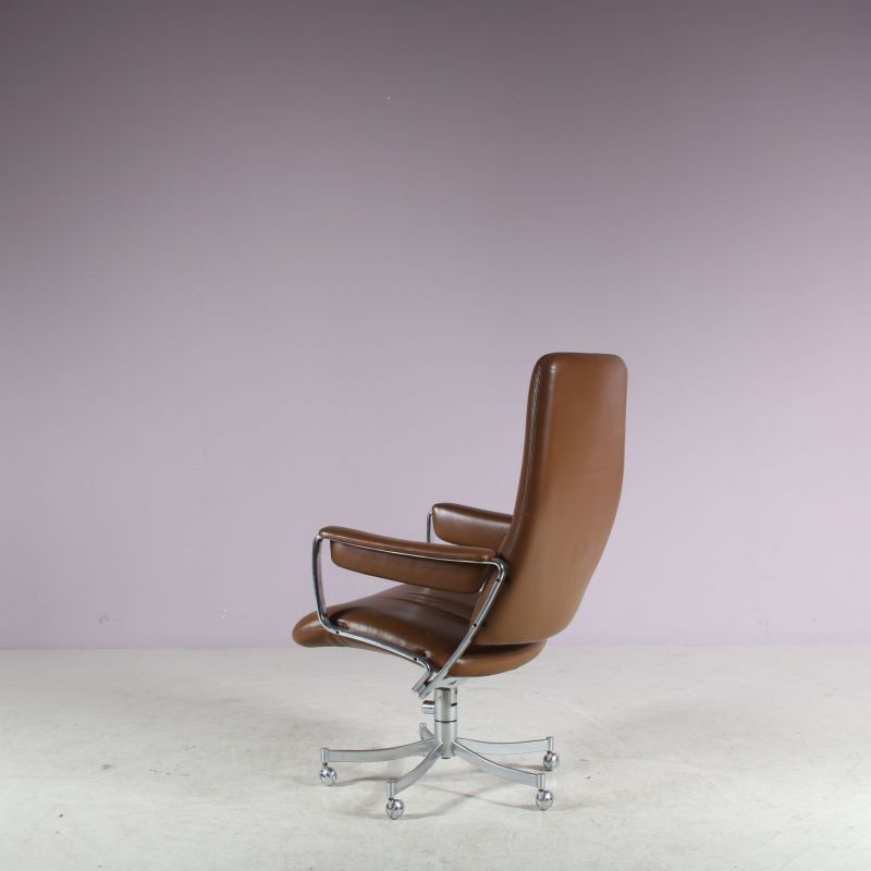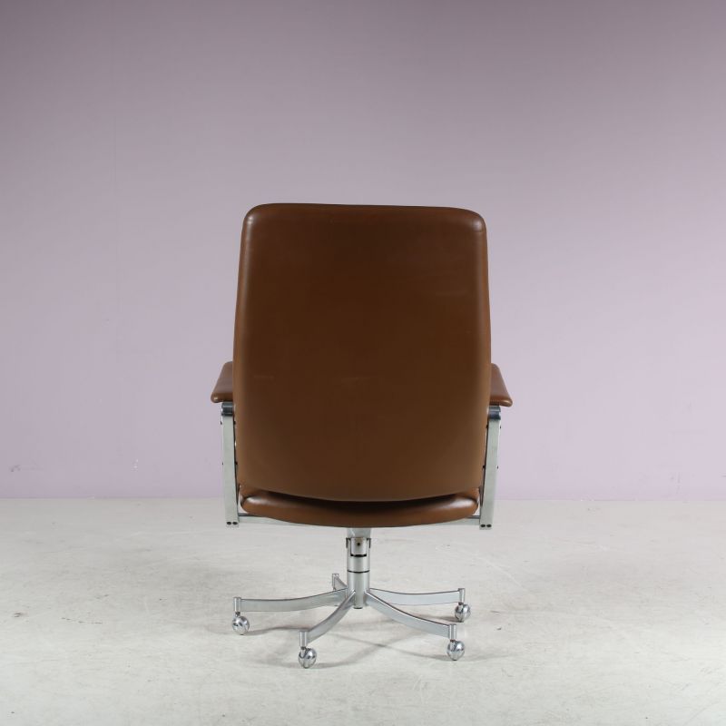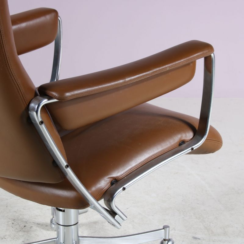 This elegant and impressive chair, model “JK760”, has a chrome plated metal base that provides a wonderful yet elegant modern flair. The brown leather upholstery has a nice color that goes slightly towards cognac. This adds a touch of luxury, offering both comfort and elegance. The chair’s ergonomic design ensures a supportive seating experience, making it ideal for long working hours or focused tasks. With its blend of aesthetics and functionality, this chair is a perfect addition to any workspace or study.