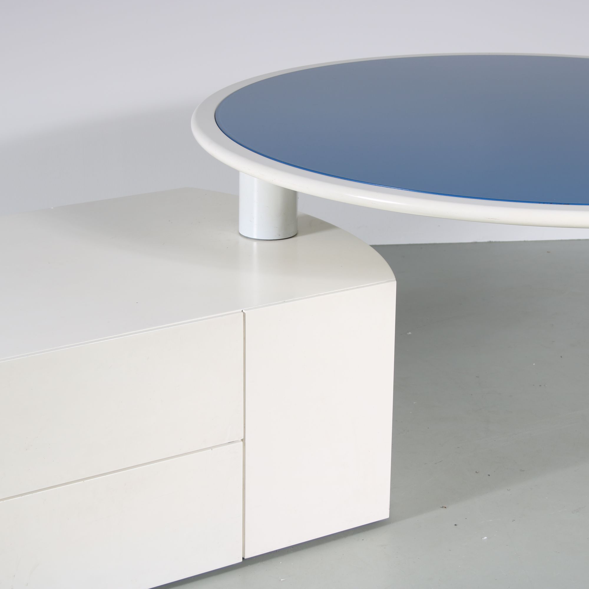 This outstanding piece has a white wooden base with storage unit and adjustable round top. It has two drawers that open and close smoothly, revealing plenty of storage capacity. The unique structure allows the top to be movable from above the storage unit to the other side, allowing it to be versatile in use for different decors and situations! The round top has a blue glass inlay, nicely contrasting to the rest of the piece and adding a wonderful finishing touch. A real eye-catching for any decor!