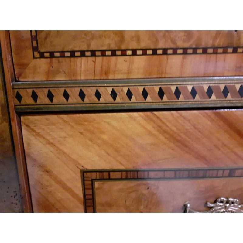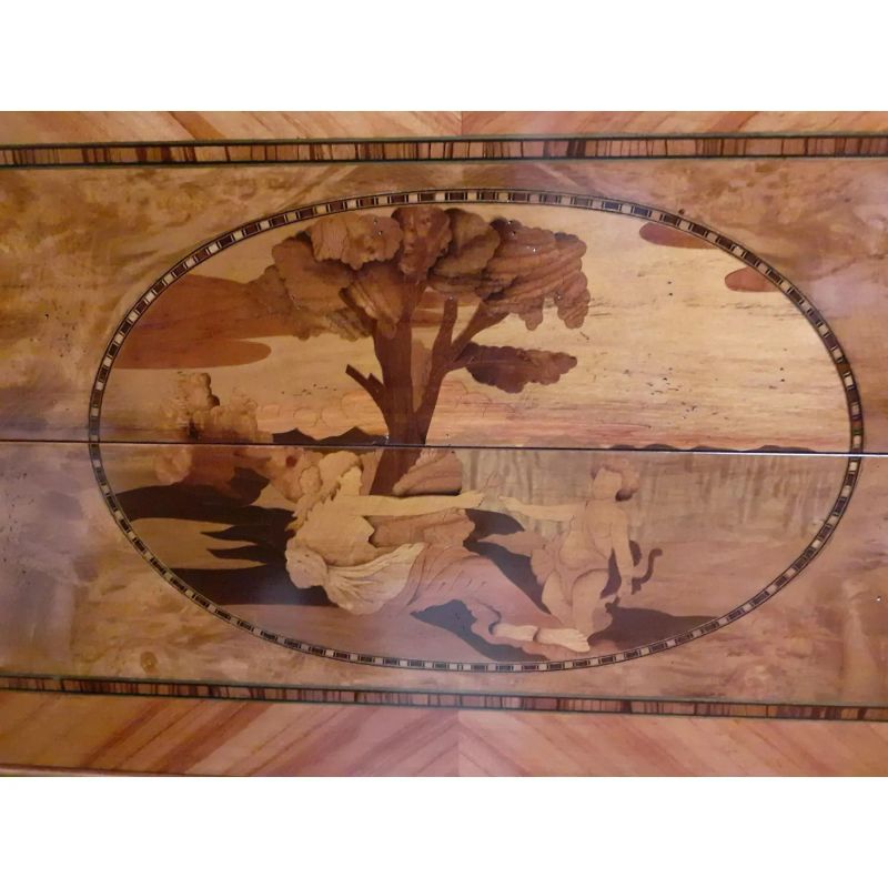 Chest of drawers inlaid with two images of landscape in briar, cherry, olive and ebony wood, the result of high Italian craftsmanship. Style "Maggiolino".Furniture inspired by the great cabinetmaker Maggiolini. All made in Italy.