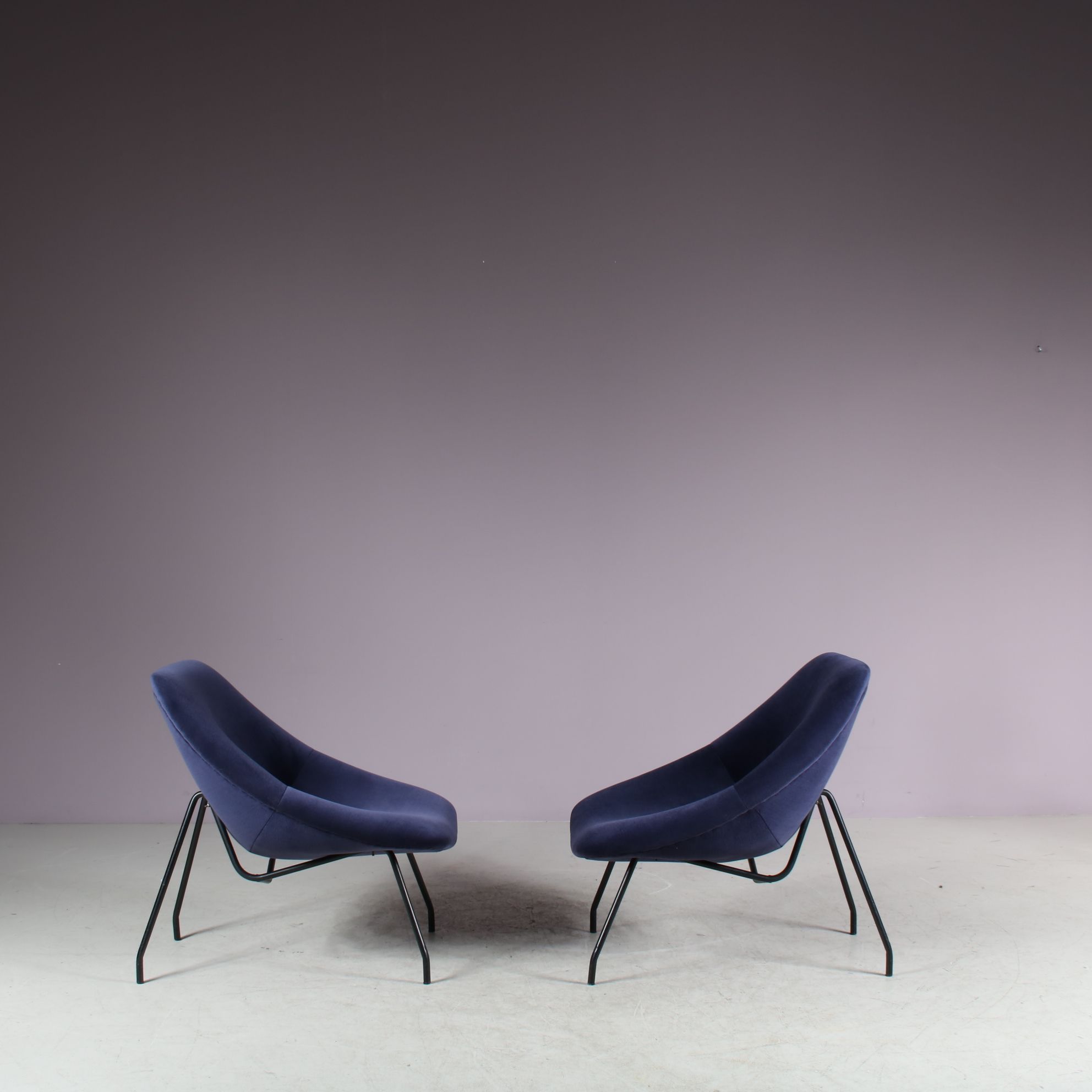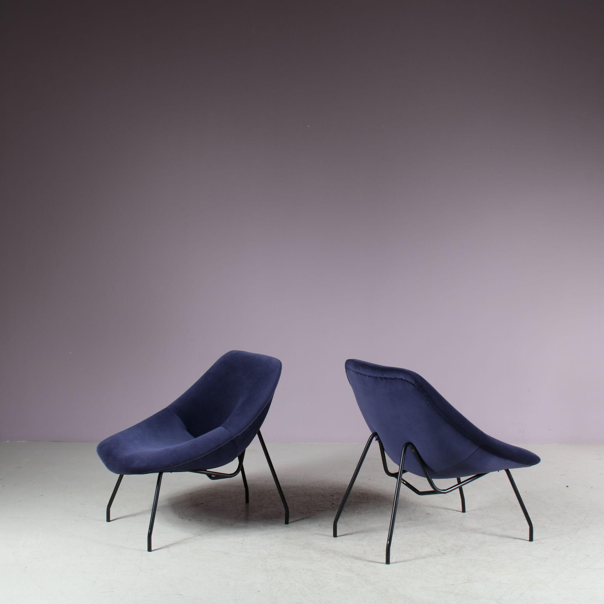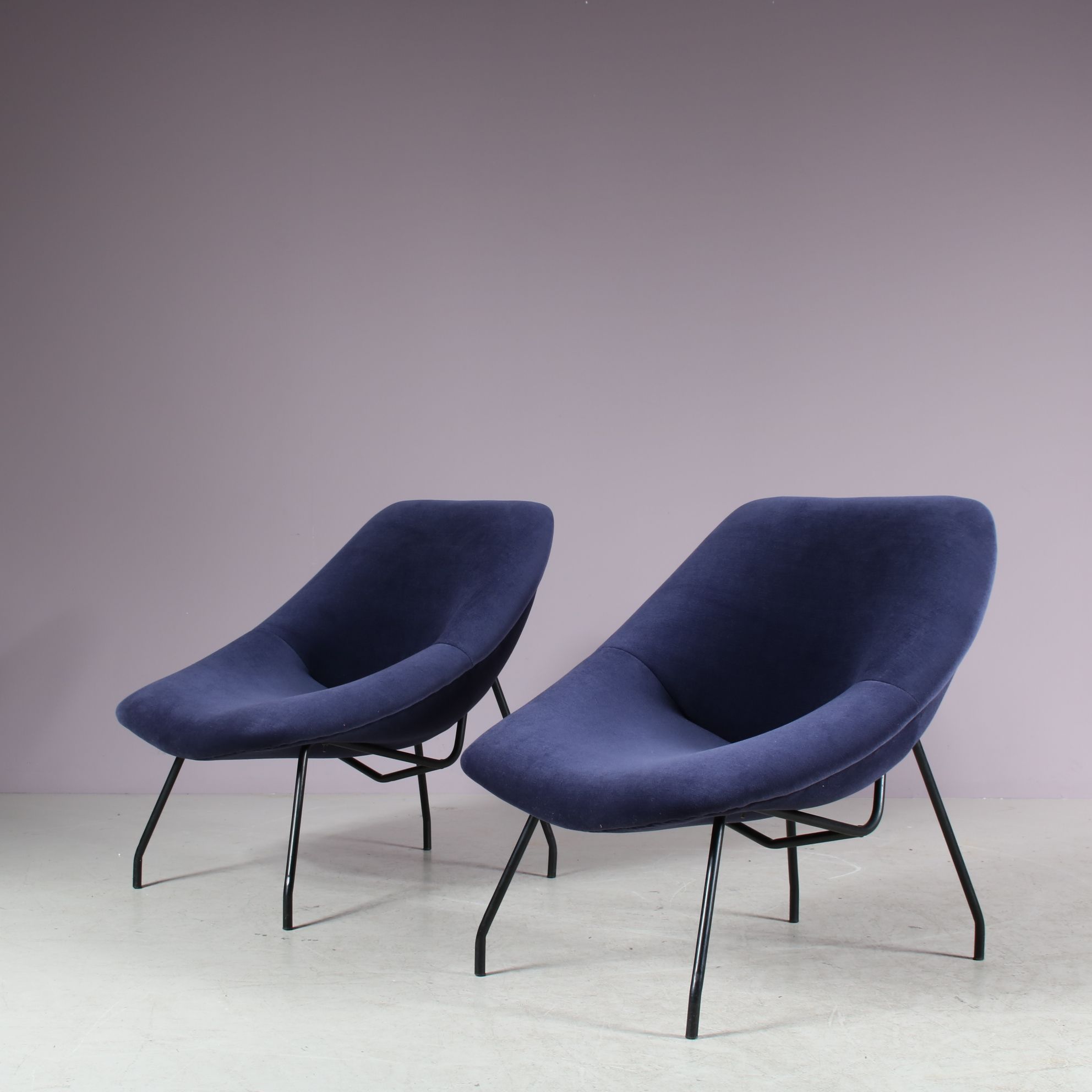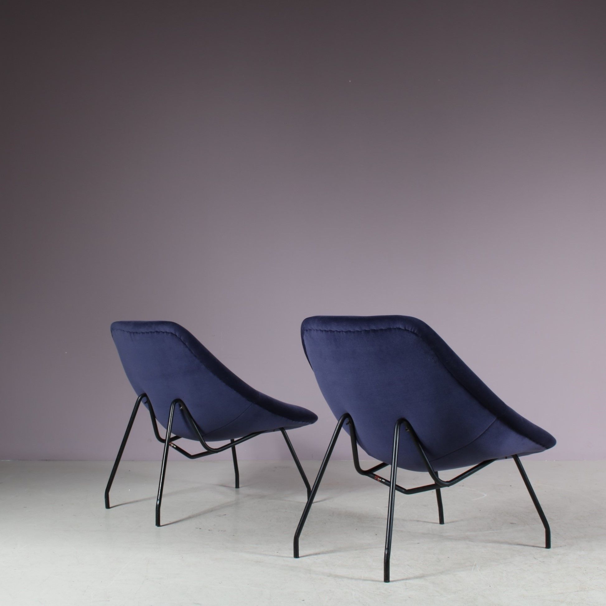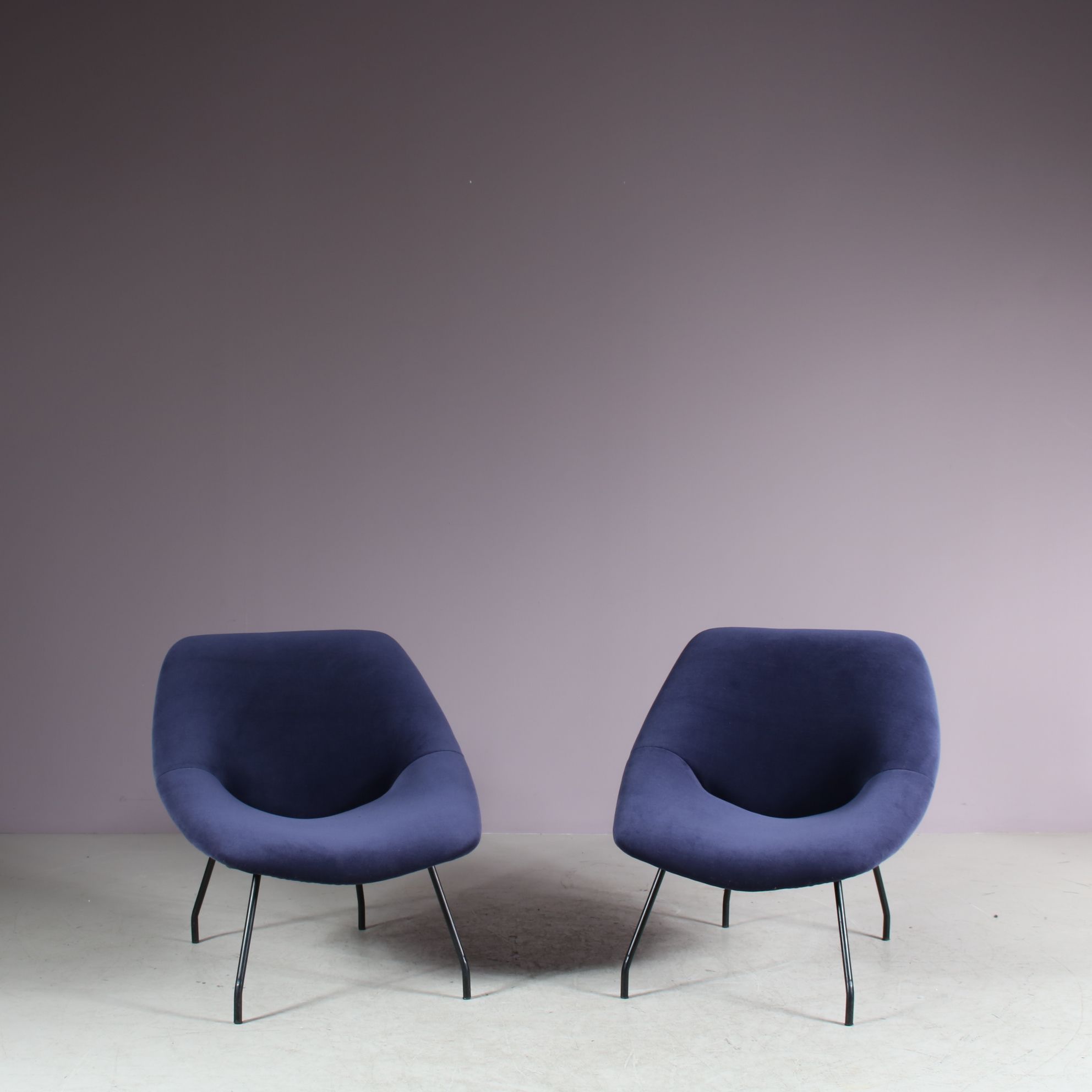 They have thin black lacquered metal bases with a beautiful, deep purple fabric upholstery. The fabric is thick and very soft and of impressive quality! A beautiful combination of materials and colours that gives the set a wonderful luxurious style! They have a comfortable ergonomic seat. The visible, elegant structure compliments the pieces perfectly. They will be a valuable addition to the decor!