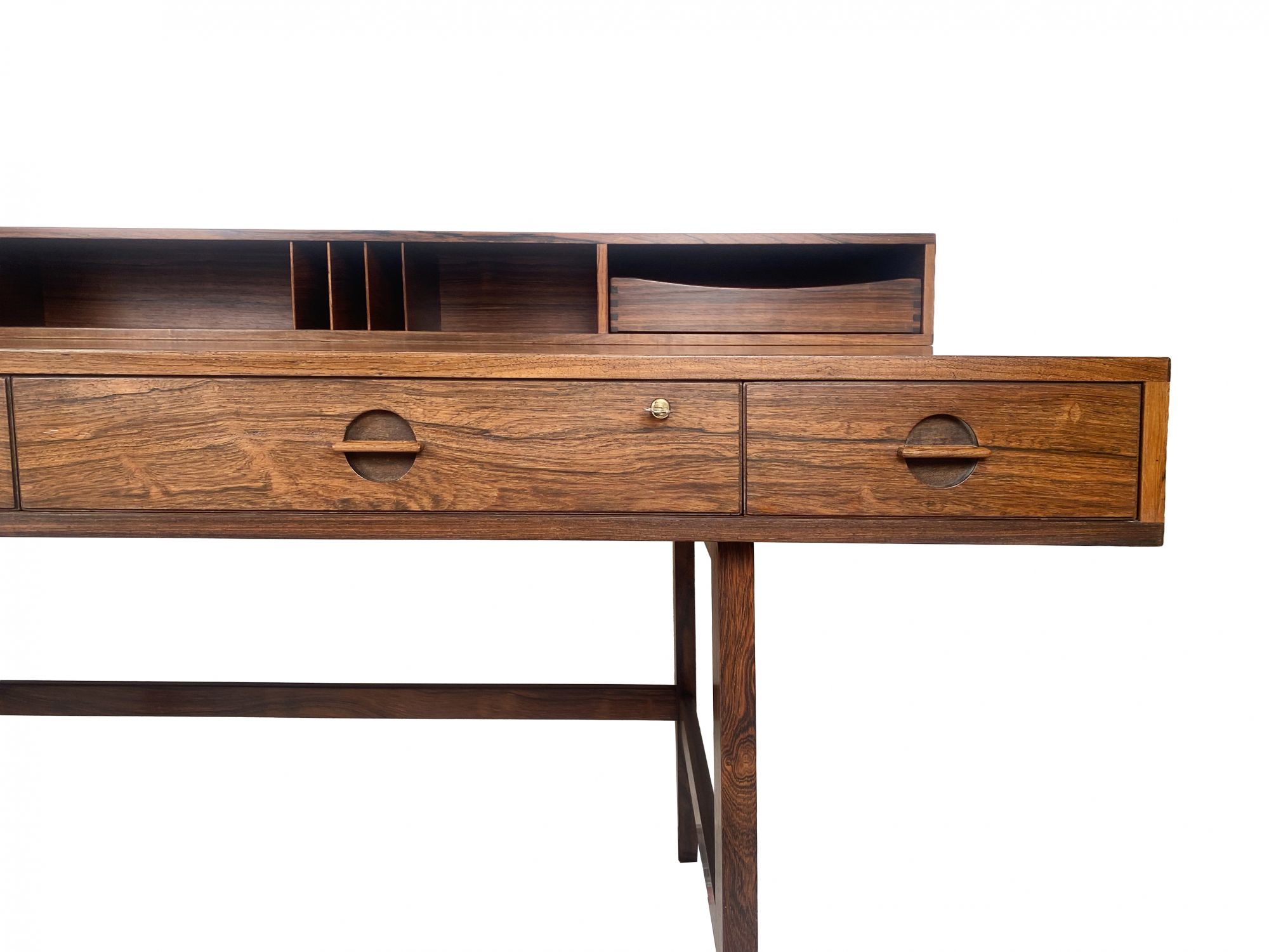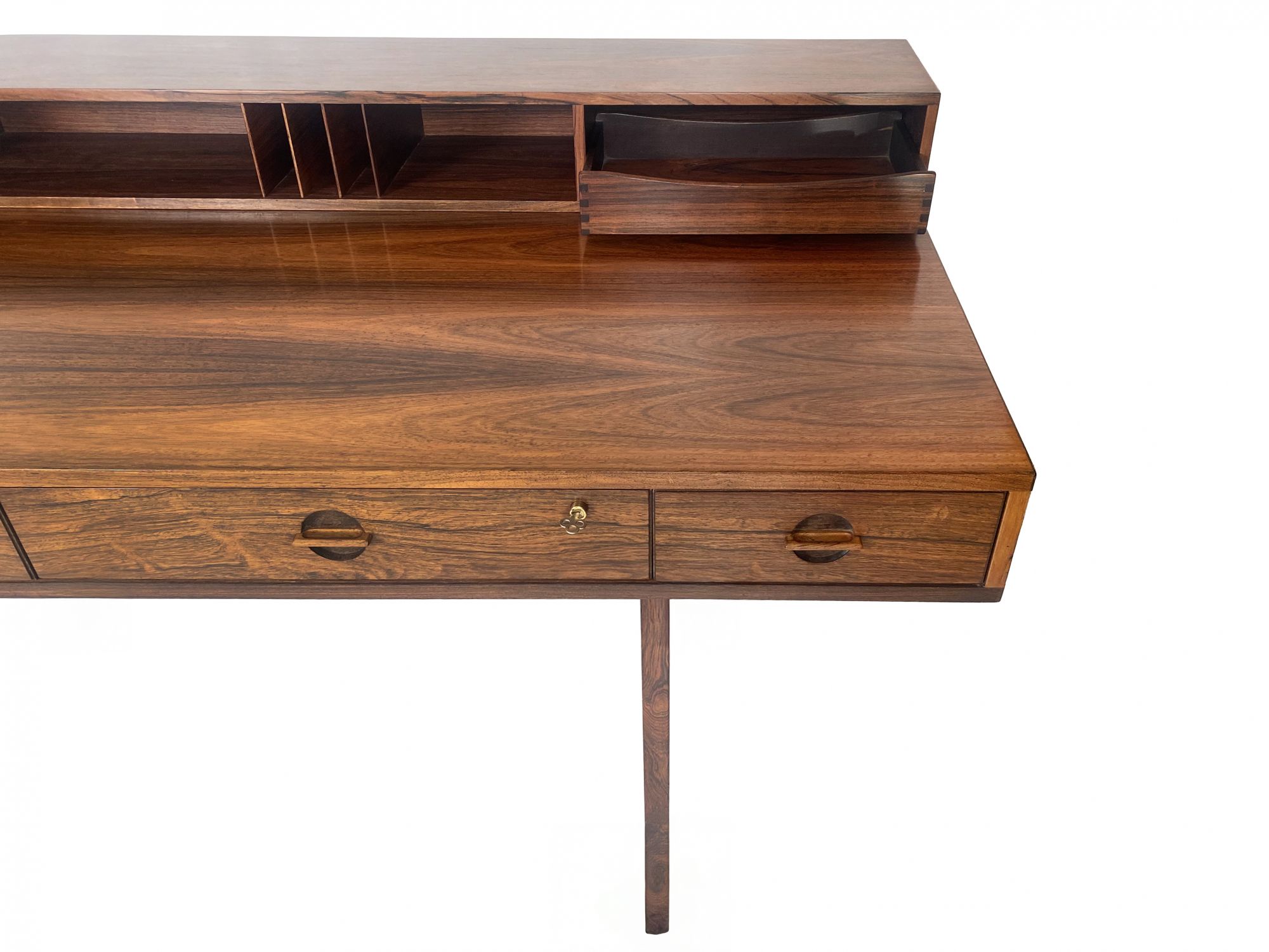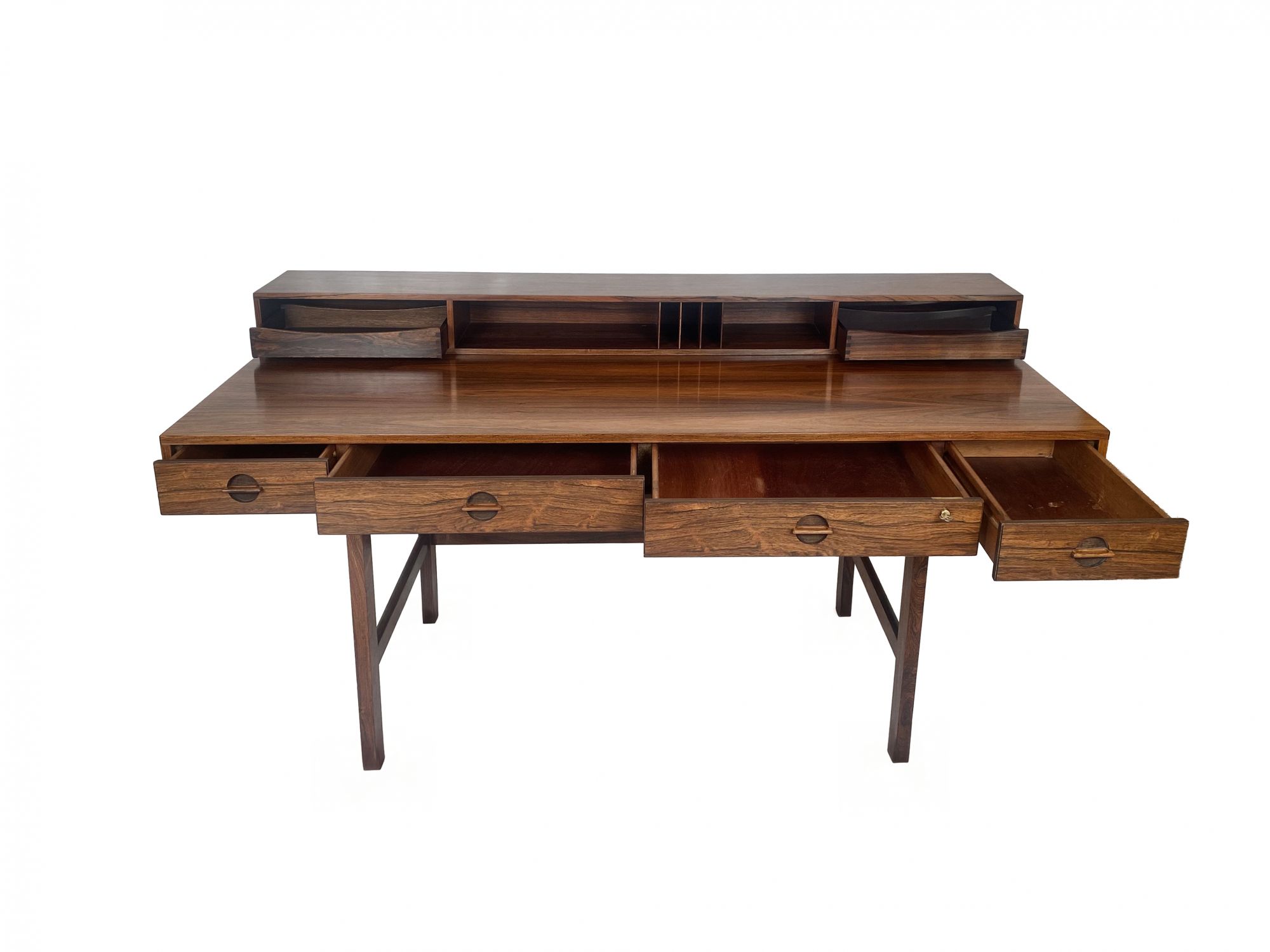 Rare desk in rosewood, designed by Peter Løvig Nielsen. Beautiful book-matched rosewood grain patterns throughout with mahogany drawer interiors. Lots of drawers and cubbyholes for storage, four drawers in main desk with nice sculpted pulls, the back side has cubby storage as well, the flip-top section retains its two pullout drawers, with exposed dovetail details, at each end of the flip-top cubby section. The flip-top is connected to the main desktop with very nice brass hinges that have been polished. When the top section is flipped the large flat area is perfect for use as a partners desk as well. The desk can also be placed in the center of a room as it is finished on all sides. Signed by maker. Key is available.