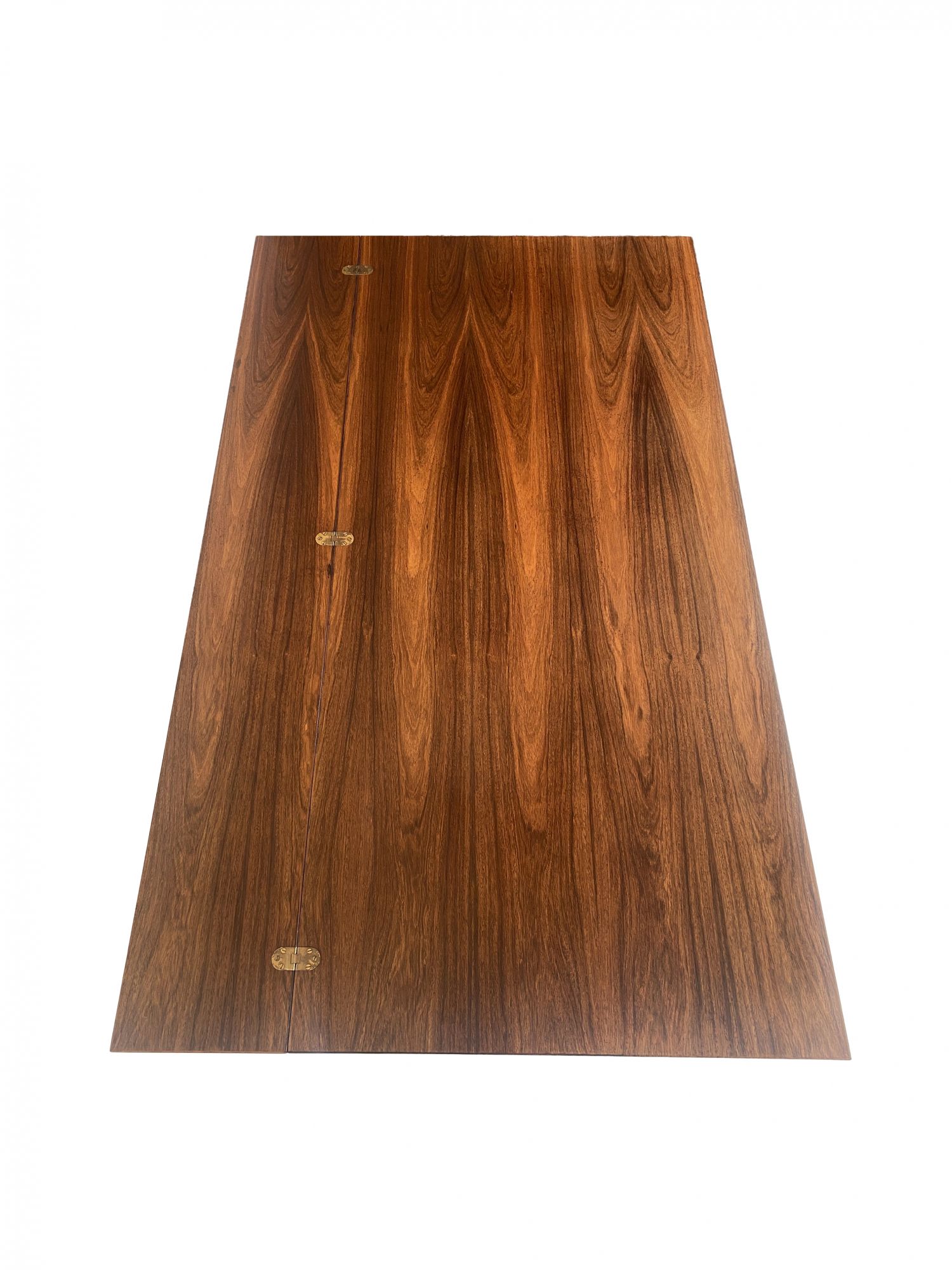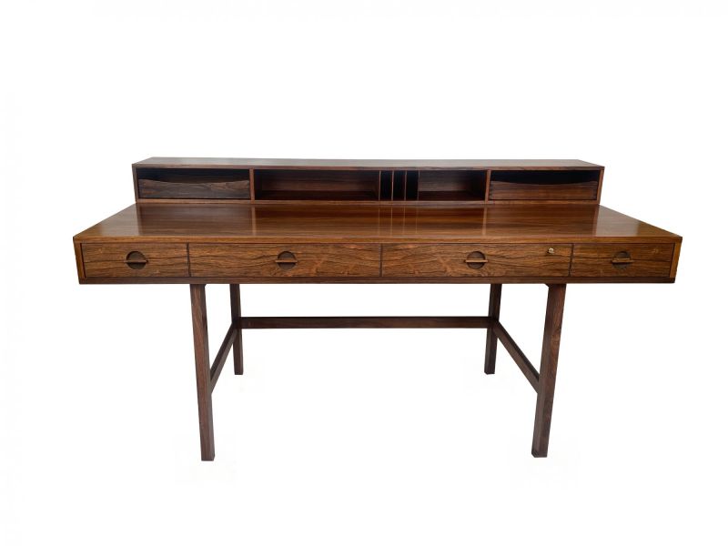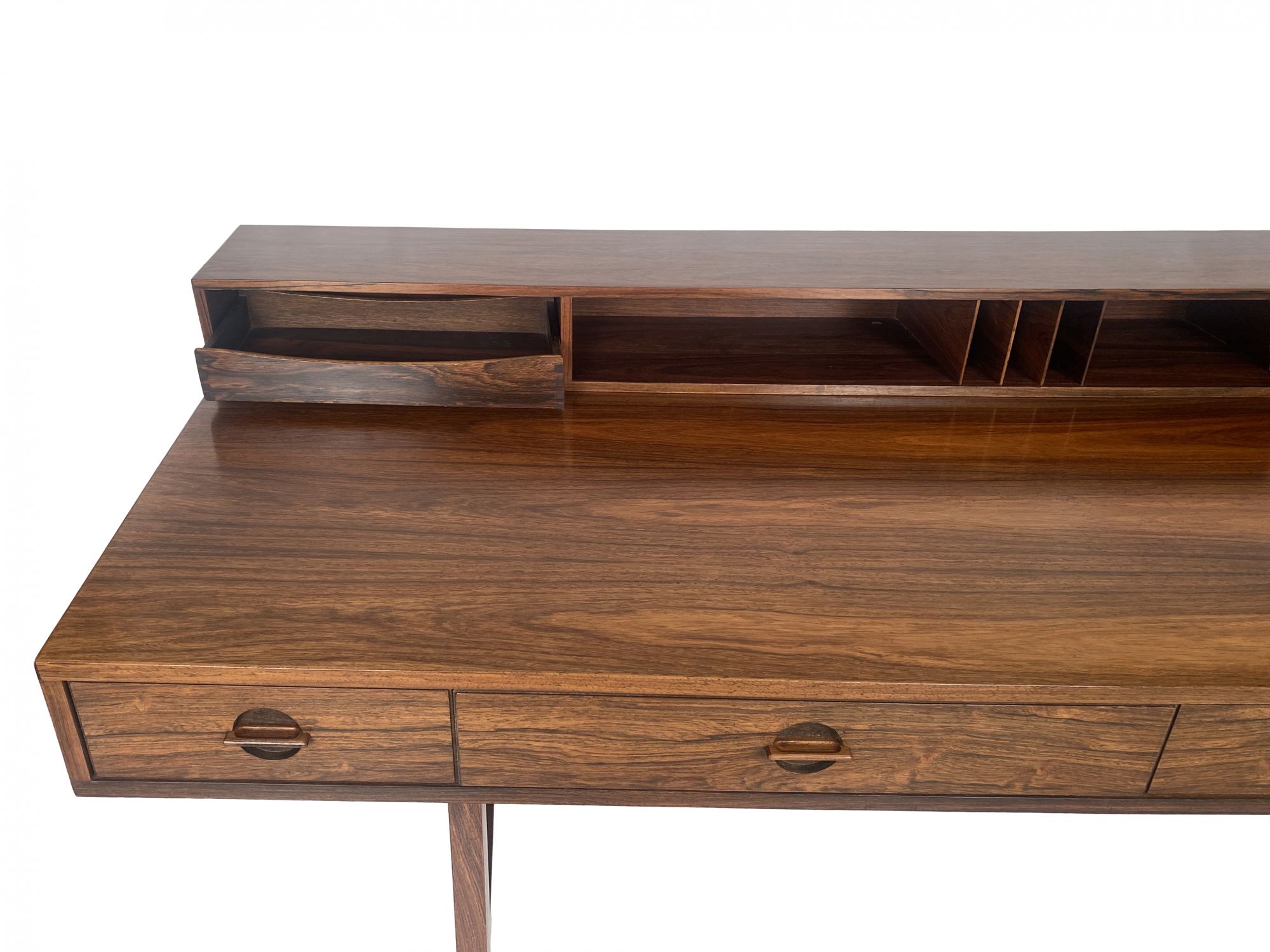 Rare desk in rosewood, designed by Peter Løvig Nielsen. Beautiful book-matched rosewood grain patterns throughout with mahogany drawer interiors. Lots of drawers and cubbyholes for storage, four drawers in main desk with nice sculpted pulls, the back side has cubby storage as well, the flip-top section retains its two pullout drawers, with exposed dovetail details, at each end of the flip-top cubby section. The flip-top is connected to the main desktop with very nice brass hinges that have been polished. When the top section is flipped the large flat area is perfect for use as a partners desk as well. The desk can also be placed in the center of a room as it is finished on all sides. Signed by maker. Key is available.