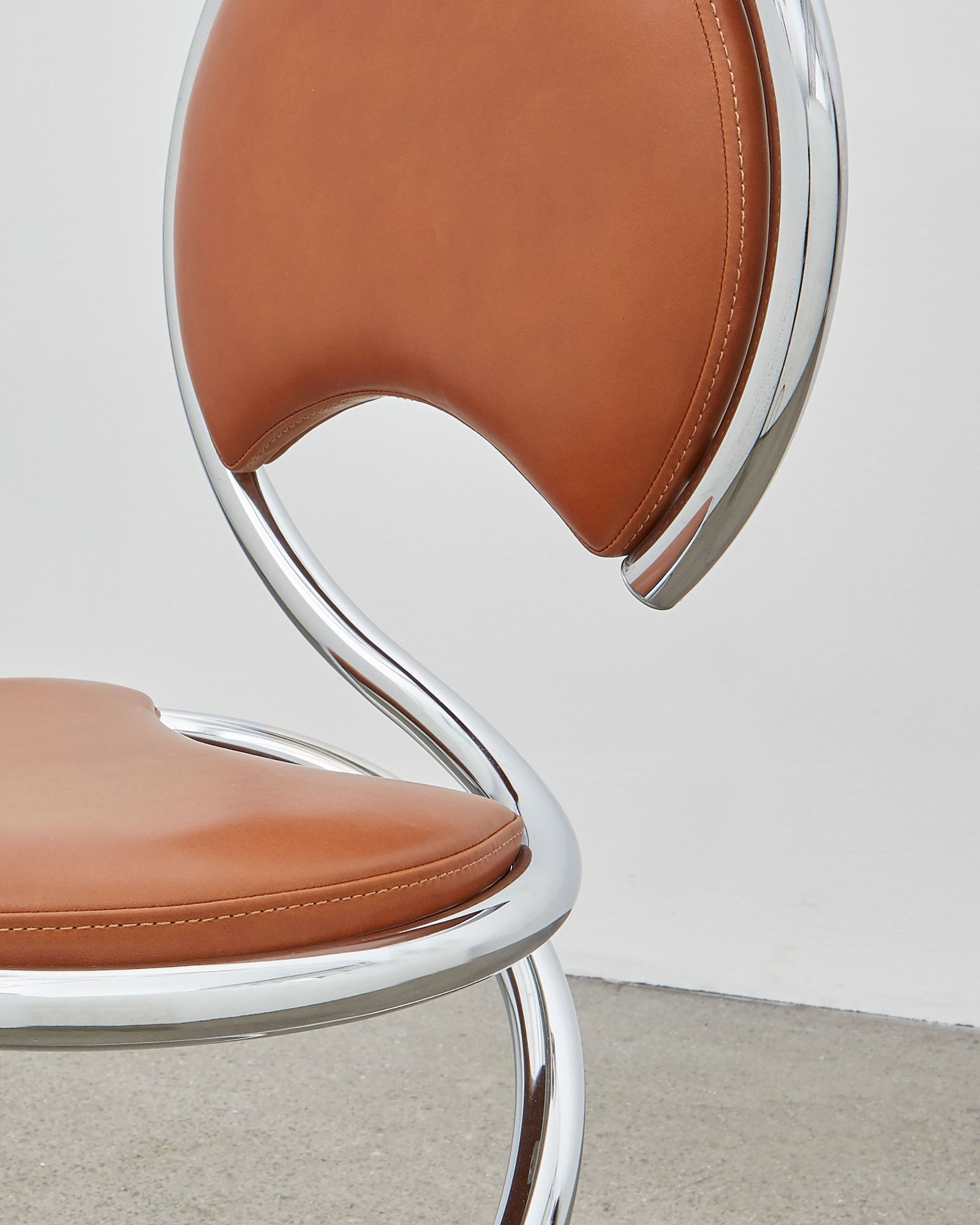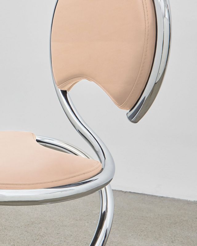 The PH Snake Chair is available in chromed steel tubes and can be ordered with two types of leather upholstery finishes: with full upholstery around the steel tubes or with the steel tubes visible highlighting the form and shapes of the unique design. The leather can be found in 5 different colors: black, mocca, indian-red, walnut and un-dyed.
