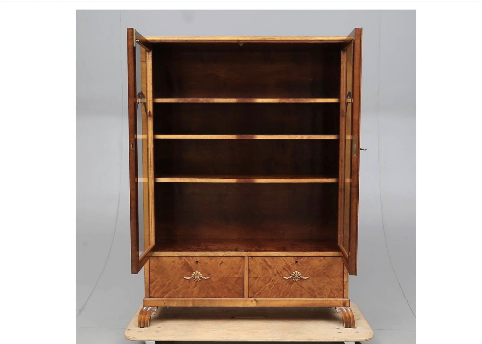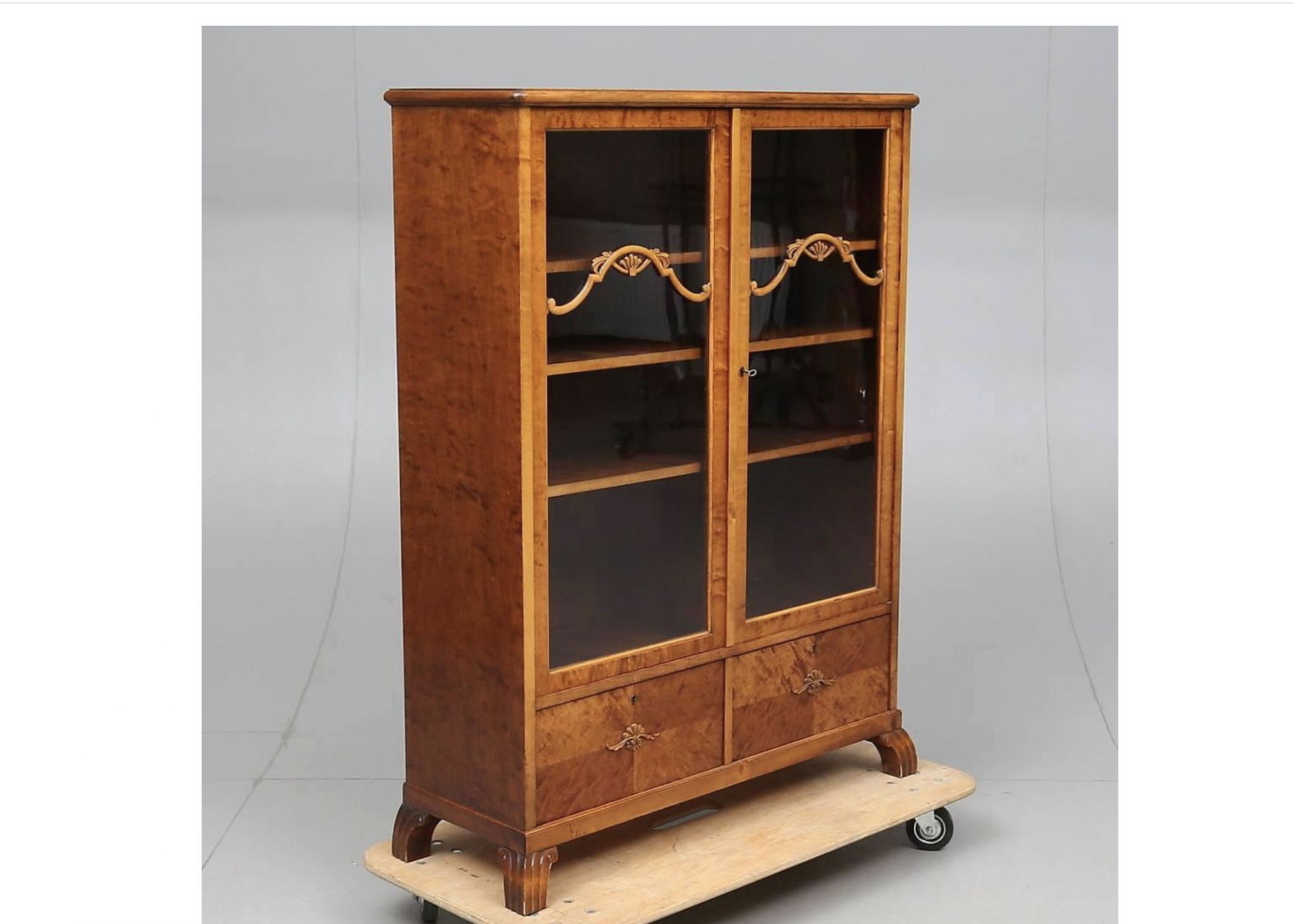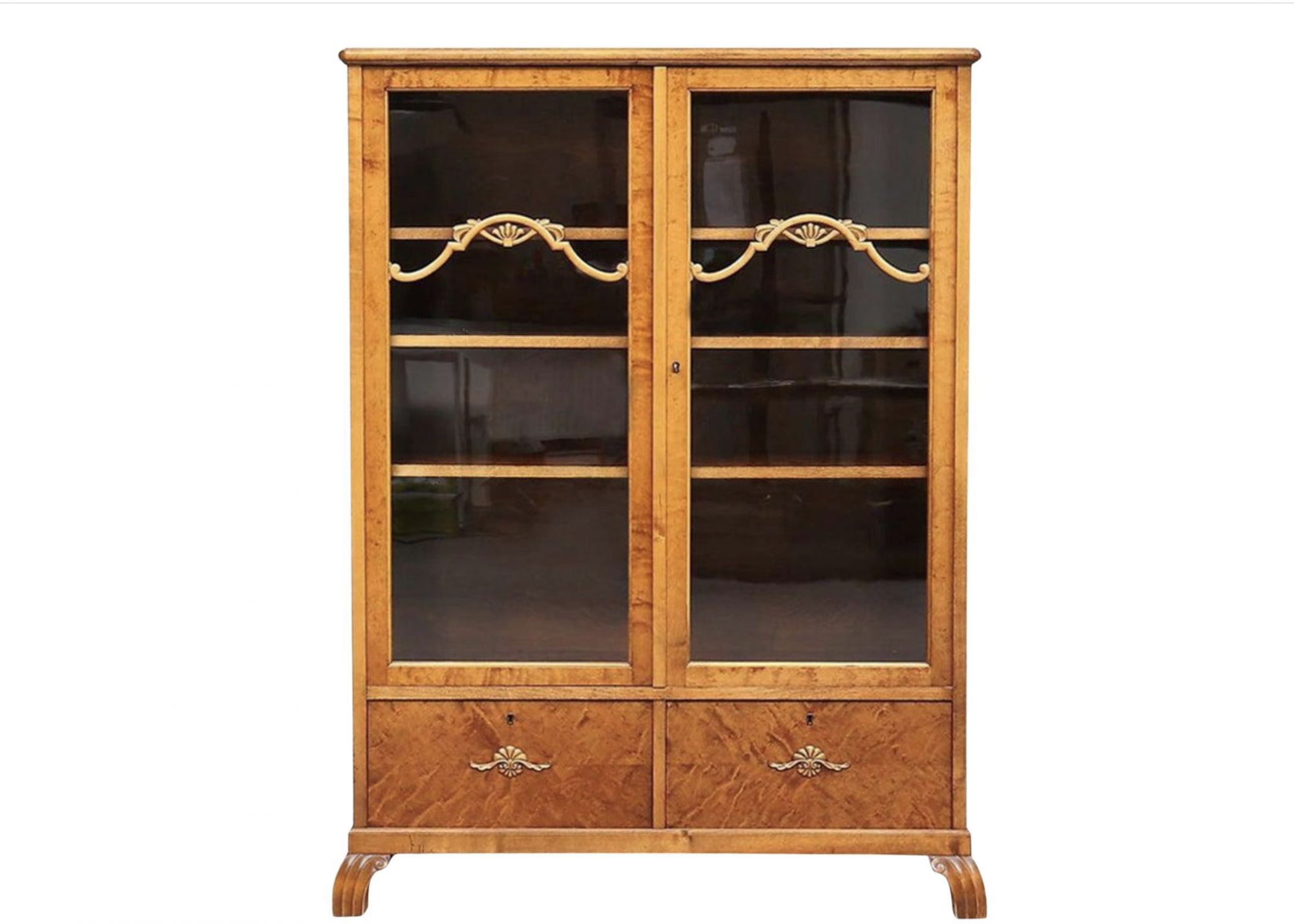 Beautiful Swedish antique Art Deco cabinet in quilted gold birch veneers with carved detailed on the glazed doors, deco feet and inlaid marquetry on the lower doors, circa 1920s.