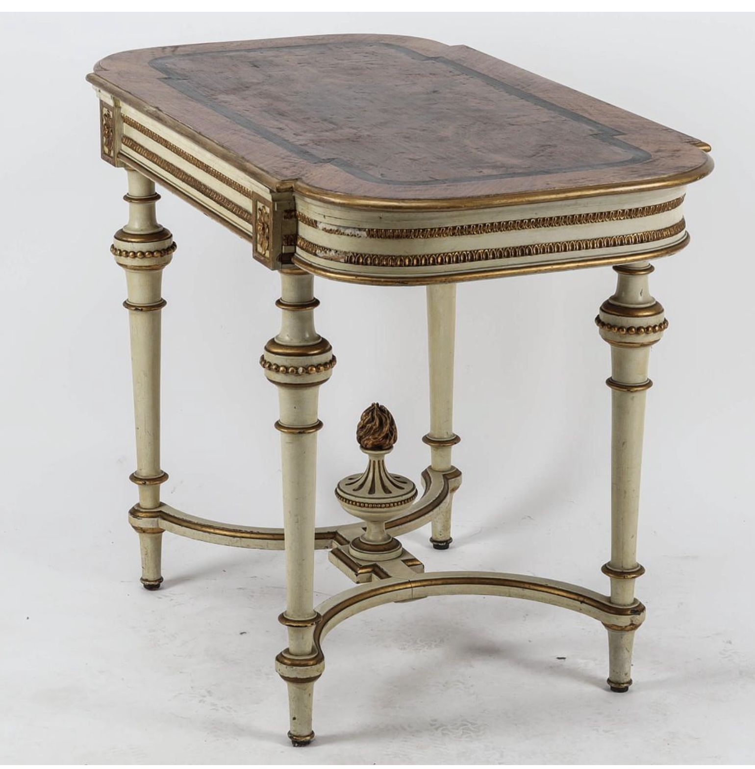 There is some small damage to the decorative side carvings and the top is a walnut veneer with an urn motif decoration on the base and lots of detailing on the legs.