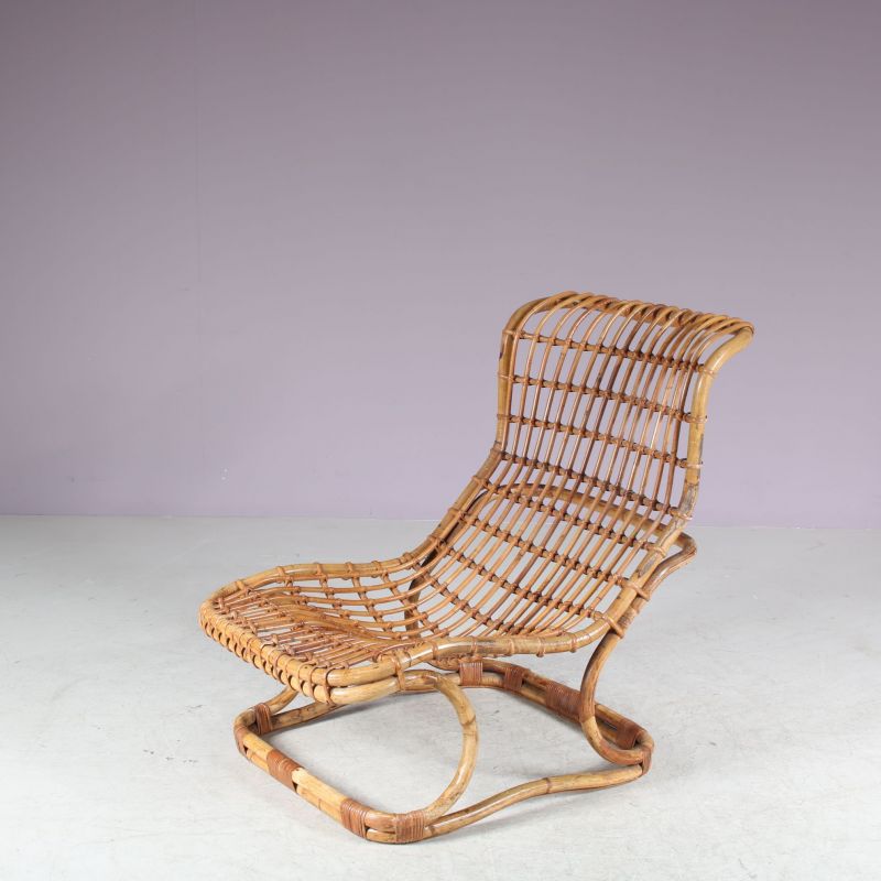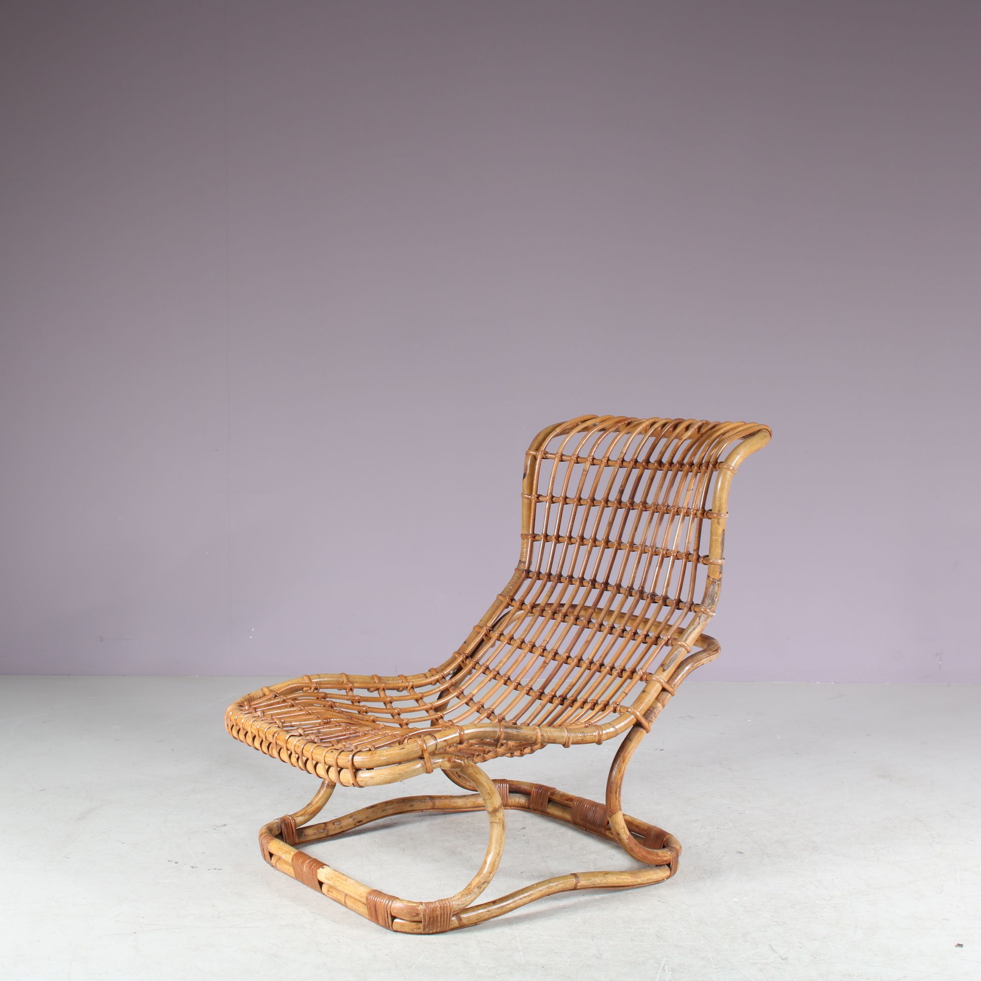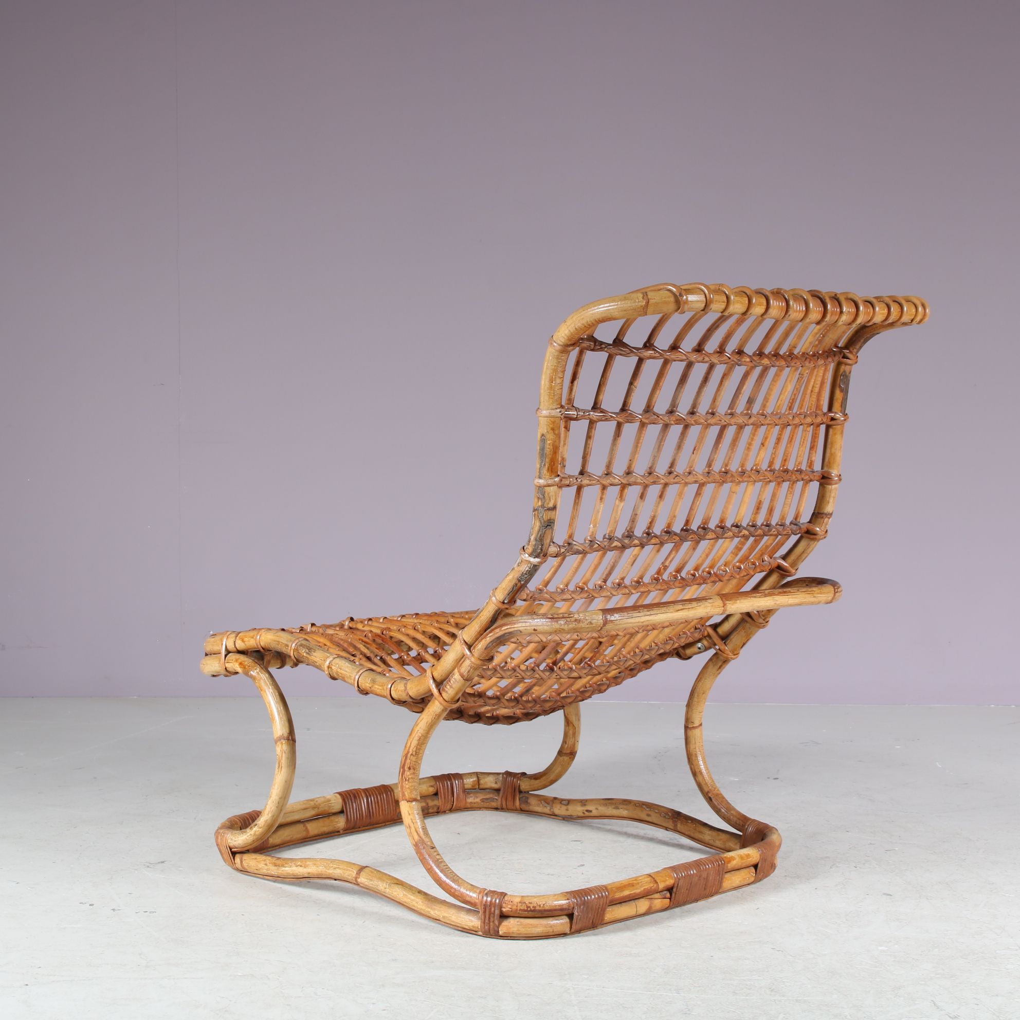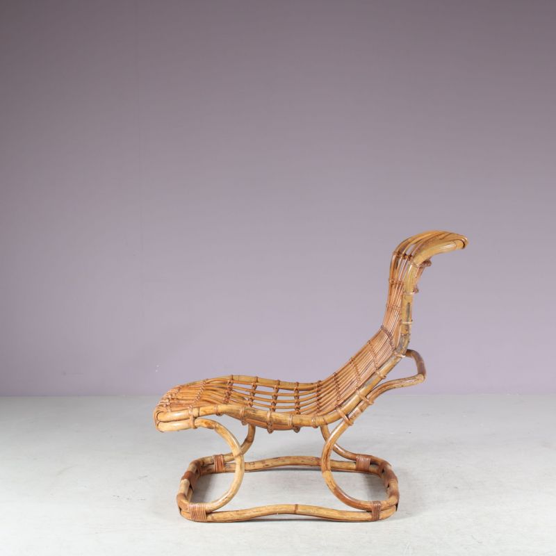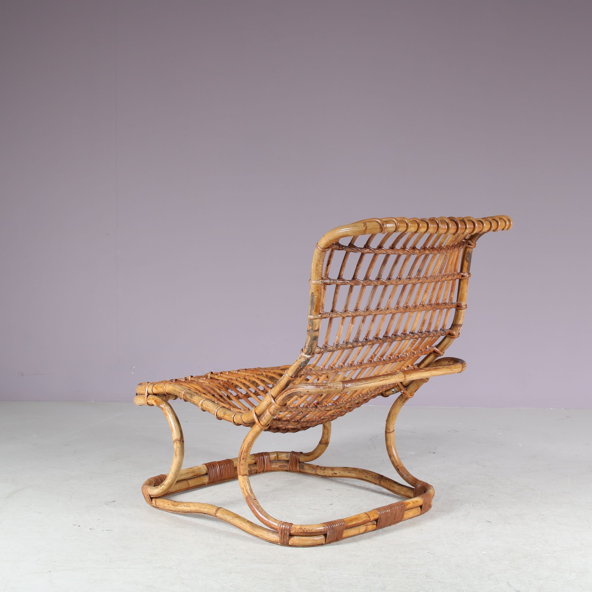 An eye-catching rattan lounge chair designed by Tito Agnoli, manufactured in Italy in the 1950s.