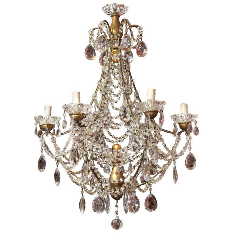 19th Century Italian Cut Crystal Beaded Gilt Iron Bird Cage Structure Chandelier