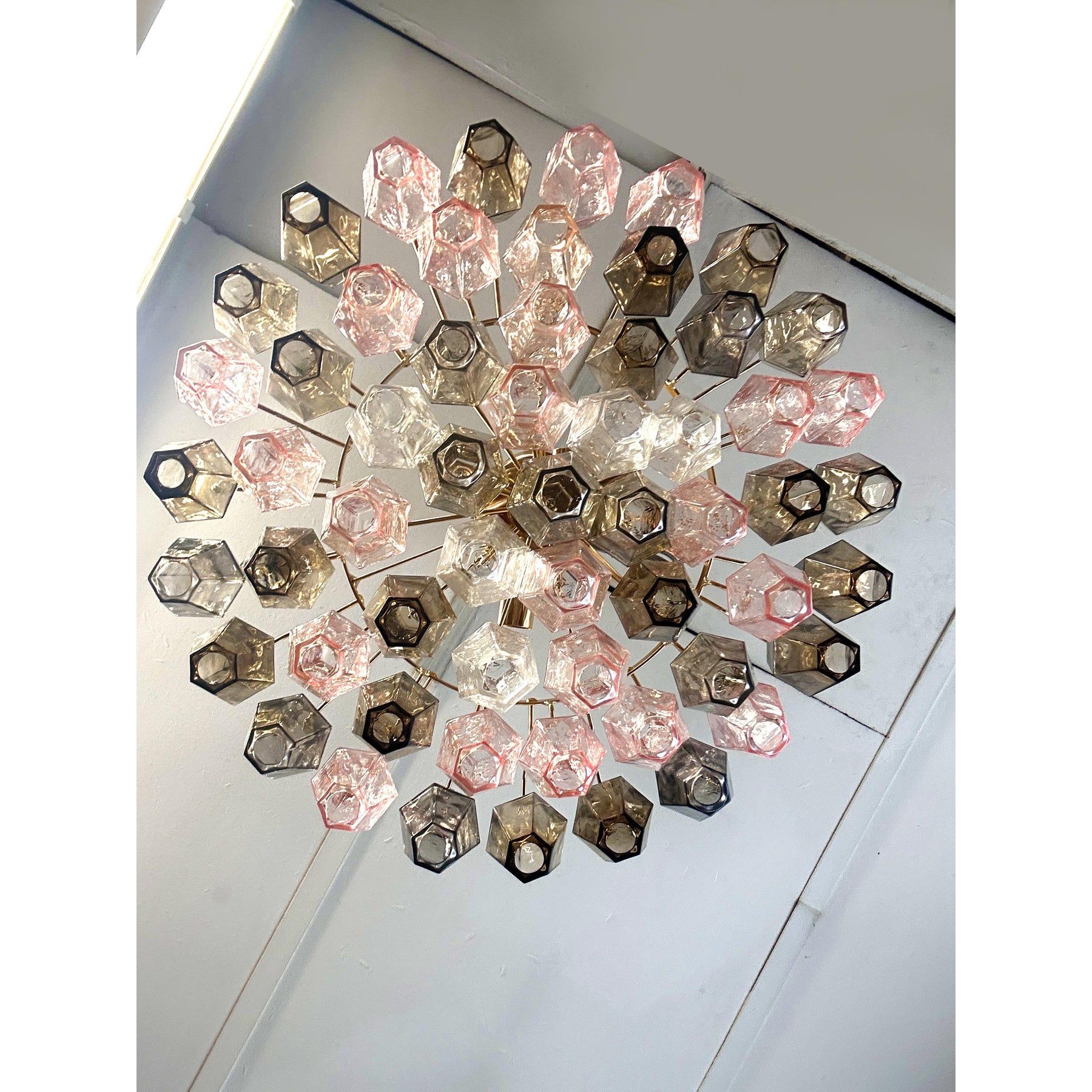 Contemporary Chandelier With Pink and Fume’ “Poliedri” Murano Glass in Venini Style
