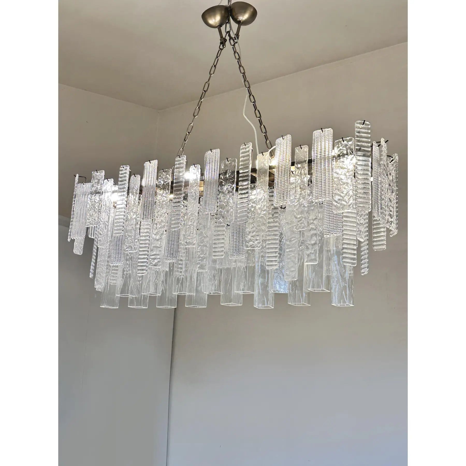 Scenographic italian hand-made chandelier with clear strip “listelli”, elements of Murano glass.