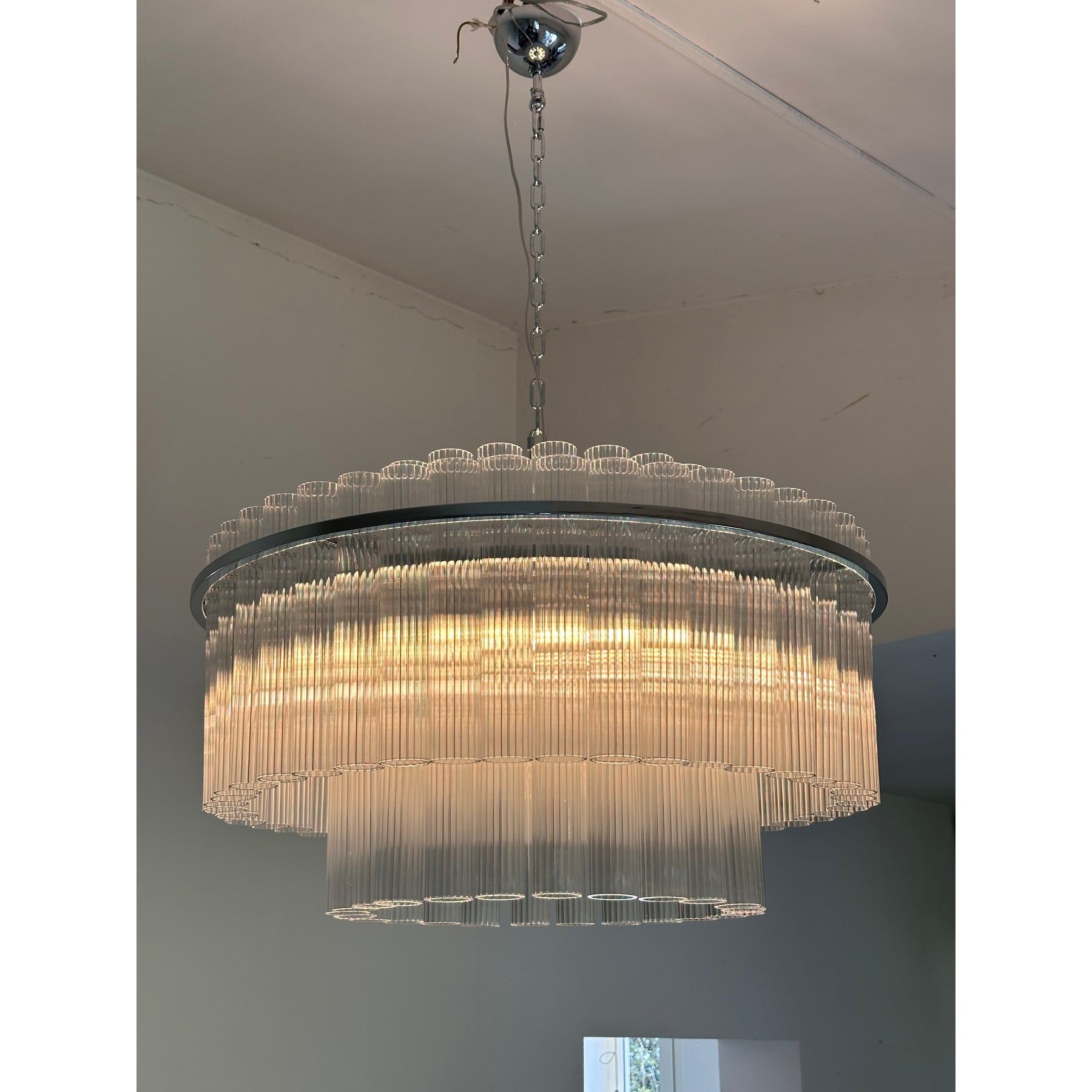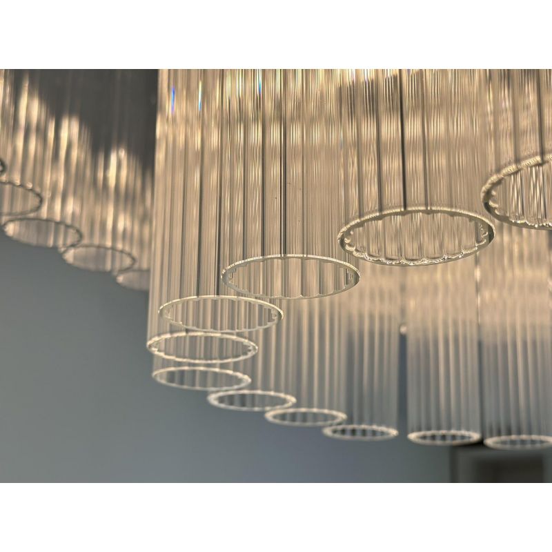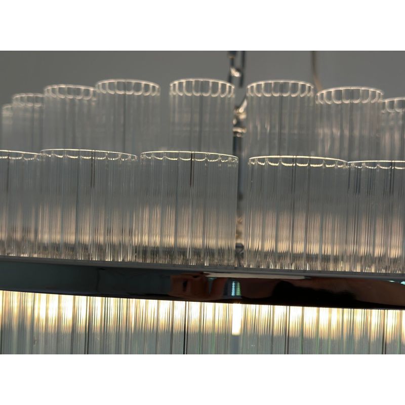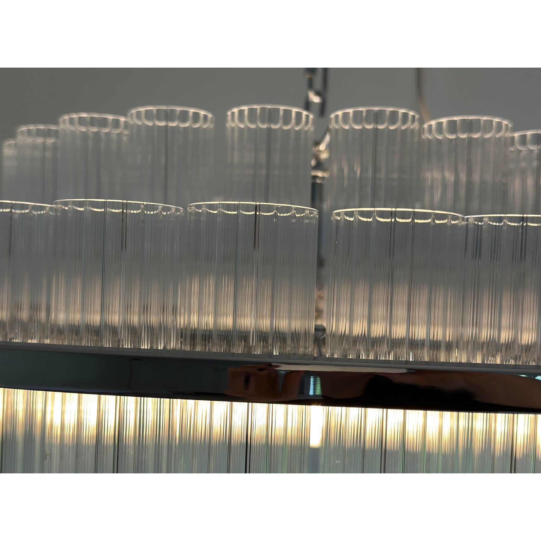 Contemporary modern chandelier with clear striped tubes in a chromed belt.