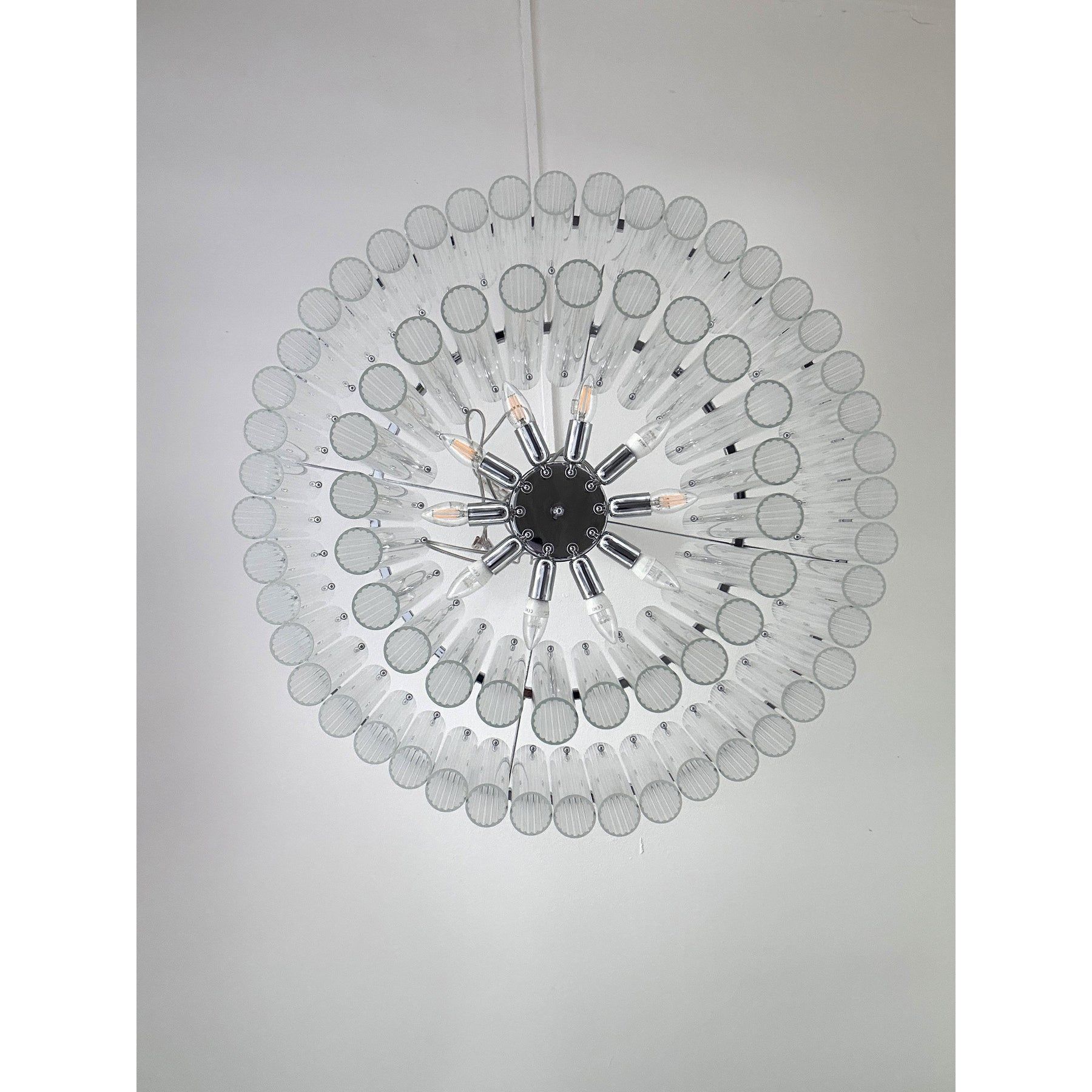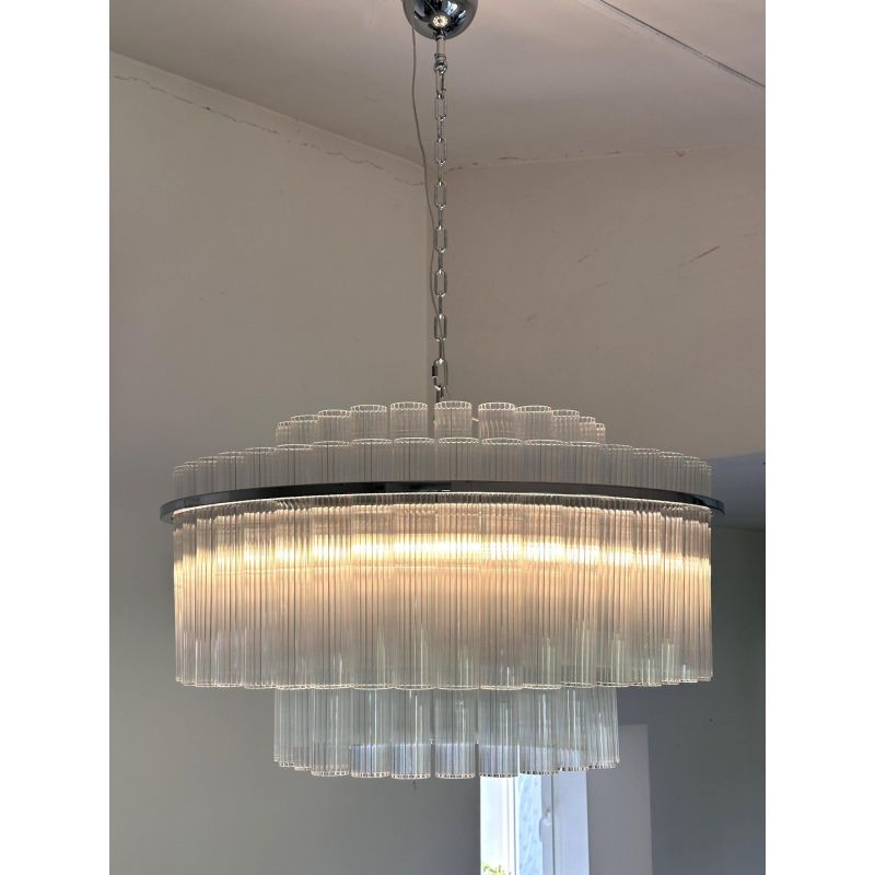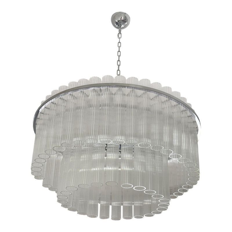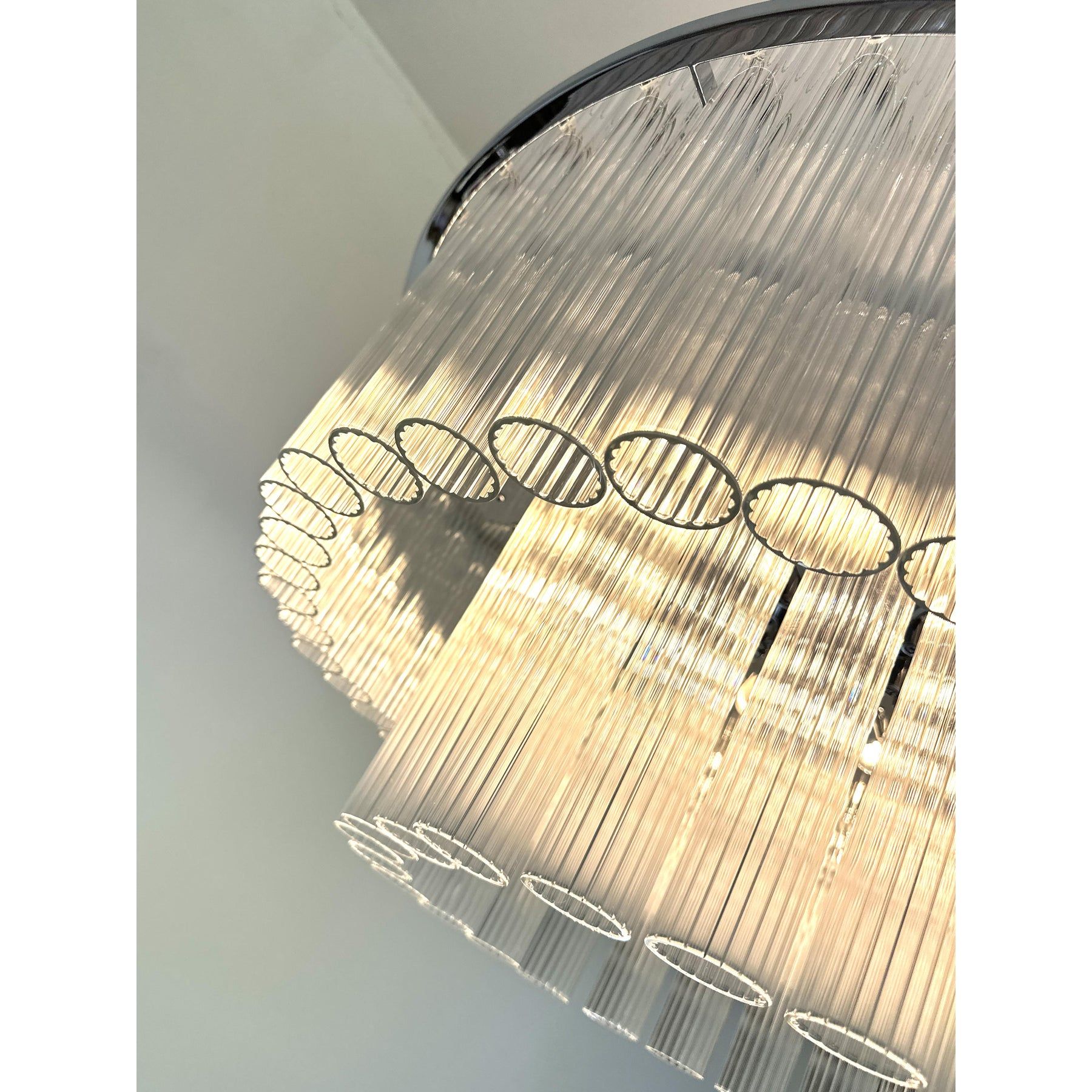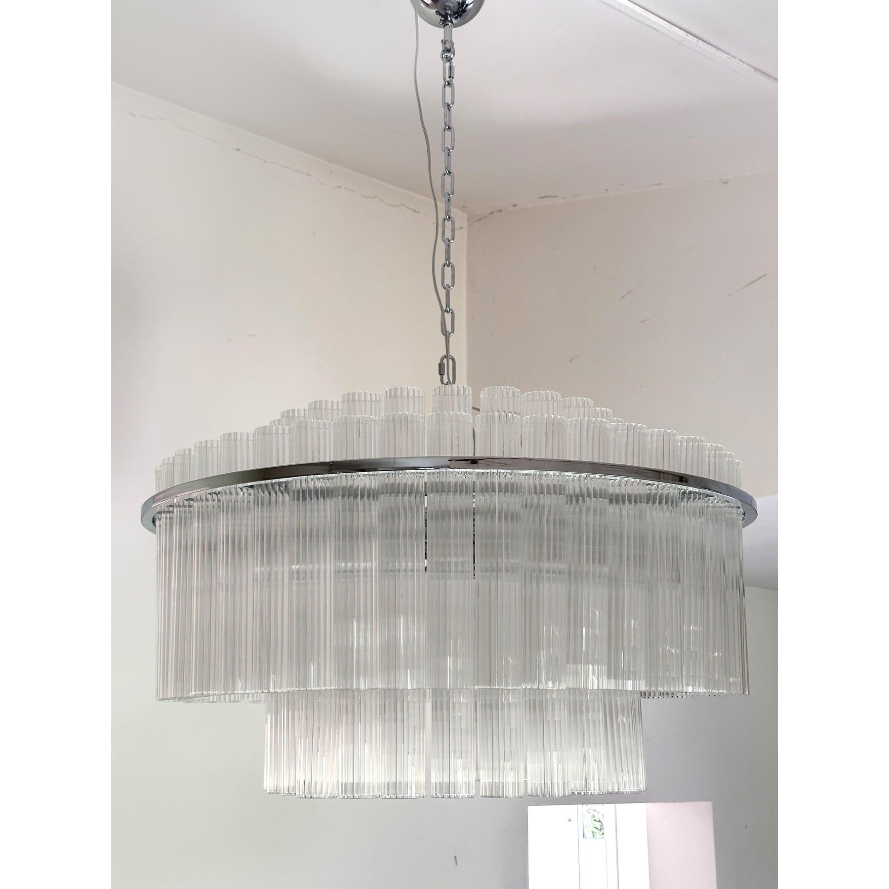 Contemporary modern chandelier with clear striped tubes in a chromed belt.