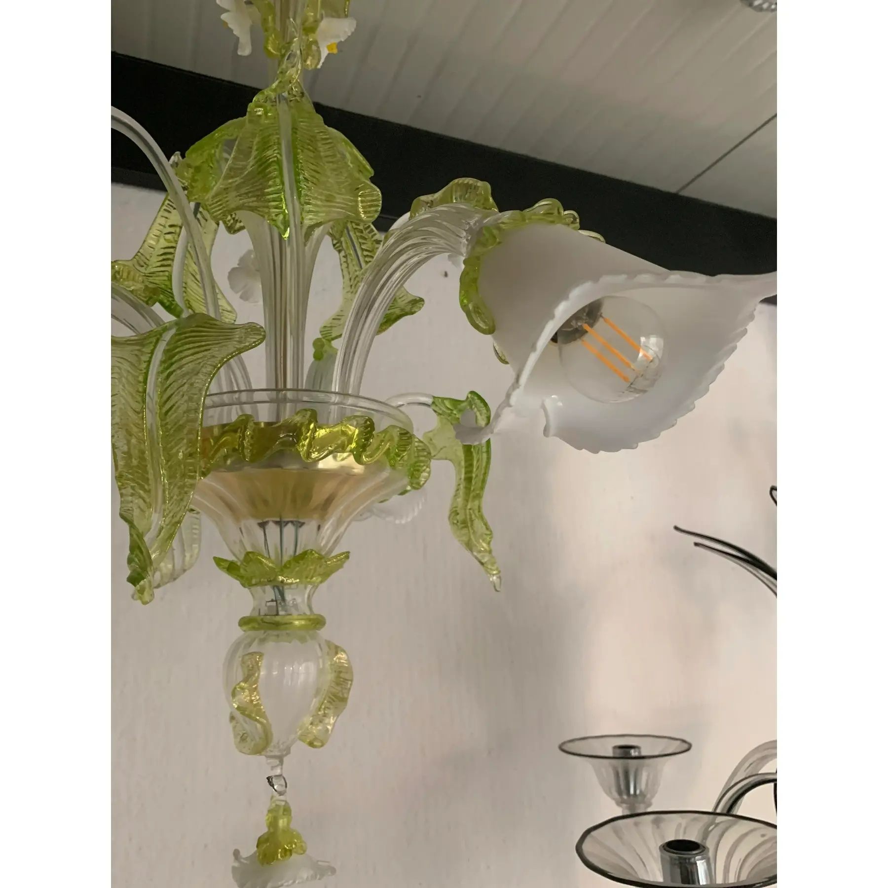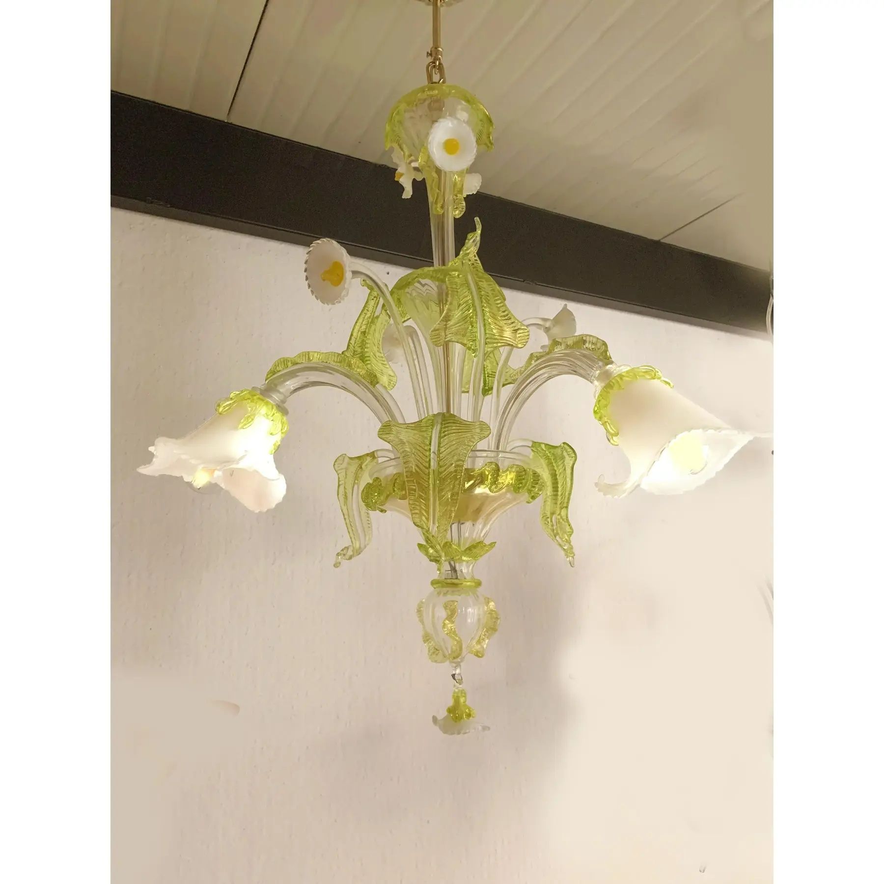Floral and Green Leaf Milky “Calle” Glass Chandelier