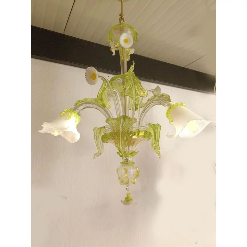 Classical Murano glass chandelier in transparent "rigadin" arms and floral decoration of green leaved and milky "calle".